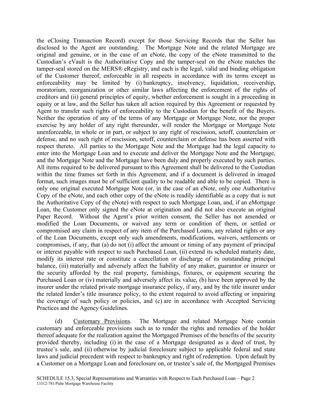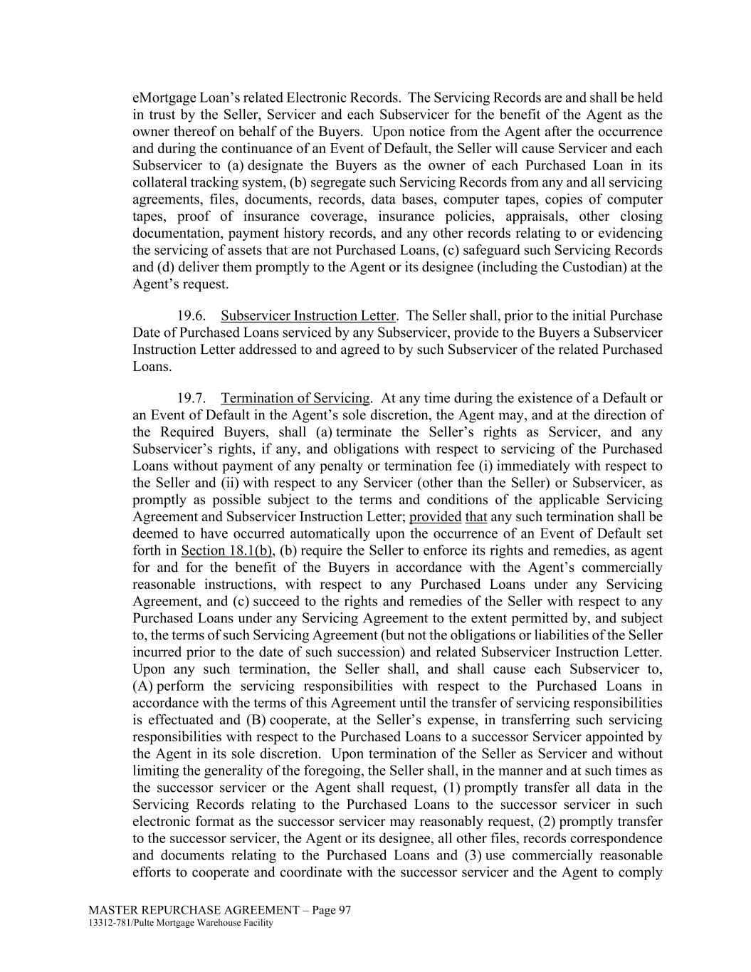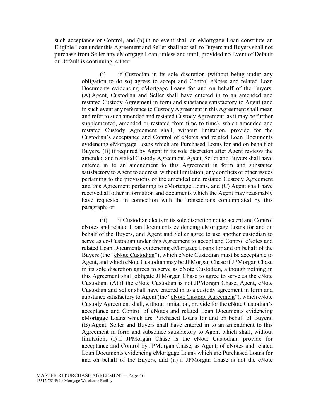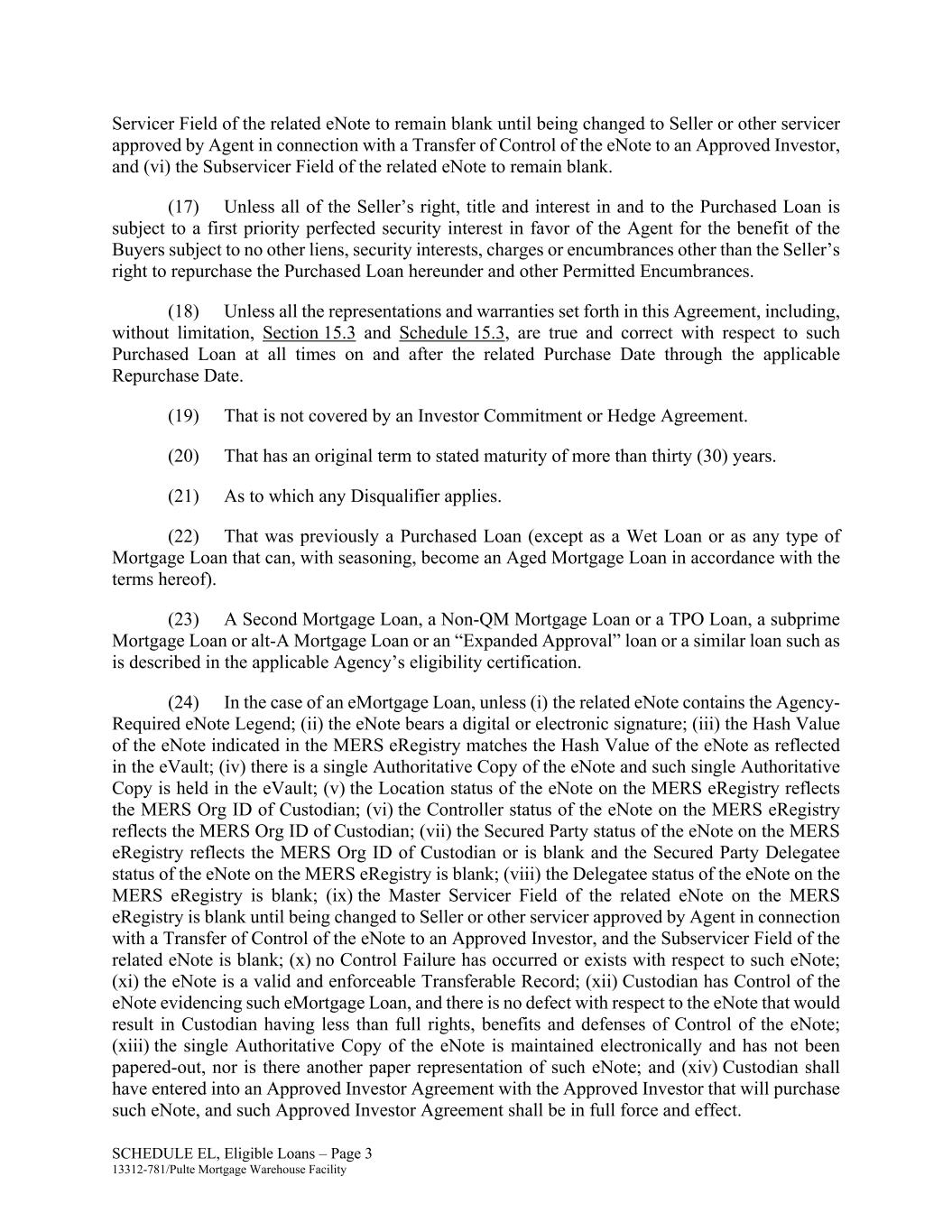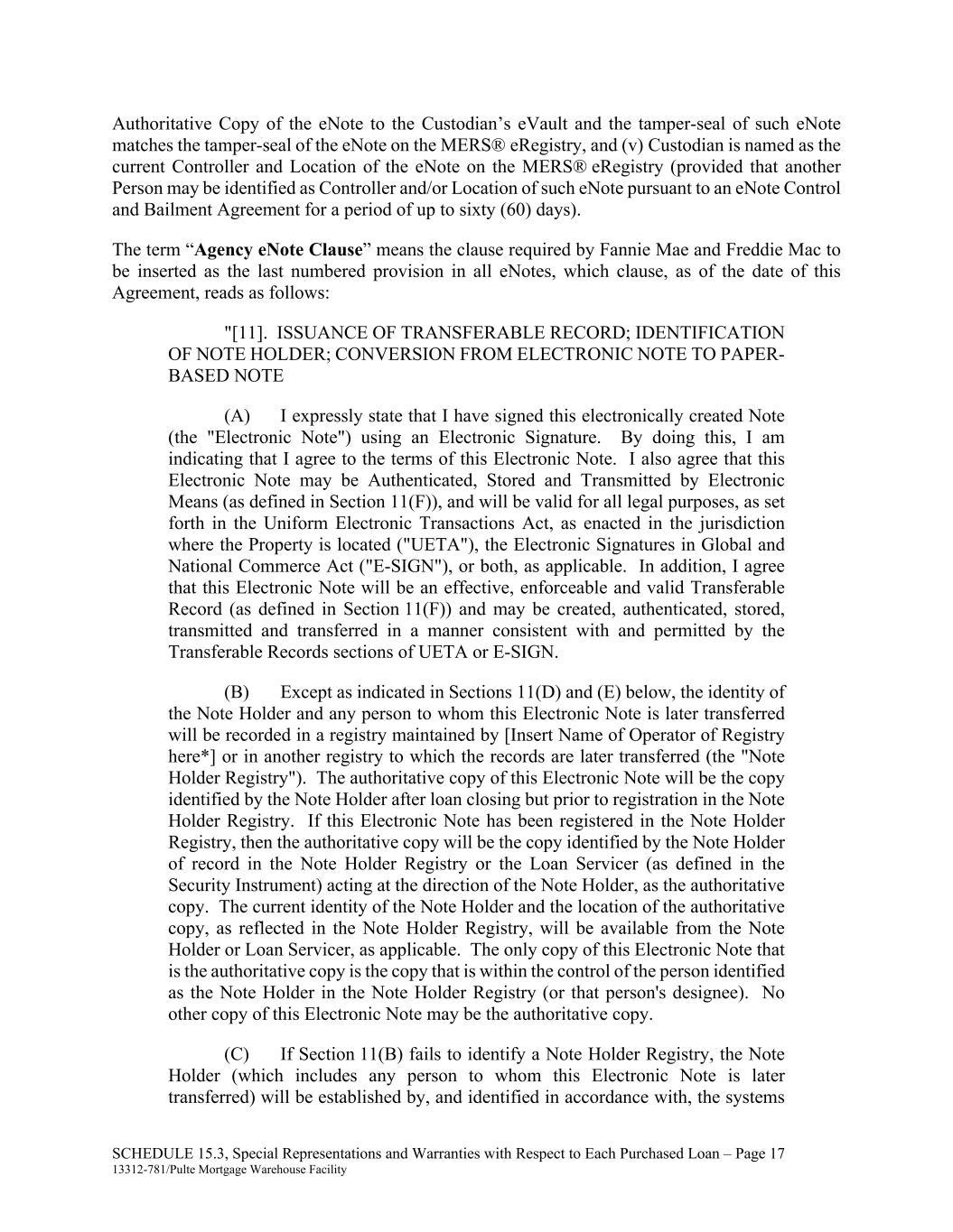 MASTER REPURCHASE AGREEMENT – Page 12 13312-781/Pulte Mortgage Warehouse Facility required to be maintained pursuant to Agency Guidelines and required to demonstrate compliance with all applicable Legal Requirements. An eClosing Transaction Record shall include systems logs and audit trails that establish a temporal and process link between the presentation of identity documents and the electronic signing of each eNote and Electronic Record, together with identifying information that can be used to verify the Electronic Signature and its attribution to the signer's identity, and evidence of the signer's agreement to conduct the transaction electronically and the signer's execution of each electronic signature. “Effective Date” means August 16, 2023. “Electronic Agent” means MERSCORP Holdings, Inc., or its successor in interest or assigns. “Electronic Record” means an “electronic record” as defined in Section 2 of UETA or Section 7006 of E-SIGN, as applicable, and with respect to an eMortgage Loan, the related eNote and all other documents comprising the File electronically created and that are stored in an electronic format and bearing an “electronic signature” as such term is defined in E-SIGN, if any. “Electronic Tracking Agreement” means one (1) or more Electronic Tracking Agreements with respect to (i) the tracking of changes in the ownership, mortgage servicers and servicing rights ownership of Mortgage Loans held on the MERS System, and (ii) the tracking of the Control of eNotes held on the MERS eRegistry, each in a form acceptable to Seller and Agent, as the same may be amended (including by an Addendum to Electronic Tracking Agreement for eNotes), restated, supplemented or otherwise modified from time to time. “Electronic Transmission” means each document, instruction, authorization, file, information and any other communication transmitted, posted or otherwise made or communicated by e-mail or E-Fax, or otherwise to or from an E-System or other equivalent service. “Eligible Assignee” means (a) a Buyer; (b) a Buyer Affiliate; or (c) any other Person (other than a natural person) approved by the (i) Agent and Swing Line Buyer, and (ii) unless an Event of Default has occurred and is continuing, the Seller (each such approval not to be unreasonably withheld or delayed); provided that (x) notwithstanding the foregoing, “Eligible Assignee” shall not include any natural person, the Seller, or any of the Seller’s Affiliates or Subsidiaries, (y) no assignment shall be made to a Defaulting Buyer (or a Person who would be a Defaulting Buyer if such Person was a Buyer hereunder) without the consent of Agent and Seller; and (z) that notwithstanding clause (c)(ii) of this definition, so long as no Event of Default has occurred and is continuing, no assignment shall be made to a Competitor without the consent of the Seller, which consent may be withheld in its sole discretion. “Eligible Loans” is defined on Schedule EL. “eMortgage Loan” means a Mortgage Loan evidenced by an eNote and as to which some or all of the other documents comprising the related mortgage file may be created electronically and not by traditional paper documentation with a pen and ink signature.