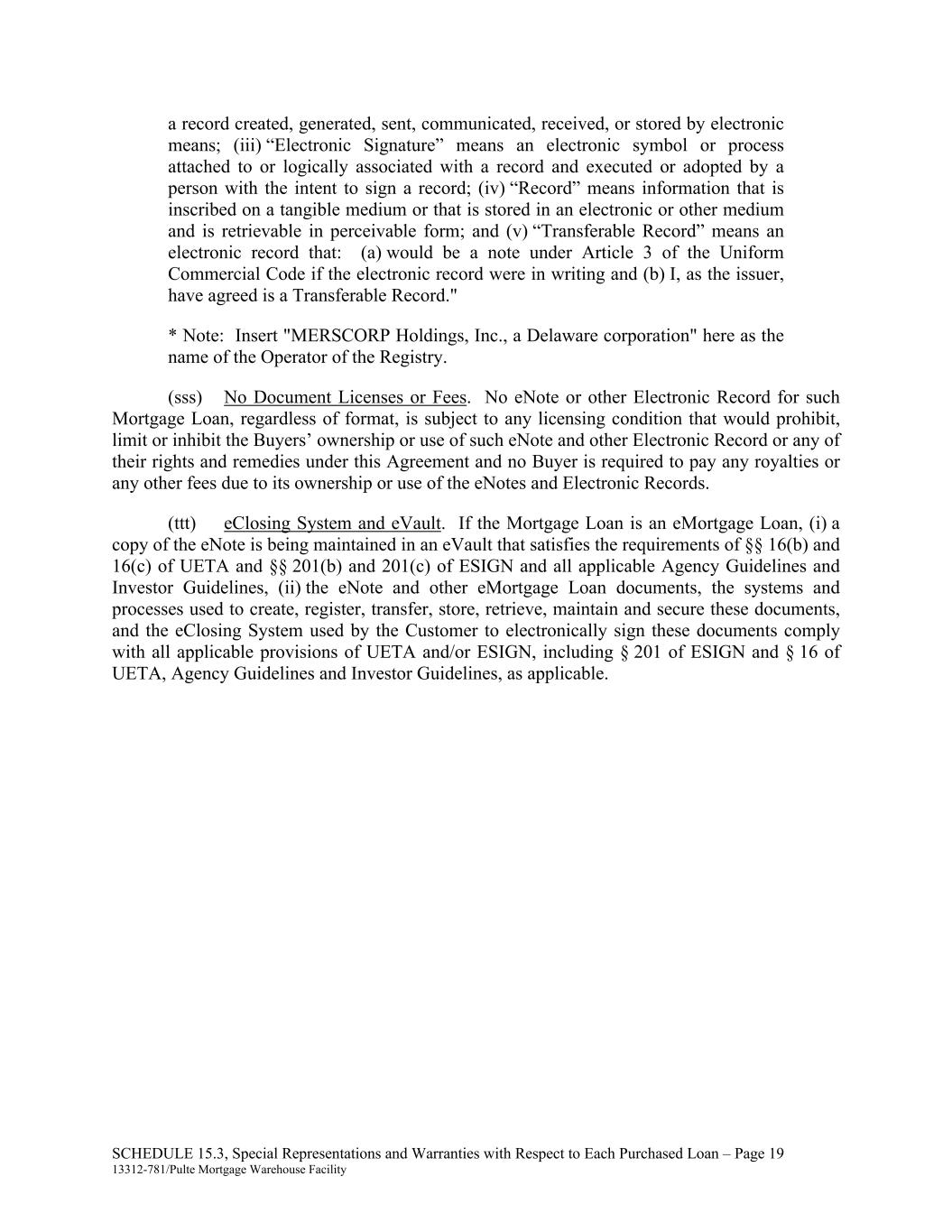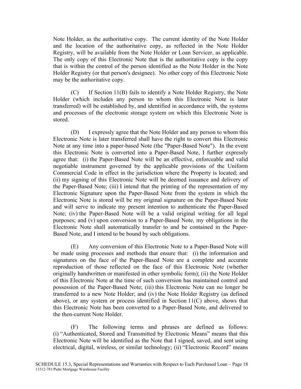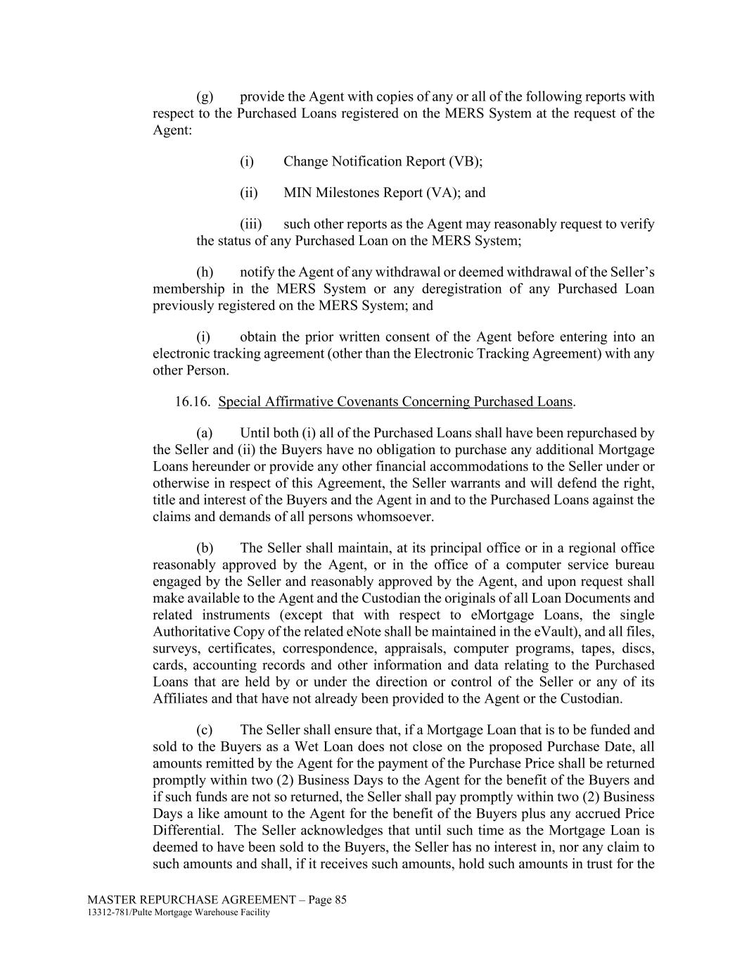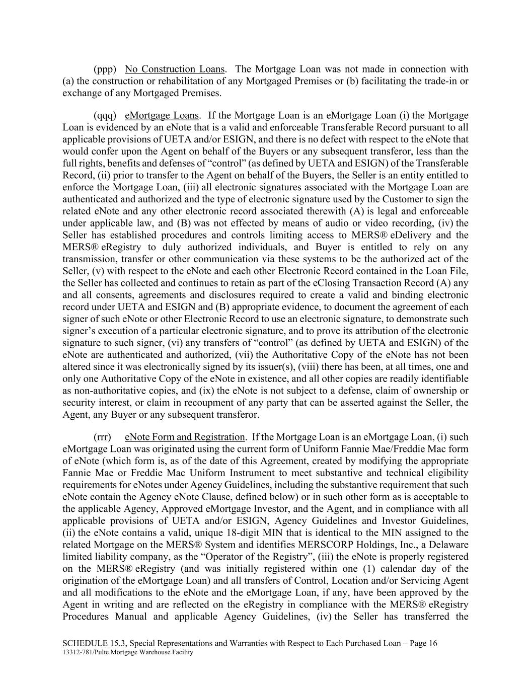 MASTER REPURCHASE AGREEMENT – Page 12 13312-781/Pulte Mortgage Warehouse Facility required to be maintained pursuant to Agency Guidelines and required to demonstrate compliance with all applicable Legal Requirements. An eClosing Transaction Record shall include systems logs and audit trails that establish a temporal and process link between the presentation of identity documents and the electronic signing of each eNote and Electronic Record, together with identifying information that can be used to verify the Electronic Signature and its attribution to the signer's identity, and evidence of the signer's agreement to conduct the transaction electronically and the signer's execution of each electronic signature. “Effective Date” means August 16, 2023. “Electronic Agent” means MERSCORP Holdings, Inc., or its successor in interest or assigns. “Electronic Record” means an “electronic record” as defined in Section 2 of UETA or Section 7006 of E-SIGN, as applicable, and with respect to an eMortgage Loan, the related eNote and all other documents comprising the File electronically created and that are stored in an electronic format and bearing an “electronic signature” as such term is defined in E-SIGN, if any. “Electronic Tracking Agreement” means one (1) or more Electronic Tracking Agreements with respect to (i) the tracking of changes in the ownership, mortgage servicers and servicing rights ownership of Mortgage Loans held on the MERS System, and (ii) the tracking of the Control of eNotes held on the MERS eRegistry, each in a form acceptable to Seller and Agent, as the same may be amended (including by an Addendum to Electronic Tracking Agreement for eNotes), restated, supplemented or otherwise modified from time to time. “Electronic Transmission” means each document, instruction, authorization, file, information and any other communication transmitted, posted or otherwise made or communicated by e-mail or E-Fax, or otherwise to or from an E-System or other equivalent service. “Eligible Assignee” means (a) a Buyer; (b) a Buyer Affiliate; or (c) any other Person (other than a natural person) approved by the (i) Agent and Swing Line Buyer, and (ii) unless an Event of Default has occurred and is continuing, the Seller (each such approval not to be unreasonably withheld or delayed); provided that (x) notwithstanding the foregoing, “Eligible Assignee” shall not include any natural person, the Seller, or any of the Seller’s Affiliates or Subsidiaries, (y) no assignment shall be made to a Defaulting Buyer (or a Person who would be a Defaulting Buyer if such Person was a Buyer hereunder) without the consent of Agent and Seller; and (z) that notwithstanding clause (c)(ii) of this definition, so long as no Event of Default has occurred and is continuing, no assignment shall be made to a Competitor without the consent of the Seller, which consent may be withheld in its sole discretion. “Eligible Loans” is defined on Schedule EL. “eMortgage Loan” means a Mortgage Loan evidenced by an eNote and as to which some or all of the other documents comprising the related mortgage file may be created electronically and not by traditional paper documentation with a pen and ink signature.