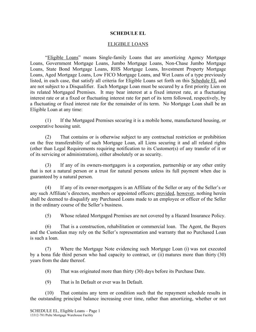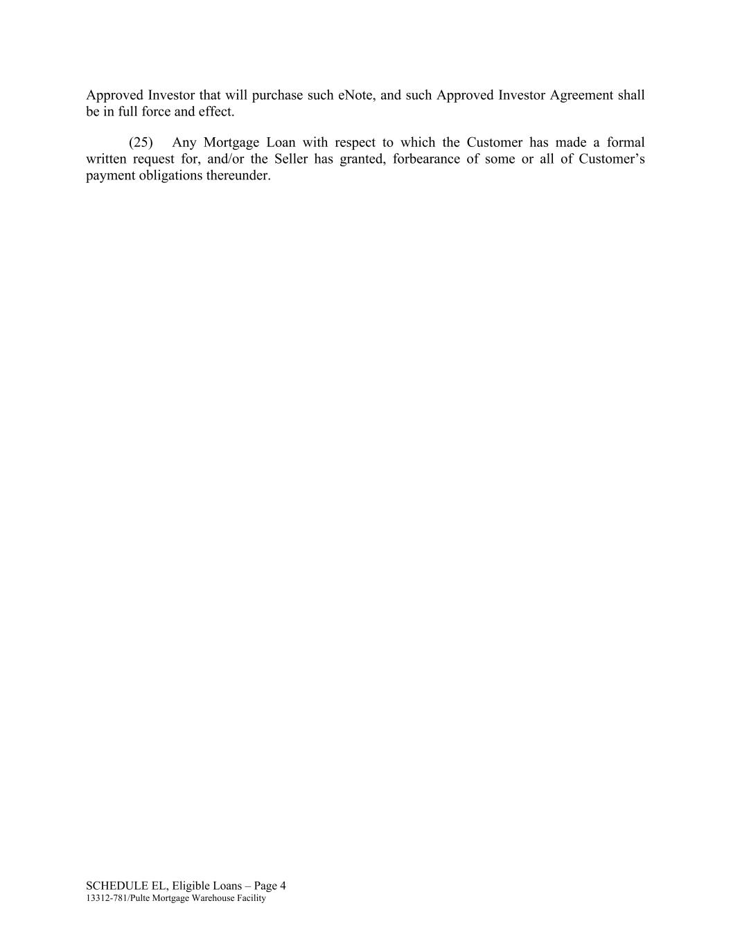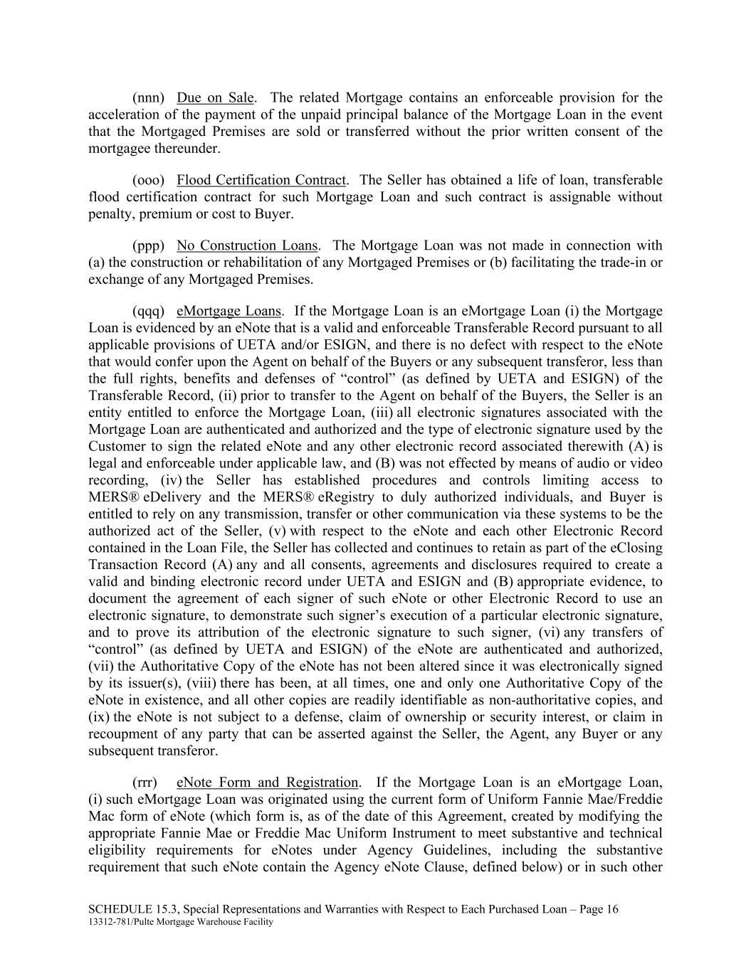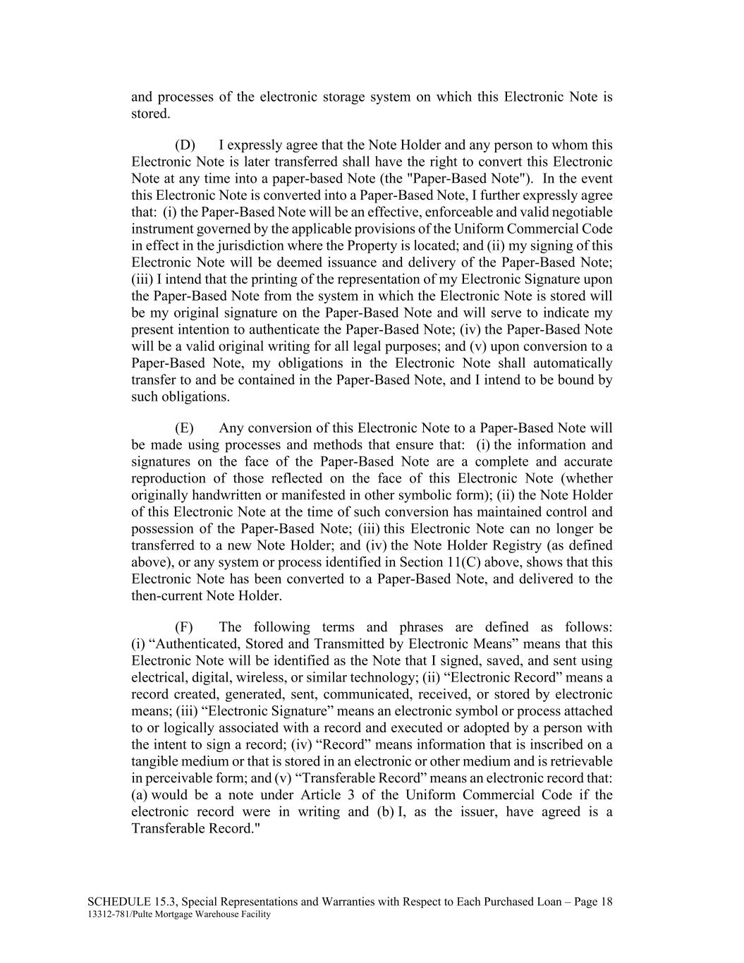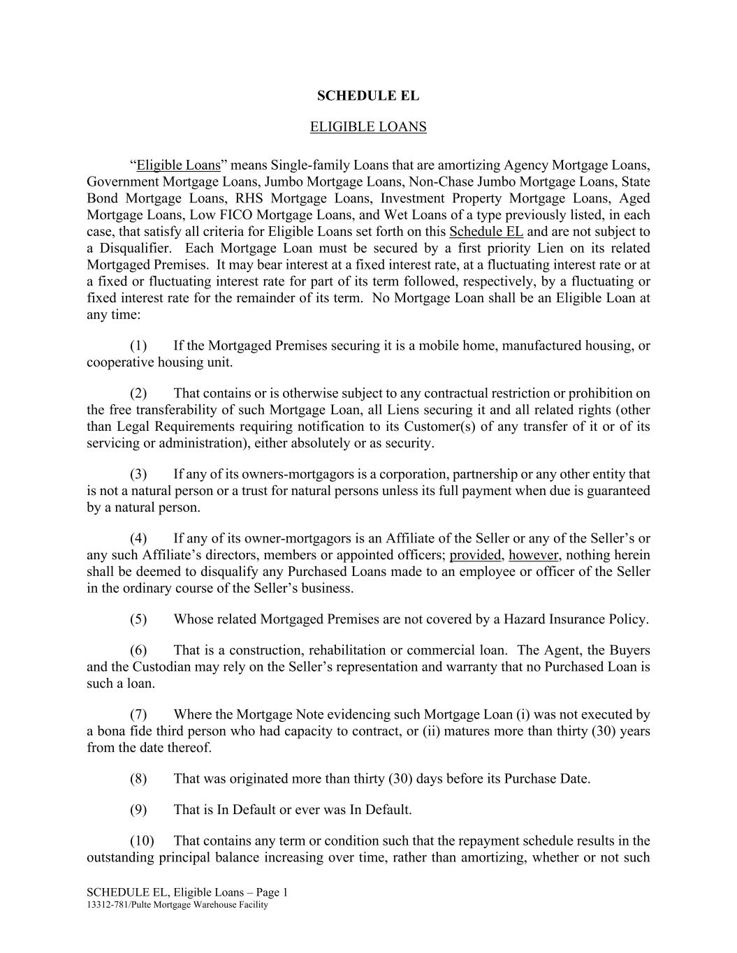 MASTER REPURCHASE AGREEMENT – Page 12 13312-781/Pulte Mortgage Warehouse Facility required to be maintained pursuant to Agency Guidelines and required to demonstrate compliance with all applicable Legal Requirements. An eClosing Transaction Record shall include systems logs and audit trails that establish a temporal and process link between the presentation of identity documents and the electronic signing of each eNote and Electronic Record, together with identifying information that can be used to verify the Electronic Signature and its attribution to the signer's identity, and evidence of the signer's agreement to conduct the transaction electronically and the signer's execution of each electronic signature. “Effective Date” means August 16, 2023. “Electronic Agent” means MERSCORP Holdings, Inc., or its successor in interest or assigns. “Electronic Record” means an “electronic record” as defined in Section 2 of UETA or Section 7006 of E-SIGN, as applicable, and with respect to an eMortgage Loan, the related eNote and all other documents comprising the File electronically created and that are stored in an electronic format and bearing an “electronic signature” as such term is defined in E-SIGN, if any. “Electronic Tracking Agreement” means one (1) or more Electronic Tracking Agreements with respect to (i) the tracking of changes in the ownership, mortgage servicers and servicing rights ownership of Mortgage Loans held on the MERS System, and (ii) the tracking of the Control of eNotes held on the MERS eRegistry, each in a form acceptable to Seller and Agent, as the same may be amended (including by an Addendum to Electronic Tracking Agreement for eNotes), restated, supplemented or otherwise modified from time to time. “Electronic Transmission” means each document, instruction, authorization, file, information and any other communication transmitted, posted or otherwise made or communicated by e-mail or E-Fax, or otherwise to or from an E-System or other equivalent service. “Eligible Assignee” means (a) a Buyer; (b) a Buyer Affiliate; or (c) any other Person (other than a natural person) approved by the (i) Agent and Swing Line Buyer, and (ii) unless an Event of Default has occurred and is continuing, the Seller (each such approval not to be unreasonably withheld or delayed); provided that (x) notwithstanding the foregoing, “Eligible Assignee” shall not include any natural person, the Seller, or any of the Seller’s Affiliates or Subsidiaries, (y) no assignment shall be made to a Defaulting Buyer (or a Person who would be a Defaulting Buyer if such Person was a Buyer hereunder) without the consent of Agent and Seller; and (z) that notwithstanding clause (c)(ii) of this definition, so long as no Event of Default has occurred and is continuing, no assignment shall be made to a Competitor without the consent of the Seller, which consent may be withheld in its sole discretion. “Eligible Loans” is defined on Schedule EL. “eMortgage Loan” means a Mortgage Loan evidenced by an eNote and as to which some or all of the other documents comprising the related mortgage file may be created electronically and not by traditional paper documentation with a pen and ink signature.