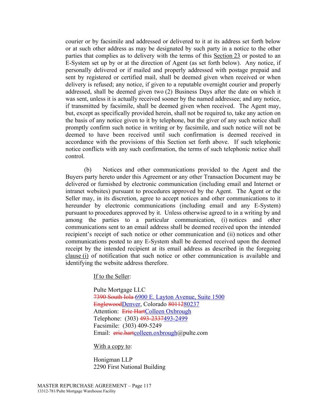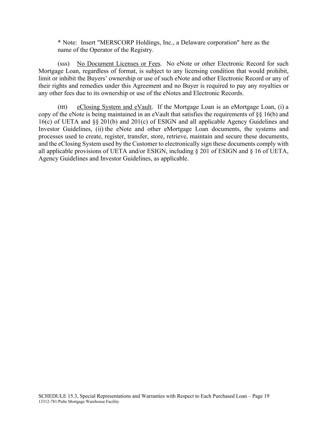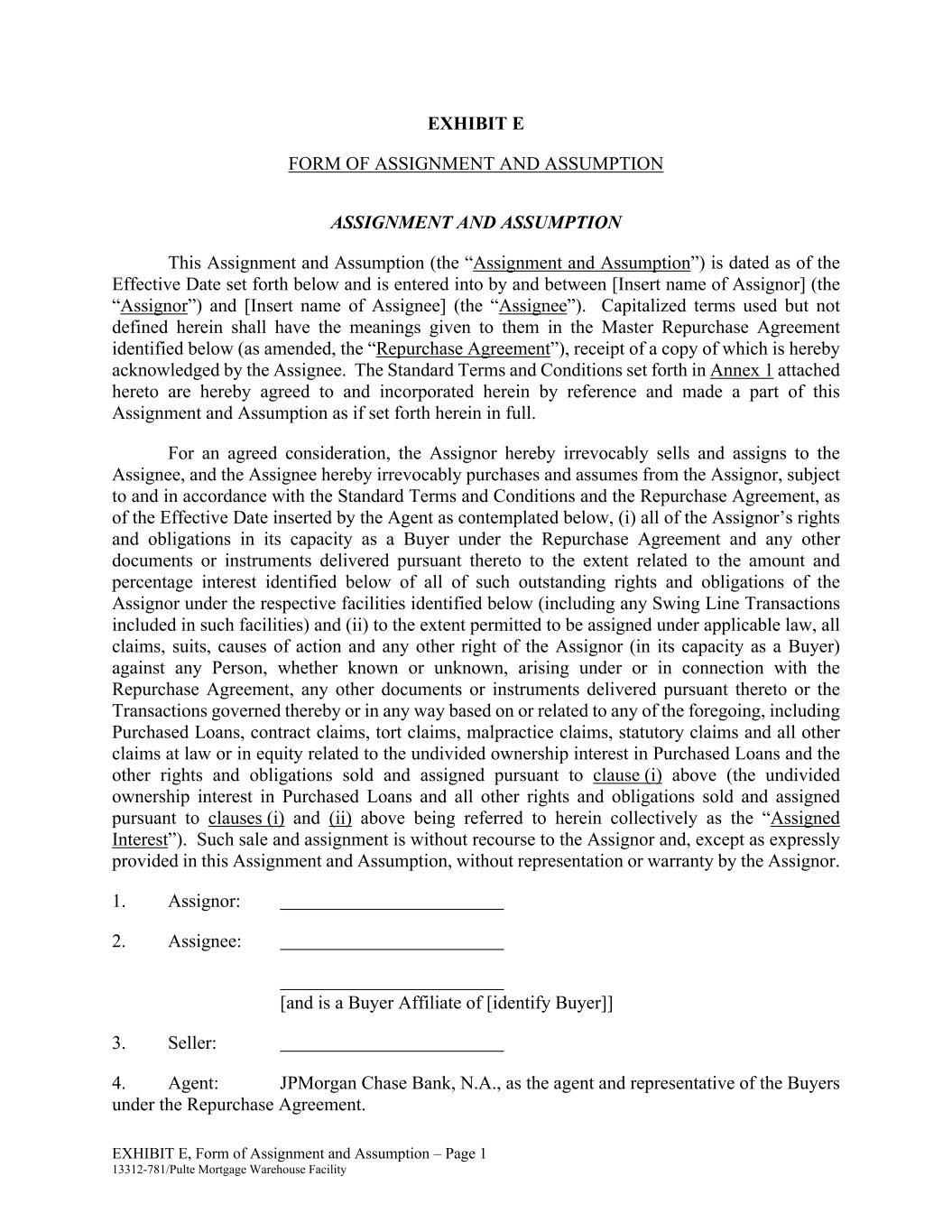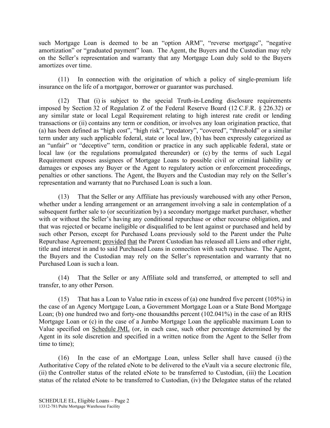 MASTER REPURCHASE AGREEMENT – Page 12 13312-781/Pulte Mortgage Warehouse Facility required to be maintained pursuant to Agency Guidelines and required to demonstrate compliance with all applicable Legal Requirements. An eClosing Transaction Record shall include systems logs and audit trails that establish a temporal and process link between the presentation of identity documents and the electronic signing of each eNote and Electronic Record, together with identifying information that can be used to verify the Electronic Signature and its attribution to the signer's identity, and evidence of the signer's agreement to conduct the transaction electronically and the signer's execution of each electronic signature. “Effective Date” means August 16, 2023. “Electronic Agent” means MERSCORP Holdings, Inc., or its successor in interest or assigns. “Electronic Record” means an “electronic record” as defined in Section 2 of UETA or Section 7006 of E-SIGN, as applicable, and with respect to an eMortgage Loan, the related eNote and all other documents comprising the File electronically created and that are stored in an electronic format and bearing an “electronic signature” as such term is defined in E-SIGN, if any. “Electronic Tracking Agreement” means one (1) or more Electronic Tracking Agreements with respect to (i) the tracking of changes in the ownership, mortgage servicers and servicing rights ownership of Mortgage Loans held on the MERS System, and (ii) the tracking of the Control of eNotes held on the MERS eRegistry, each in a form acceptable to Seller and Agent, as the same may be amended (including by an Addendum to Electronic Tracking Agreement for eNotes), restated, supplemented or otherwise modified from time to time. “Electronic Transmission” means each document, instruction, authorization, file, information and any other communication transmitted, posted or otherwise made or communicated by e-mail or E-Fax, or otherwise to or from an E-System or other equivalent service. “Eligible Assignee” means (a) a Buyer; (b) a Buyer Affiliate; or (c) any other Person (other than a natural person) approved by the (i) Agent and Swing Line Buyer, and (ii) unless an Event of Default has occurred and is continuing, the Seller (each such approval not to be unreasonably withheld or delayed); provided that (x) notwithstanding the foregoing, “Eligible Assignee” shall not include any natural person, the Seller, or any of the Seller’s Affiliates or Subsidiaries, (y) no assignment shall be made to a Defaulting Buyer (or a Person who would be a Defaulting Buyer if such Person was a Buyer hereunder) without the consent of Agent and Seller; and (z) that notwithstanding clause (c)(ii) of this definition, so long as no Event of Default has occurred and is continuing, no assignment shall be made to a Competitor without the consent of the Seller, which consent may be withheld in its sole discretion. “Eligible Loans” is defined on Schedule EL. “eMortgage Loan” means a Mortgage Loan evidenced by an eNote and as to which some or all of the other documents comprising the related mortgage file may be created electronically and not by traditional paper documentation with a pen and ink signature.