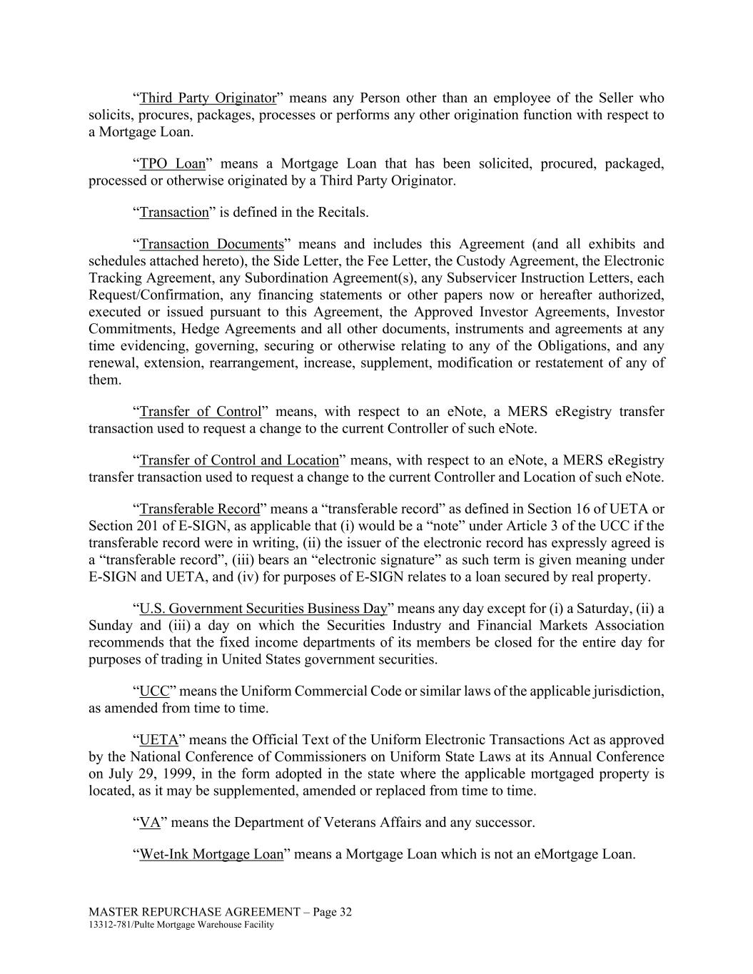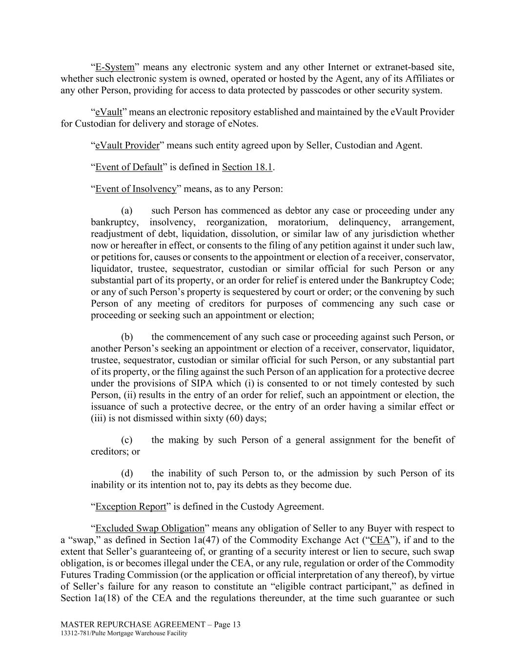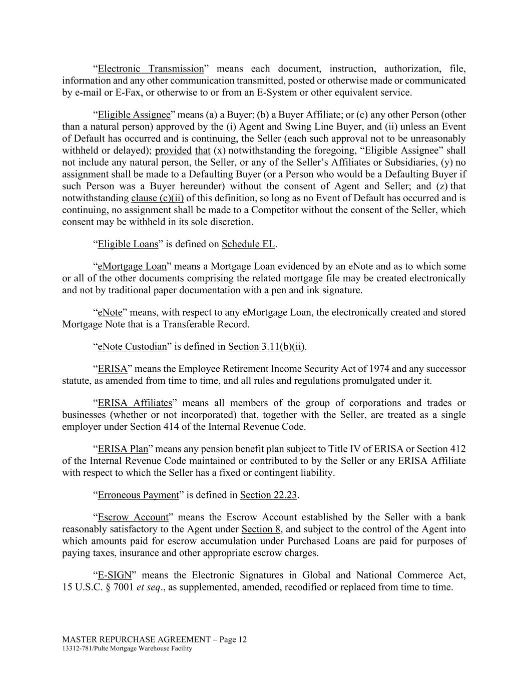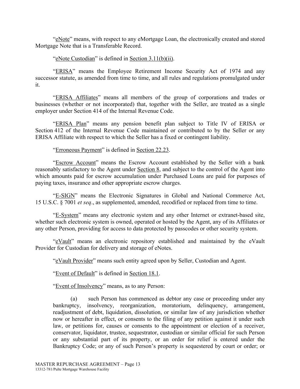 MASTER REPURCHASE AGREEMENT – Page 13 13312-781/Pulte Mortgage Warehouse Facility “eNote” means, with respect to any eMortgage Loan, the electronically created and stored Mortgage Note that is a Transferable Record. “eNote Custodian” is defined in Section 3.11(b)(ii). “ERISA” means the Employee Retirement Income Security Act of 1974 and any successor statute, as amended from time to time, and all rules and regulations promulgated under it. “ERISA Affiliates” means all members of the group of corporations and trades or businesses (whether or not incorporated) that, together with the Seller, are treated as a single employer under Section 414 of the Internal Revenue Code. “ERISA Plan” means any pension benefit plan subject to Title IV of ERISA or Section 412 of the Internal Revenue Code maintained or contributed to by the Seller or any ERISA Affiliate with respect to which the Seller has a fixed or contingent liability. “Erroneous Payment” is defined in Section 22.23. “Escrow Account” means the Escrow Account established by the Seller with a bank reasonably satisfactory to the Agent under Section 8, and subject to the control of the Agent into which amounts paid for escrow accumulation under Purchased Loans are paid for purposes of paying taxes, insurance and other appropriate escrow charges. “E-SIGN” means the Electronic Signatures in Global and National Commerce Act, 15 U.S.C. § 7001 et seq., as supplemented, amended, recodified or replaced from time to time. “E-System” means any electronic system and any other Internet or extranet-based site, whether such electronic system is owned, operated or hosted by the Agent, any of its Affiliates or any other Person, providing for access to data protected by passcodes or other security system. “eVault” means an electronic repository established and maintained by the eVault Provider for Custodian for delivery and storage of eNotes. “eVault Provider” means such entity agreed upon by Seller, Custodian and Agent. “Event of Default” is defined in Section 18.1. “Event of Insolvency” means, as to any Person: (a) such Person has commenced as debtor any case or proceeding under any bankruptcy, insolvency, reorganization, moratorium, delinquency, arrangement, readjustment of debt, liquidation, dissolution, or similar law of any jurisdiction whether now or hereafter in effect, or consents to the filing of any petition against it under such law, or petitions for, causes or consents to the appointment or election of a receiver, conservator, liquidator, trustee, sequestrator, custodian or similar official for such Person or any substantial part of its property, or an order for relief is entered under the Bankruptcy Code; or any of such Person’s property is sequestered by court or order; or