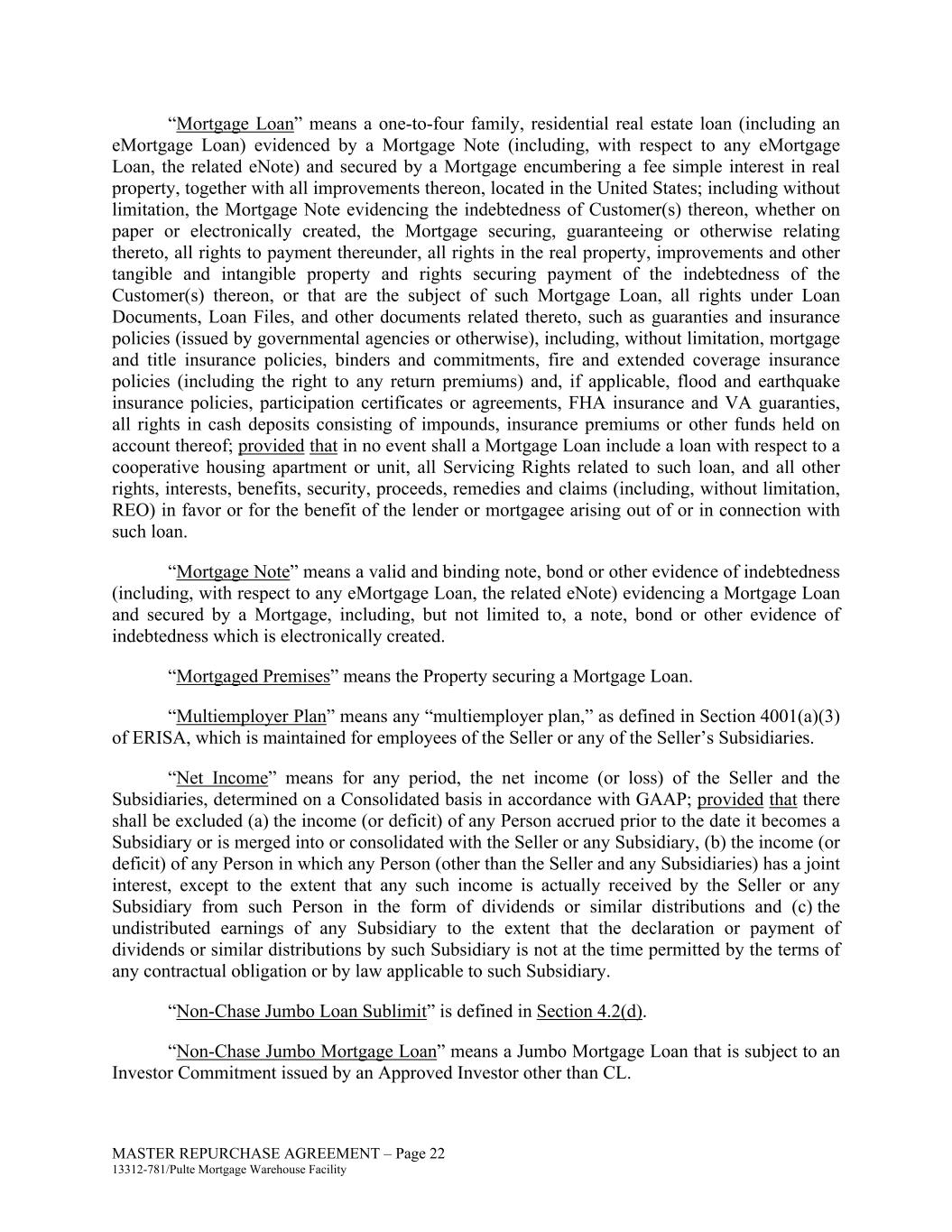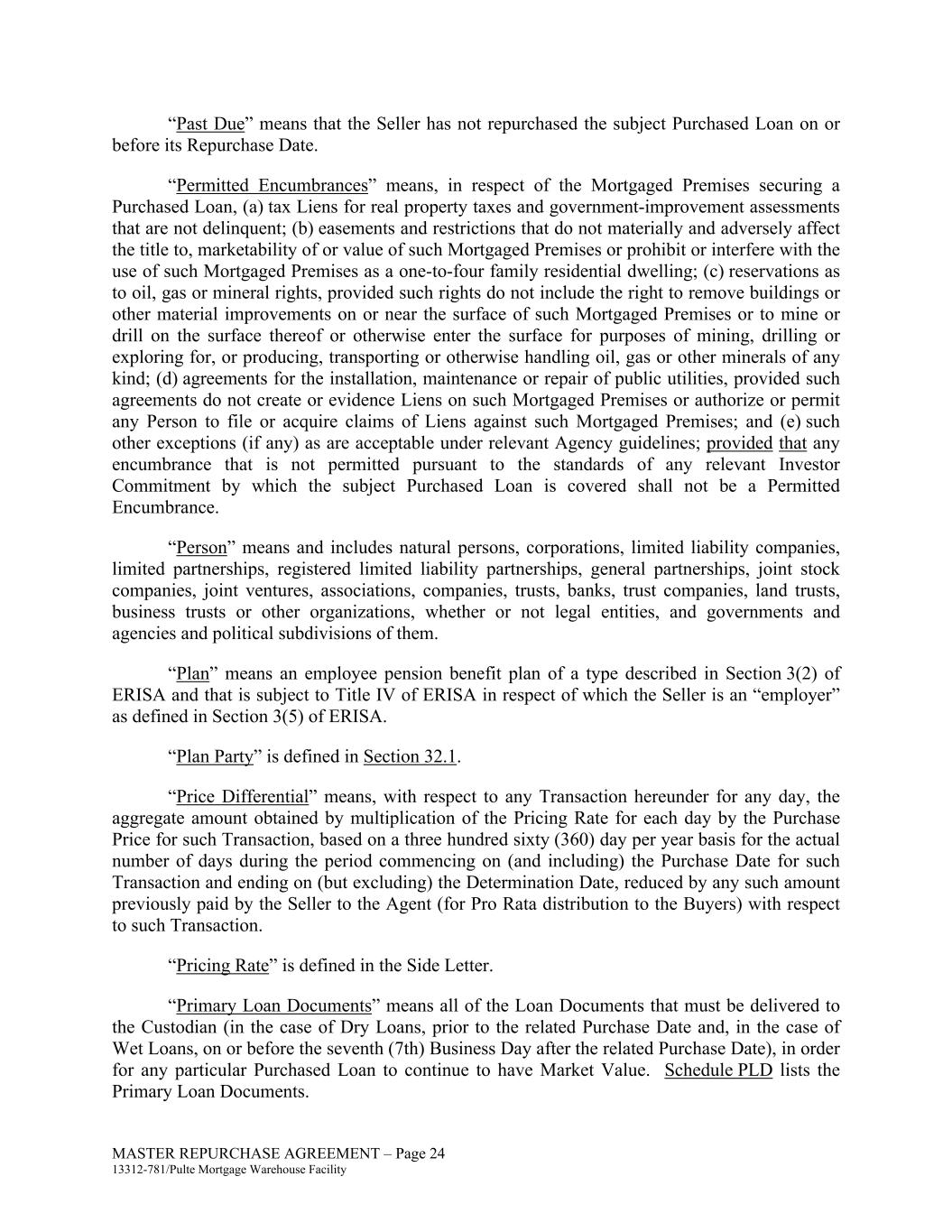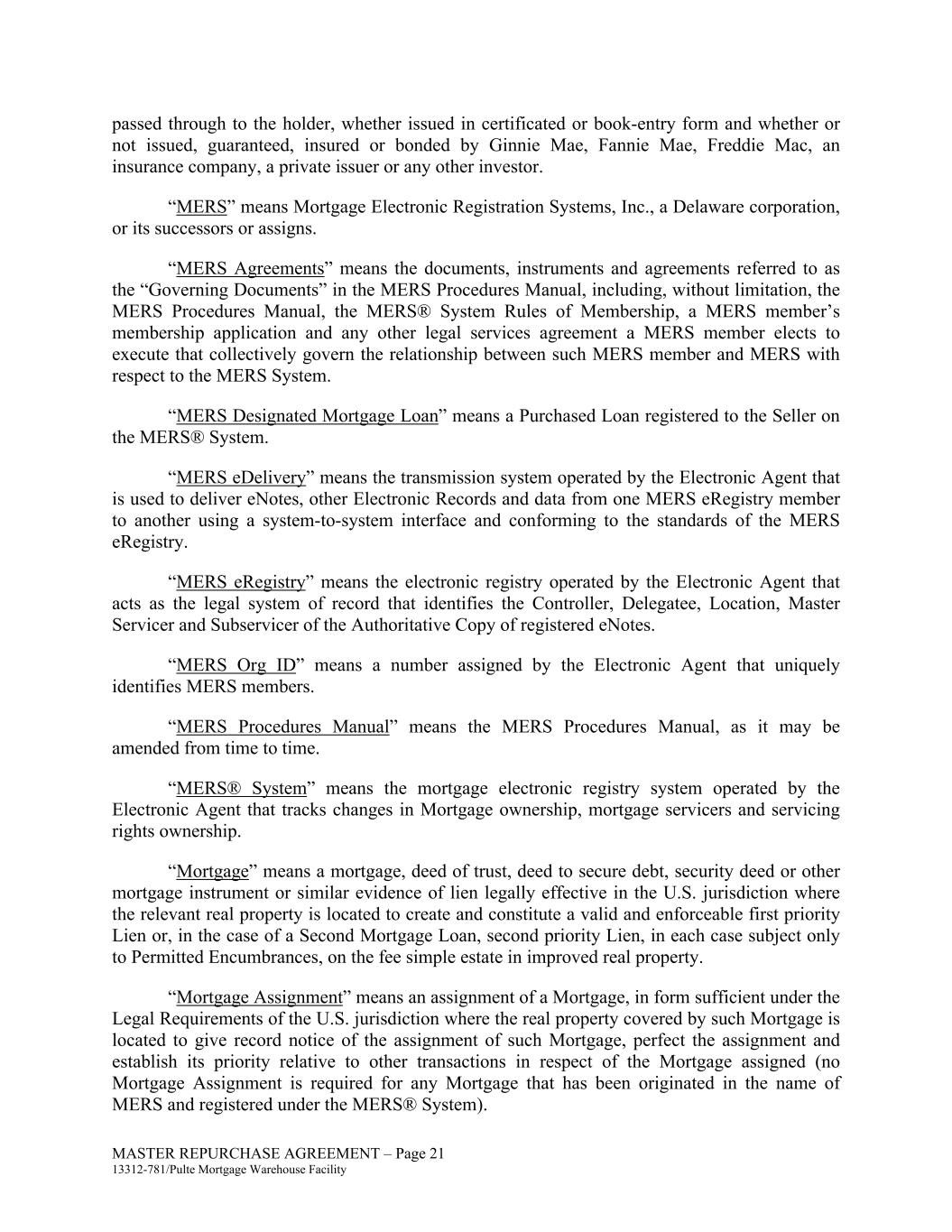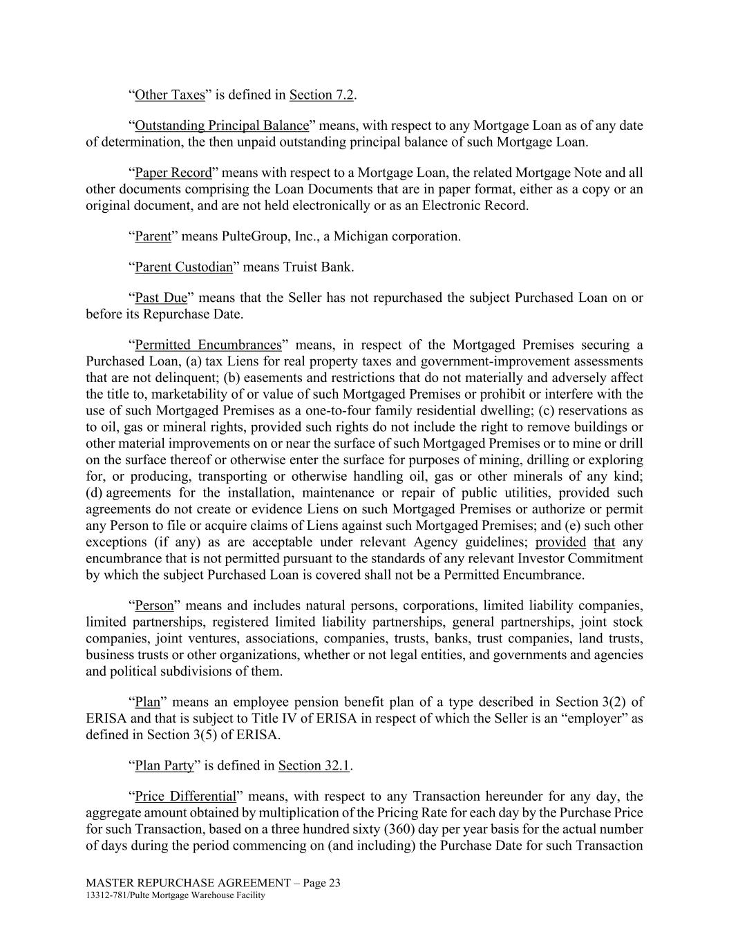 MASTER REPURCHASE AGREEMENT – Page 13 13312-781/Pulte Mortgage Warehouse Facility “eNote” means, with respect to any eMortgage Loan, the electronically created and stored Mortgage Note that is a Transferable Record. “eNote Custodian” is defined in Section 3.11(b)(ii). “ERISA” means the Employee Retirement Income Security Act of 1974 and any successor statute, as amended from time to time, and all rules and regulations promulgated under it. “ERISA Affiliates” means all members of the group of corporations and trades or businesses (whether or not incorporated) that, together with the Seller, are treated as a single employer under Section 414 of the Internal Revenue Code. “ERISA Plan” means any pension benefit plan subject to Title IV of ERISA or Section 412 of the Internal Revenue Code maintained or contributed to by the Seller or any ERISA Affiliate with respect to which the Seller has a fixed or contingent liability. “Erroneous Payment” is defined in Section 22.23. “Escrow Account” means the Escrow Account established by the Seller with a bank reasonably satisfactory to the Agent under Section 8, and subject to the control of the Agent into which amounts paid for escrow accumulation under Purchased Loans are paid for purposes of paying taxes, insurance and other appropriate escrow charges. “E-SIGN” means the Electronic Signatures in Global and National Commerce Act, 15 U.S.C. § 7001 et seq., as supplemented, amended, recodified or replaced from time to time. “E-System” means any electronic system and any other Internet or extranet-based site, whether such electronic system is owned, operated or hosted by the Agent, any of its Affiliates or any other Person, providing for access to data protected by passcodes or other security system. “eVault” means an electronic repository established and maintained by the eVault Provider for Custodian for delivery and storage of eNotes. “eVault Provider” means such entity agreed upon by Seller, Custodian and Agent. “Event of Default” is defined in Section 18.1. “Event of Insolvency” means, as to any Person: (a) such Person has commenced as debtor any case or proceeding under any bankruptcy, insolvency, reorganization, moratorium, delinquency, arrangement, readjustment of debt, liquidation, dissolution, or similar law of any jurisdiction whether now or hereafter in effect, or consents to the filing of any petition against it under such law, or petitions for, causes or consents to the appointment or election of a receiver, conservator, liquidator, trustee, sequestrator, custodian or similar official for such Person or any substantial part of its property, or an order for relief is entered under the Bankruptcy Code; or any of such Person’s property is sequestered by court or order; or