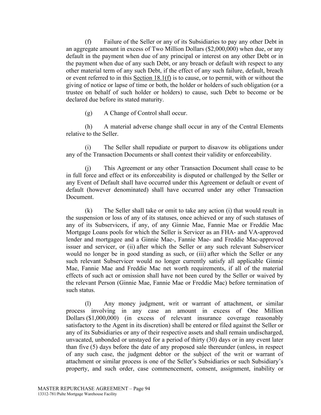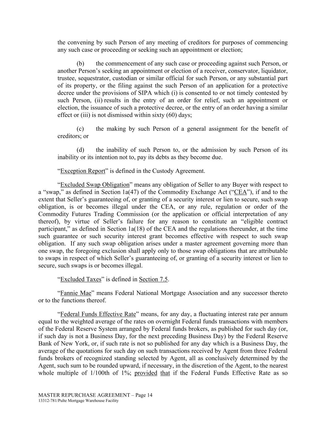 MASTER REPURCHASE AGREEMENT – Page 14 13312-781/Pulte Mortgage Warehouse Facility the convening by such Person of any meeting of creditors for purposes of commencing any such case or proceeding or seeking such an appointment or election; (b) the commencement of any such case or proceeding against such Person, or another Person’s seeking an appointment or election of a receiver, conservator, liquidator, trustee, sequestrator, custodian or similar official for such Person, or any substantial part of its property, or the filing against the such Person of an application for a protective decree under the provisions of SIPA which (i) is consented to or not timely contested by such Person, (ii) results in the entry of an order for relief, such an appointment or election, the issuance of such a protective decree, or the entry of an order having a similar effect or (iii) is not dismissed within sixty (60) days; (c) the making by such Person of a general assignment for the benefit of creditors; or (d) the inability of such Person to, or the admission by such Person of its inability or its intention not to, pay its debts as they become due. “Exception Report” is defined in the Custody Agreement. “Excluded Swap Obligation” means any obligation of Seller to any Buyer with respect to a “swap,” as defined in Section 1a(47) of the Commodity Exchange Act (“CEA”), if and to the extent that Seller’s guaranteeing of, or granting of a security interest or lien to secure, such swap obligation, is or becomes illegal under the CEA, or any rule, regulation or order of the Commodity Futures Trading Commission (or the application or official interpretation of any thereof), by virtue of Seller’s failure for any reason to constitute an “eligible contract participant,” as defined in Section 1a(18) of the CEA and the regulations thereunder, at the time such guarantee or such security interest grant becomes effective with respect to such swap obligation. If any such swap obligation arises under a master agreement governing more than one swap, the foregoing exclusion shall apply only to those swap obligations that are attributable to swaps in respect of which Seller’s guaranteeing of, or granting of a security interest or lien to secure, such swaps is or becomes illegal. “Excluded Taxes” is defined in Section 7.5. “Fannie Mae” means Federal National Mortgage Association and any successor thereto or to the functions thereof. “Federal Funds Effective Rate” means, for any day, a fluctuating interest rate per annum equal to the weighted average of the rates on overnight Federal funds transactions with members of the Federal Reserve System arranged by Federal funds brokers, as published for such day (or, if such day is not a Business Day, for the next preceding Business Day) by the Federal Reserve Bank of New York, or, if such rate is not so published for any day which is a Business Day, the average of the quotations for such day on such transactions received by Agent from three Federal funds brokers of recognized standing selected by Agent, all as conclusively determined by the Agent, such sum to be rounded upward, if necessary, in the discretion of the Agent, to the nearest whole multiple of 1/100th of 1%; provided that if the Federal Funds Effective Rate as so