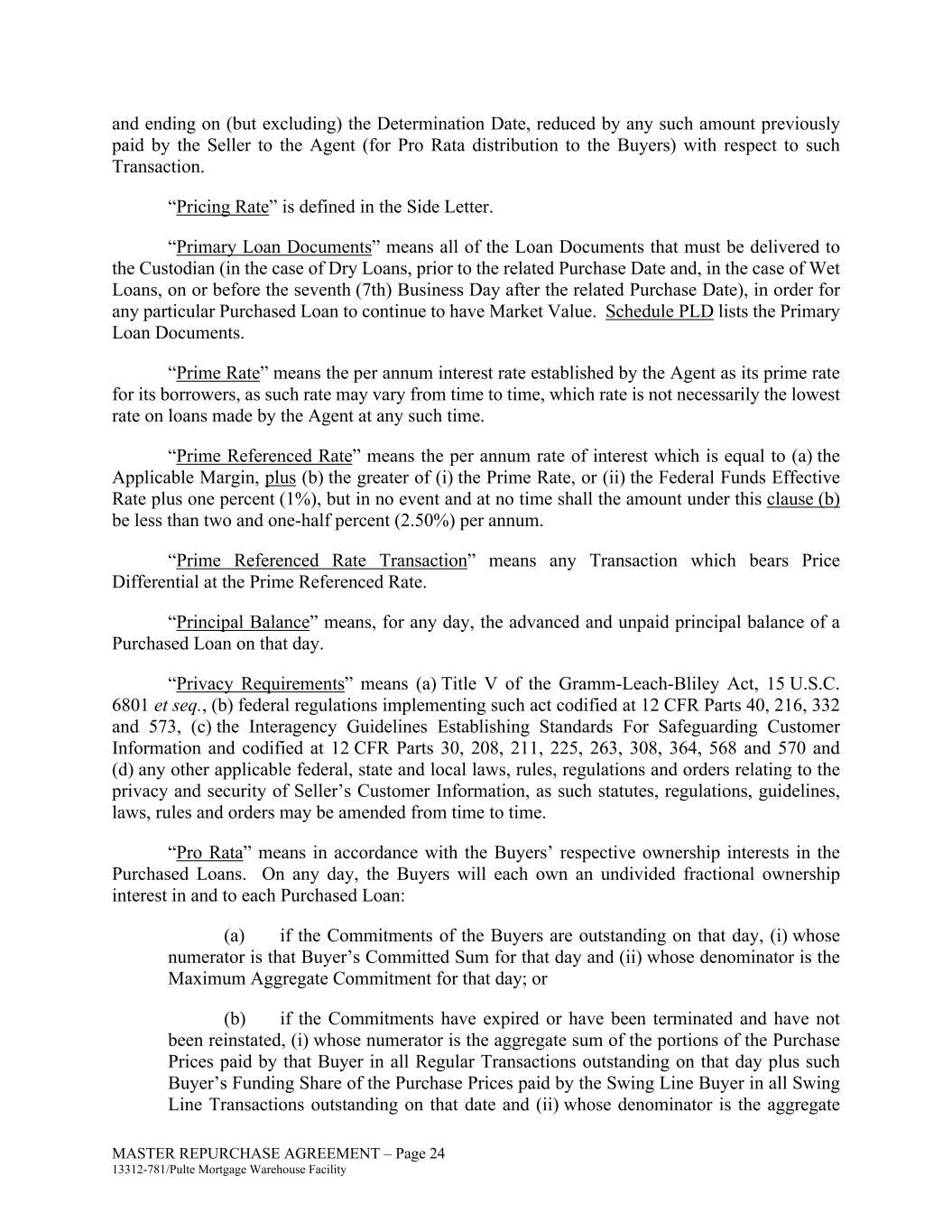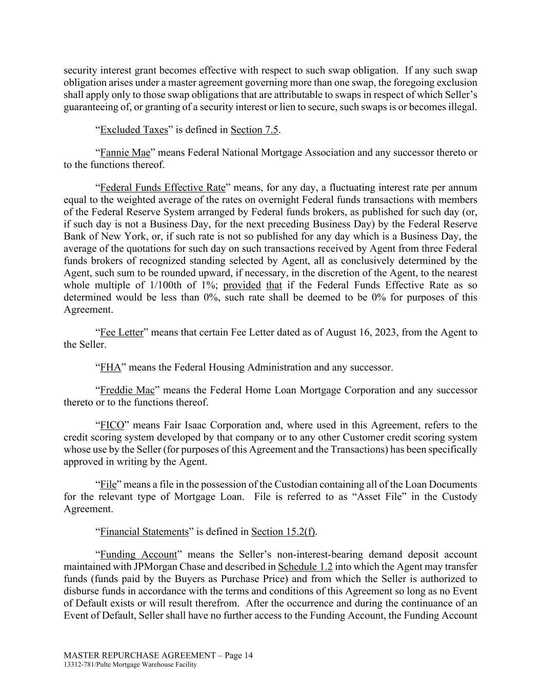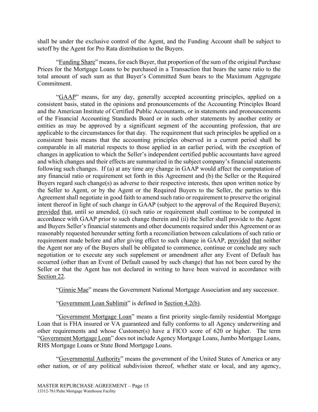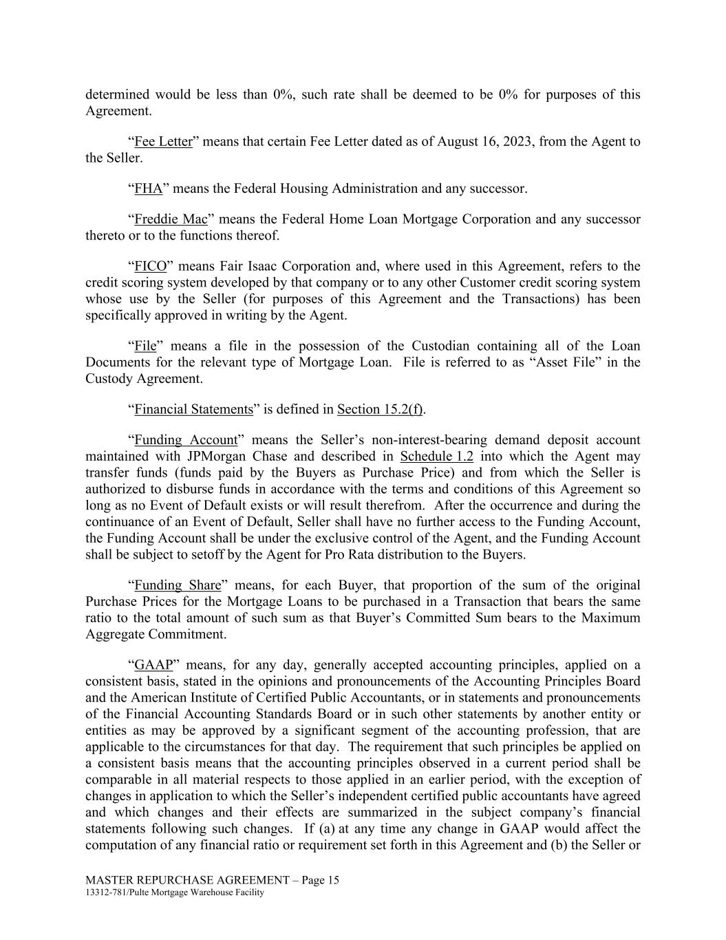 MASTER REPURCHASE AGREEMENT – Page 15 13312-781/Pulte Mortgage Warehouse Facility determined would be less than 0%, such rate shall be deemed to be 0% for purposes of this Agreement. “Fee Letter” means that certain Fee Letter dated as of August 16, 2023, from the Agent to the Seller. “FHA” means the Federal Housing Administration and any successor. “Freddie Mac” means the Federal Home Loan Mortgage Corporation and any successor thereto or to the functions thereof. “FICO” means Fair Isaac Corporation and, where used in this Agreement, refers to the credit scoring system developed by that company or to any other Customer credit scoring system whose use by the Seller (for purposes of this Agreement and the Transactions) has been specifically approved in writing by the Agent. “File” means a file in the possession of the Custodian containing all of the Loan Documents for the relevant type of Mortgage Loan. File is referred to as “Asset File” in the Custody Agreement. “Financial Statements” is defined in Section 15.2(f). “Funding Account” means the Seller’s non-interest-bearing demand deposit account maintained with JPMorgan Chase and described in Schedule 1.2 into which the Agent may transfer funds (funds paid by the Buyers as Purchase Price) and from which the Seller is authorized to disburse funds in accordance with the terms and conditions of this Agreement so long as no Event of Default exists or will result therefrom. After the occurrence and during the continuance of an Event of Default, Seller shall have no further access to the Funding Account, the Funding Account shall be under the exclusive control of the Agent, and the Funding Account shall be subject to setoff by the Agent for Pro Rata distribution to the Buyers. “Funding Share” means, for each Buyer, that proportion of the sum of the original Purchase Prices for the Mortgage Loans to be purchased in a Transaction that bears the same ratio to the total amount of such sum as that Buyer’s Committed Sum bears to the Maximum Aggregate Commitment. “GAAP” means, for any day, generally accepted accounting principles, applied on a consistent basis, stated in the opinions and pronouncements of the Accounting Principles Board and the American Institute of Certified Public Accountants, or in statements and pronouncements of the Financial Accounting Standards Board or in such other statements by another entity or entities as may be approved by a significant segment of the accounting profession, that are applicable to the circumstances for that day. The requirement that such principles be applied on a consistent basis means that the accounting principles observed in a current period shall be comparable in all material respects to those applied in an earlier period, with the exception of changes in application to which the Seller’s independent certified public accountants have agreed and which changes and their effects are summarized in the subject company’s financial statements following such changes. If (a) at any time any change in GAAP would affect the computation of any financial ratio or requirement set forth in this Agreement and (b) the Seller or