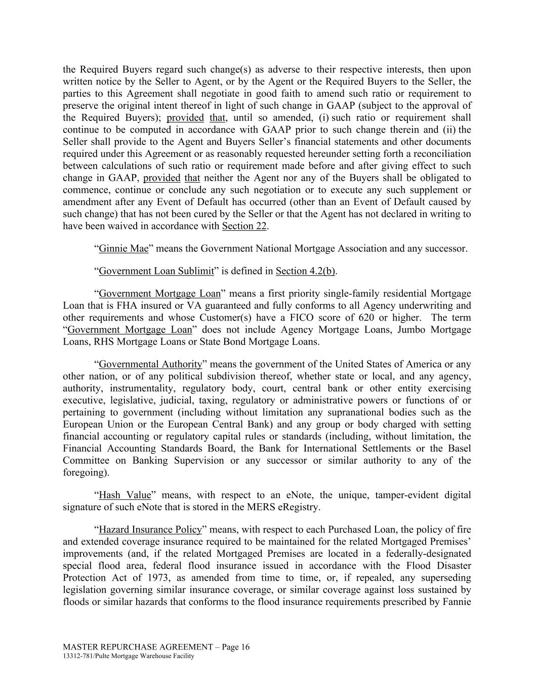 MASTER REPURCHASE AGREEMENT – Page 16 13312-781/Pulte Mortgage Warehouse Facility the Required Buyers regard such change(s) as adverse to their respective interests, then upon written notice by the Seller to Agent, or by the Agent or the Required Buyers to the Seller, the parties to this Agreement shall negotiate in good faith to amend such ratio or requirement to preserve the original intent thereof in light of such change in GAAP (subject to the approval of the Required Buyers); provided that, until so amended, (i) such ratio or requirement shall continue to be computed in accordance with GAAP prior to such change therein and (ii) the Seller shall provide to the Agent and Buyers Seller’s financial statements and other documents required under this Agreement or as reasonably requested hereunder setting forth a reconciliation between calculations of such ratio or requirement made before and after giving effect to such change in GAAP, provided that neither the Agent nor any of the Buyers shall be obligated to commence, continue or conclude any such negotiation or to execute any such supplement or amendment after any Event of Default has occurred (other than an Event of Default caused by such change) that has not been cured by the Seller or that the Agent has not declared in writing to have been waived in accordance with Section 22. “Ginnie Mae” means the Government National Mortgage Association and any successor. “Government Loan Sublimit” is defined in Section 4.2(b). “Government Mortgage Loan” means a first priority single-family residential Mortgage Loan that is FHA insured or VA guaranteed and fully conforms to all Agency underwriting and other requirements and whose Customer(s) have a FICO score of 620 or higher. The term “Government Mortgage Loan” does not include Agency Mortgage Loans, Jumbo Mortgage Loans, RHS Mortgage Loans or State Bond Mortgage Loans. “Governmental Authority” means the government of the United States of America or any other nation, or of any political subdivision thereof, whether state or local, and any agency, authority, instrumentality, regulatory body, court, central bank or other entity exercising executive, legislative, judicial, taxing, regulatory or administrative powers or functions of or pertaining to government (including without limitation any supranational bodies such as the European Union or the European Central Bank) and any group or body charged with setting financial accounting or regulatory capital rules or standards (including, without limitation, the Financial Accounting Standards Board, the Bank for International Settlements or the Basel Committee on Banking Supervision or any successor or similar authority to any of the foregoing). “Hash Value” means, with respect to an eNote, the unique, tamper-evident digital signature of such eNote that is stored in the MERS eRegistry. “Hazard Insurance Policy” means, with respect to each Purchased Loan, the policy of fire and extended coverage insurance required to be maintained for the related Mortgaged Premises’ improvements (and, if the related Mortgaged Premises are located in a federally-designated special flood area, federal flood insurance issued in accordance with the Flood Disaster Protection Act of 1973, as amended from time to time, or, if repealed, any superseding legislation governing similar insurance coverage, or similar coverage against loss sustained by floods or similar hazards that conforms to the flood insurance requirements prescribed by Fannie
