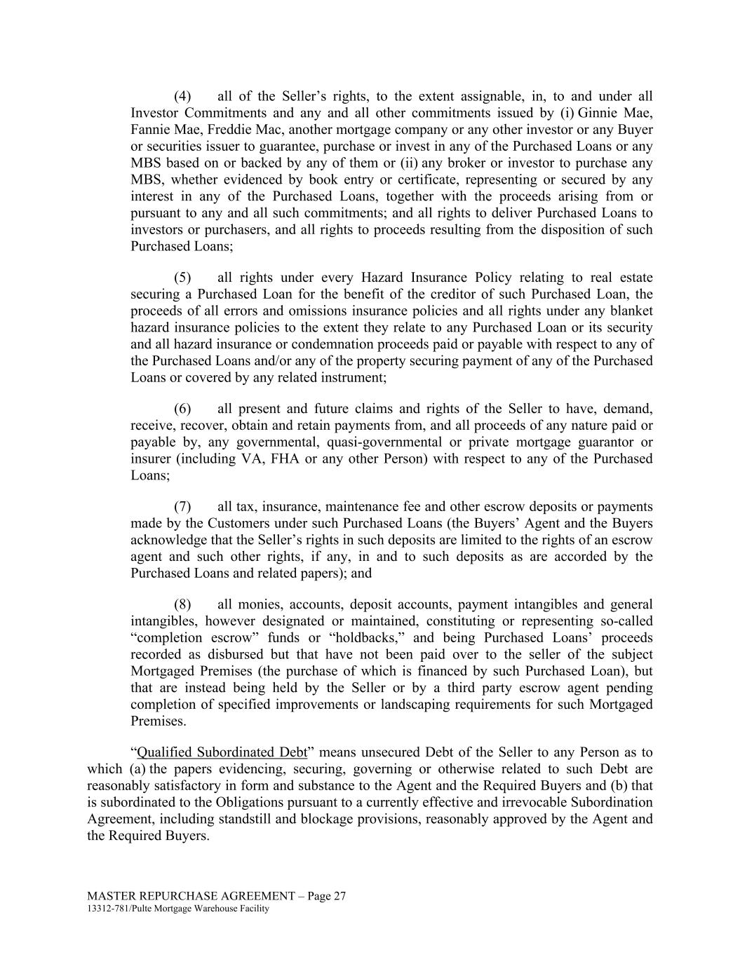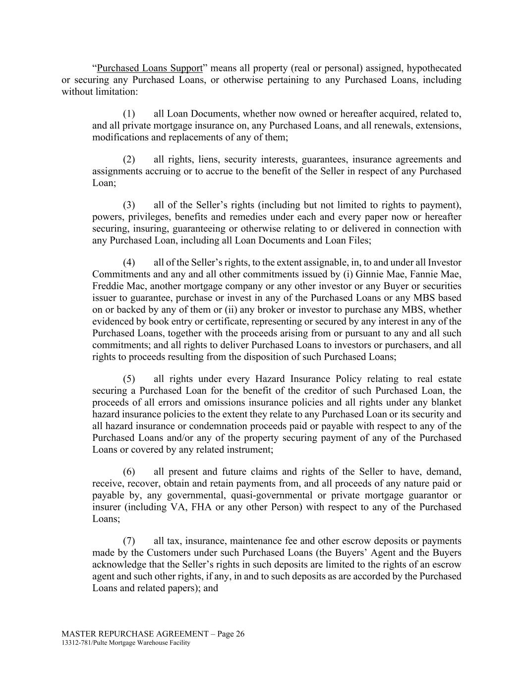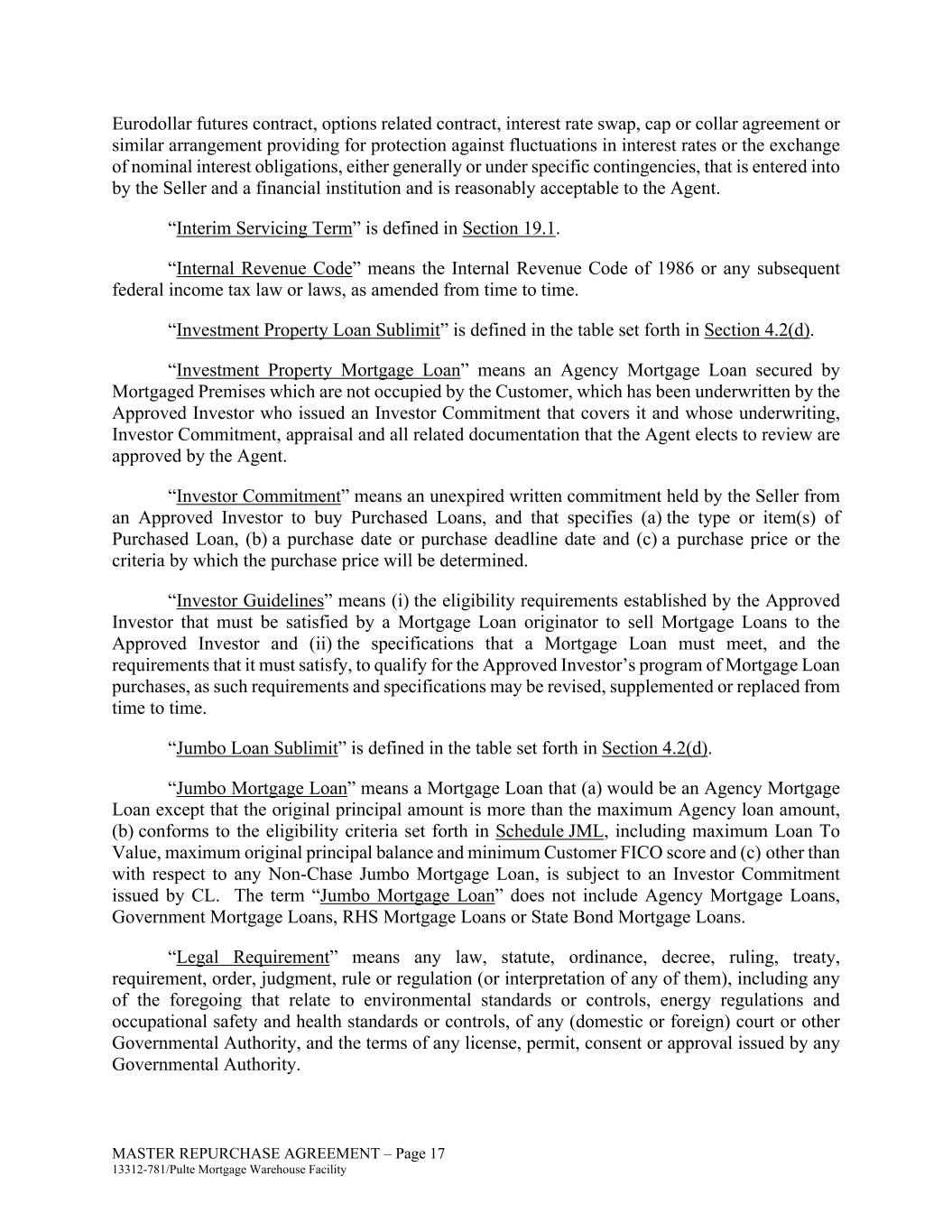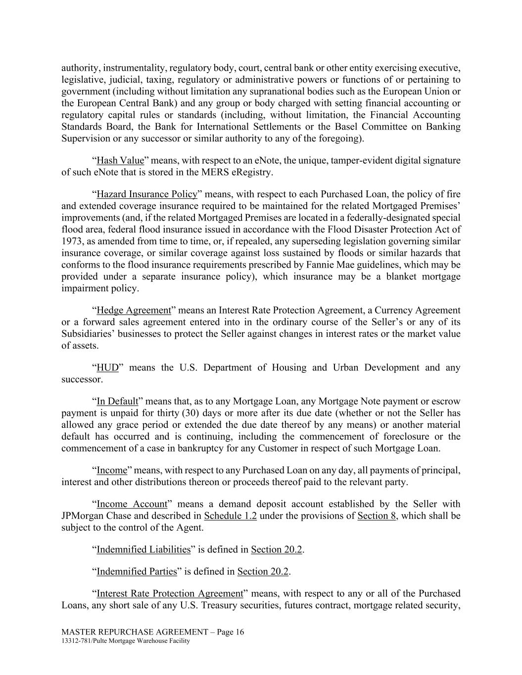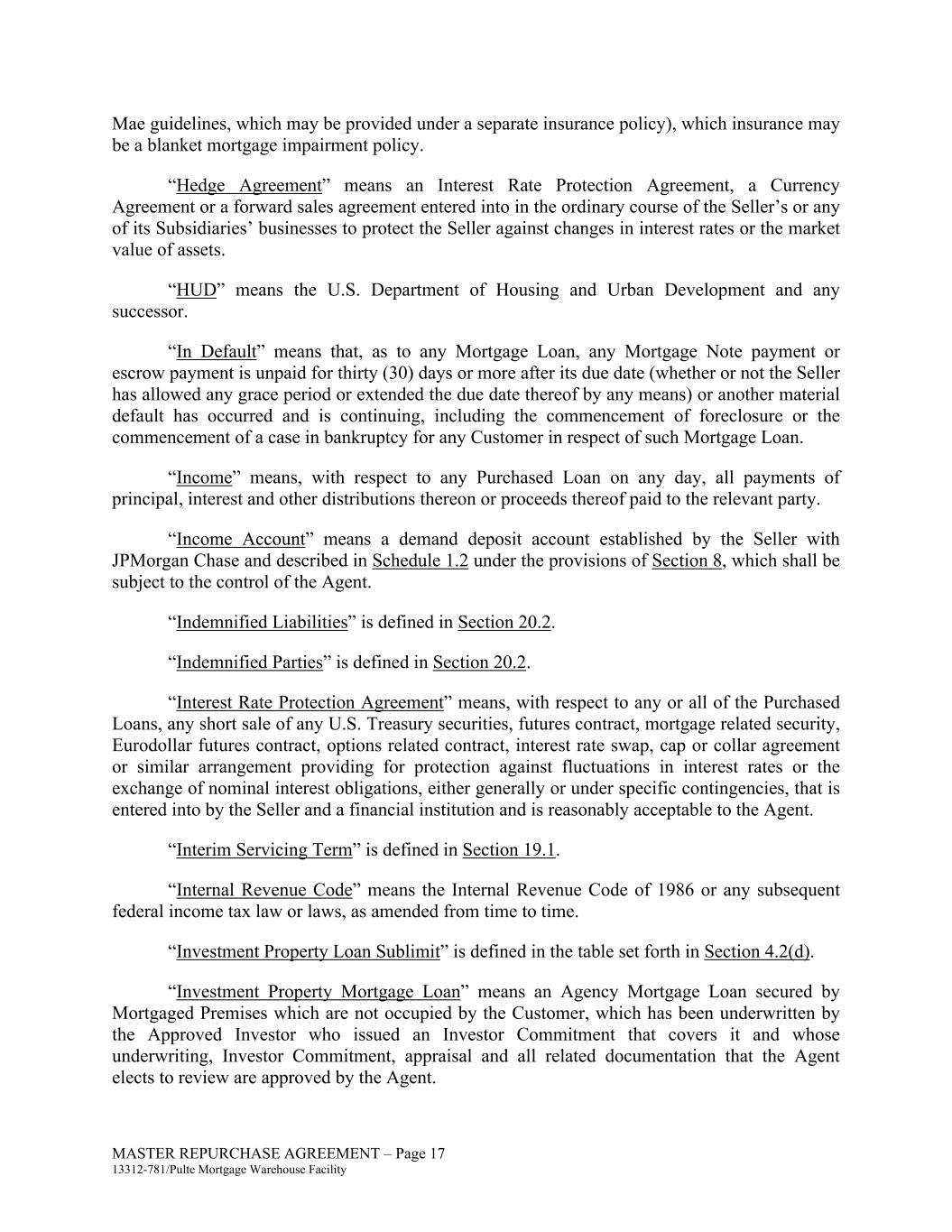 MASTER REPURCHASE AGREEMENT – Page 17 13312-781/Pulte Mortgage Warehouse Facility Mae guidelines, which may be provided under a separate insurance policy), which insurance may be a blanket mortgage impairment policy. “Hedge Agreement” means an Interest Rate Protection Agreement, a Currency Agreement or a forward sales agreement entered into in the ordinary course of the Seller’s or any of its Subsidiaries’ businesses to protect the Seller against changes in interest rates or the market value of assets. “HUD” means the U.S. Department of Housing and Urban Development and any successor. “In Default” means that, as to any Mortgage Loan, any Mortgage Note payment or escrow payment is unpaid for thirty (30) days or more after its due date (whether or not the Seller has allowed any grace period or extended the due date thereof by any means) or another material default has occurred and is continuing, including the commencement of foreclosure or the commencement of a case in bankruptcy for any Customer in respect of such Mortgage Loan. “Income” means, with respect to any Purchased Loan on any day, all payments of principal, interest and other distributions thereon or proceeds thereof paid to the relevant party. “Income Account” means a demand deposit account established by the Seller with JPMorgan Chase and described in Schedule 1.2 under the provisions of Section 8, which shall be subject to the control of the Agent. “Indemnified Liabilities” is defined in Section 20.2. “Indemnified Parties” is defined in Section 20.2. “Interest Rate Protection Agreement” means, with respect to any or all of the Purchased Loans, any short sale of any U.S. Treasury securities, futures contract, mortgage related security, Eurodollar futures contract, options related contract, interest rate swap, cap or collar agreement or similar arrangement providing for protection against fluctuations in interest rates or the exchange of nominal interest obligations, either generally or under specific contingencies, that is entered into by the Seller and a financial institution and is reasonably acceptable to the Agent. “Interim Servicing Term” is defined in Section 19.1. “Internal Revenue Code” means the Internal Revenue Code of 1986 or any subsequent federal income tax law or laws, as amended from time to time. “Investment Property Loan Sublimit” is defined in the table set forth in Section 4.2(d). “Investment Property Mortgage Loan” means an Agency Mortgage Loan secured by Mortgaged Premises which are not occupied by the Customer, which has been underwritten by the Approved Investor who issued an Investor Commitment that covers it and whose underwriting, Investor Commitment, appraisal and all related documentation that the Agent elects to review are approved by the Agent.