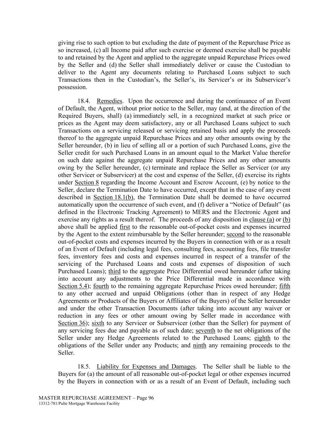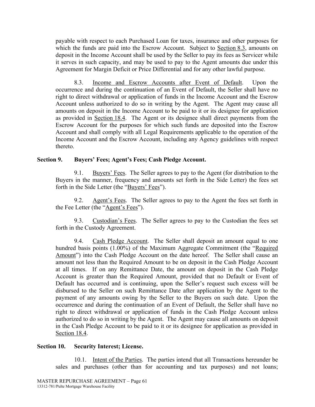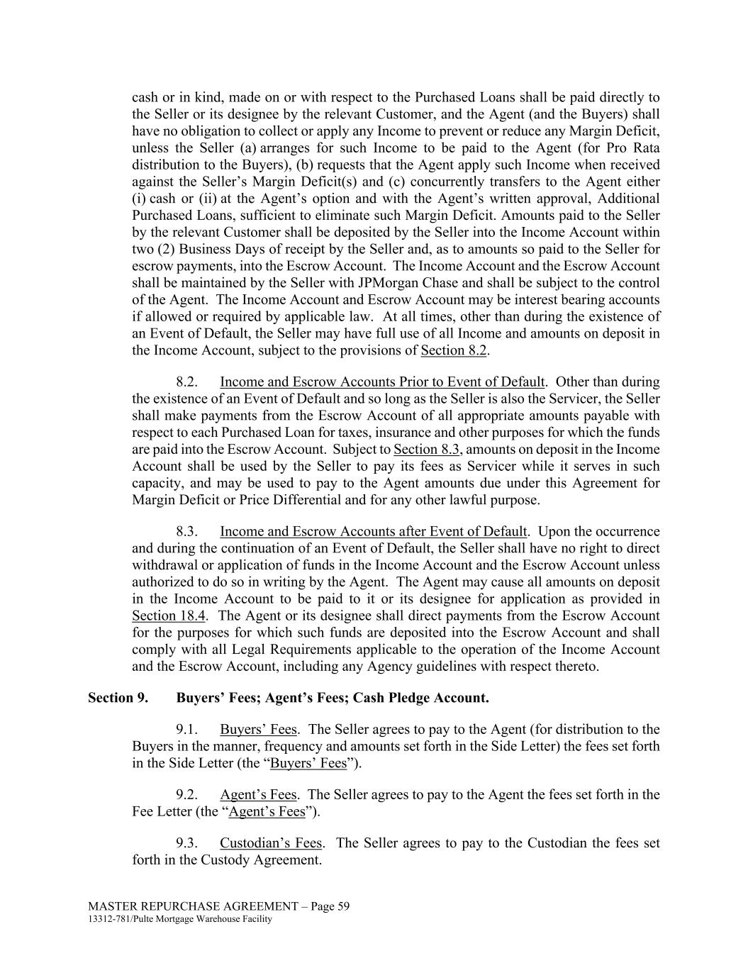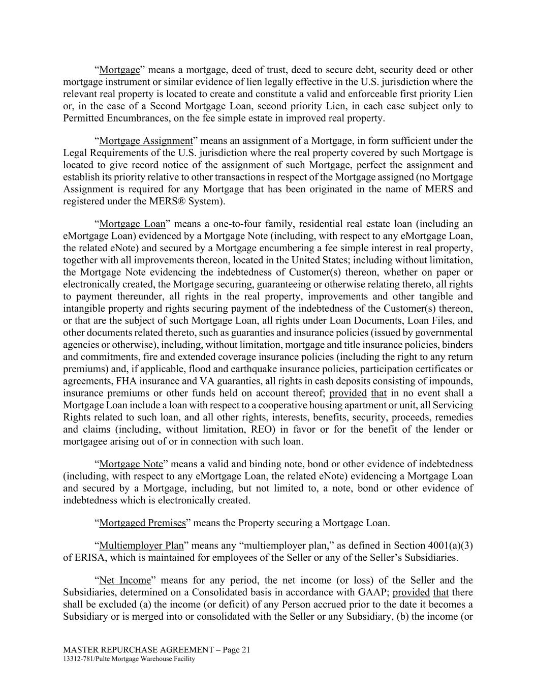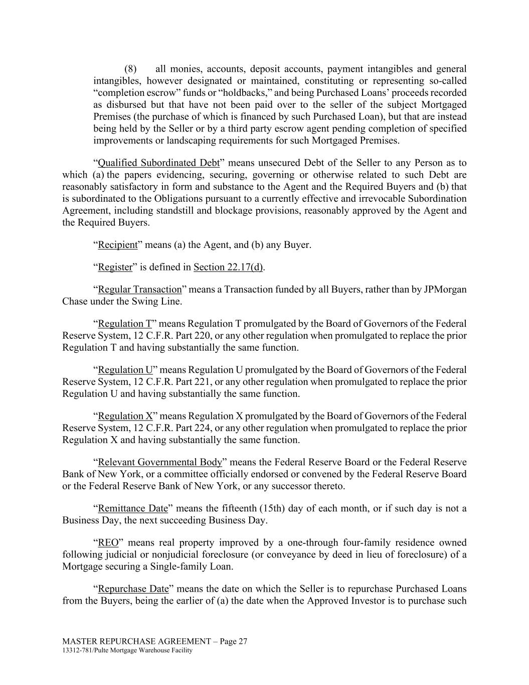 MASTER REPURCHASE AGREEMENT – Page 17 13312-781/Pulte Mortgage Warehouse Facility Mae guidelines, which may be provided under a separate insurance policy), which insurance may be a blanket mortgage impairment policy. “Hedge Agreement” means an Interest Rate Protection Agreement, a Currency Agreement or a forward sales agreement entered into in the ordinary course of the Seller’s or any of its Subsidiaries’ businesses to protect the Seller against changes in interest rates or the market value of assets. “HUD” means the U.S. Department of Housing and Urban Development and any successor. “In Default” means that, as to any Mortgage Loan, any Mortgage Note payment or escrow payment is unpaid for thirty (30) days or more after its due date (whether or not the Seller has allowed any grace period or extended the due date thereof by any means) or another material default has occurred and is continuing, including the commencement of foreclosure or the commencement of a case in bankruptcy for any Customer in respect of such Mortgage Loan. “Income” means, with respect to any Purchased Loan on any day, all payments of principal, interest and other distributions thereon or proceeds thereof paid to the relevant party. “Income Account” means a demand deposit account established by the Seller with JPMorgan Chase and described in Schedule 1.2 under the provisions of Section 8, which shall be subject to the control of the Agent. “Indemnified Liabilities” is defined in Section 20.2. “Indemnified Parties” is defined in Section 20.2. “Interest Rate Protection Agreement” means, with respect to any or all of the Purchased Loans, any short sale of any U.S. Treasury securities, futures contract, mortgage related security, Eurodollar futures contract, options related contract, interest rate swap, cap or collar agreement or similar arrangement providing for protection against fluctuations in interest rates or the exchange of nominal interest obligations, either generally or under specific contingencies, that is entered into by the Seller and a financial institution and is reasonably acceptable to the Agent. “Interim Servicing Term” is defined in Section 19.1. “Internal Revenue Code” means the Internal Revenue Code of 1986 or any subsequent federal income tax law or laws, as amended from time to time. “Investment Property Loan Sublimit” is defined in the table set forth in Section 4.2(d). “Investment Property Mortgage Loan” means an Agency Mortgage Loan secured by Mortgaged Premises which are not occupied by the Customer, which has been underwritten by the Approved Investor who issued an Investor Commitment that covers it and whose underwriting, Investor Commitment, appraisal and all related documentation that the Agent elects to review are approved by the Agent.