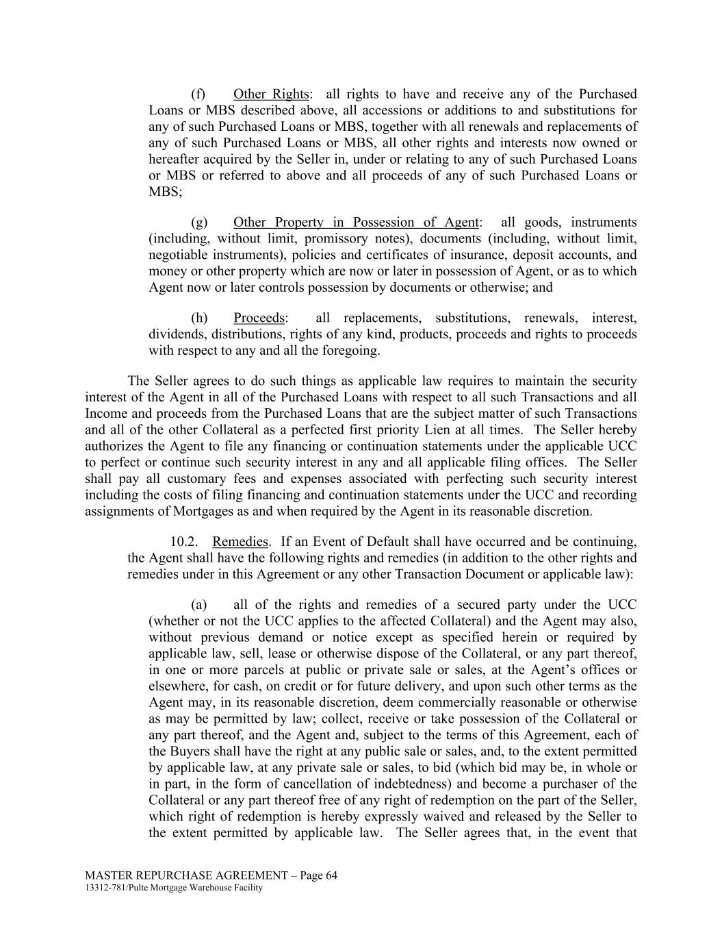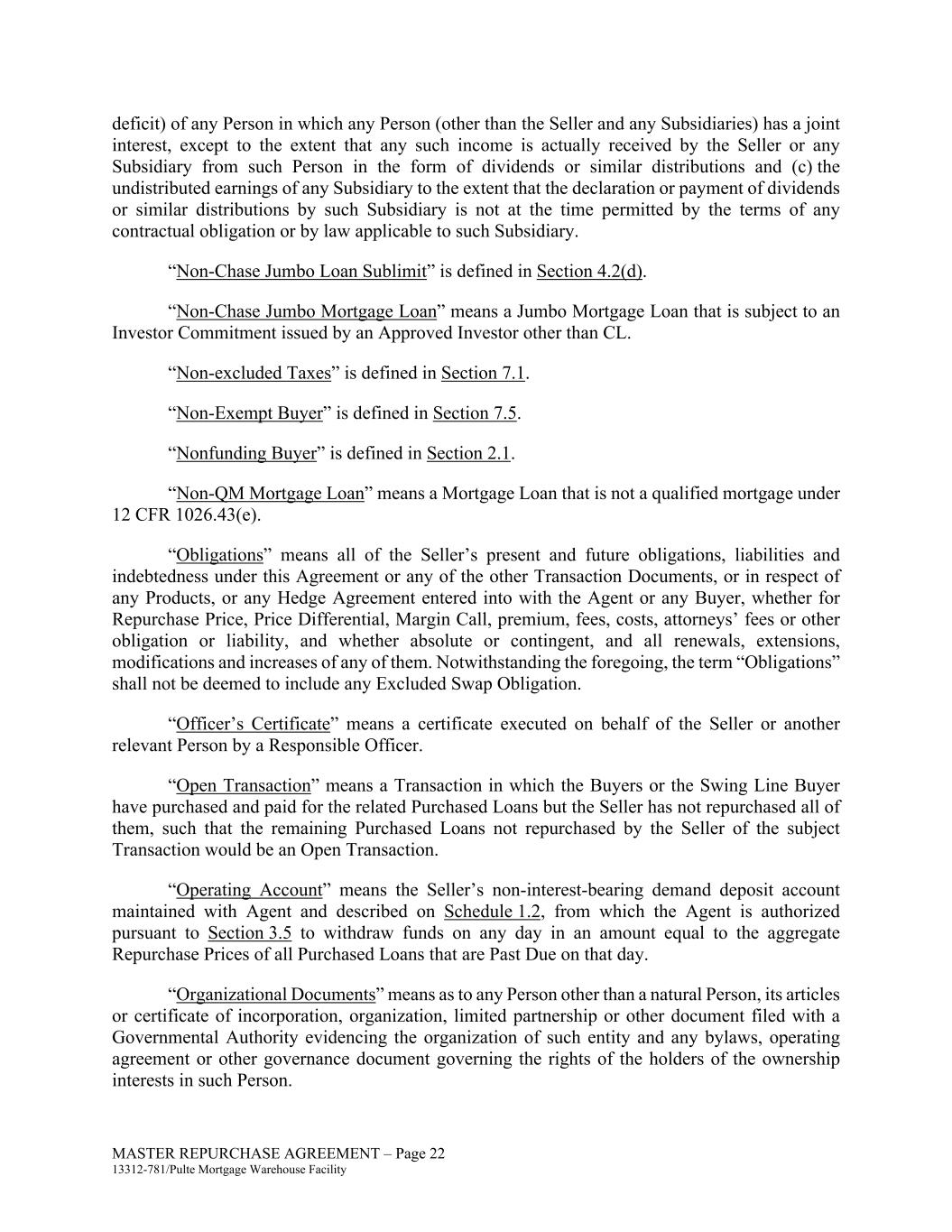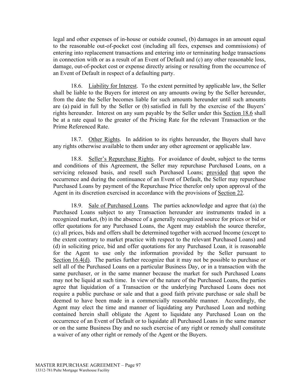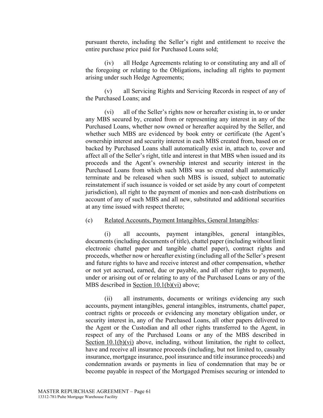 MASTER REPURCHASE AGREEMENT – Page 17 13312-781/Pulte Mortgage Warehouse Facility Mae guidelines, which may be provided under a separate insurance policy), which insurance may be a blanket mortgage impairment policy. “Hedge Agreement” means an Interest Rate Protection Agreement, a Currency Agreement or a forward sales agreement entered into in the ordinary course of the Seller’s or any of its Subsidiaries’ businesses to protect the Seller against changes in interest rates or the market value of assets. “HUD” means the U.S. Department of Housing and Urban Development and any successor. “In Default” means that, as to any Mortgage Loan, any Mortgage Note payment or escrow payment is unpaid for thirty (30) days or more after its due date (whether or not the Seller has allowed any grace period or extended the due date thereof by any means) or another material default has occurred and is continuing, including the commencement of foreclosure or the commencement of a case in bankruptcy for any Customer in respect of such Mortgage Loan. “Income” means, with respect to any Purchased Loan on any day, all payments of principal, interest and other distributions thereon or proceeds thereof paid to the relevant party. “Income Account” means a demand deposit account established by the Seller with JPMorgan Chase and described in Schedule 1.2 under the provisions of Section 8, which shall be subject to the control of the Agent. “Indemnified Liabilities” is defined in Section 20.2. “Indemnified Parties” is defined in Section 20.2. “Interest Rate Protection Agreement” means, with respect to any or all of the Purchased Loans, any short sale of any U.S. Treasury securities, futures contract, mortgage related security, Eurodollar futures contract, options related contract, interest rate swap, cap or collar agreement or similar arrangement providing for protection against fluctuations in interest rates or the exchange of nominal interest obligations, either generally or under specific contingencies, that is entered into by the Seller and a financial institution and is reasonably acceptable to the Agent. “Interim Servicing Term” is defined in Section 19.1. “Internal Revenue Code” means the Internal Revenue Code of 1986 or any subsequent federal income tax law or laws, as amended from time to time. “Investment Property Loan Sublimit” is defined in the table set forth in Section 4.2(d). “Investment Property Mortgage Loan” means an Agency Mortgage Loan secured by Mortgaged Premises which are not occupied by the Customer, which has been underwritten by the Approved Investor who issued an Investor Commitment that covers it and whose underwriting, Investor Commitment, appraisal and all related documentation that the Agent elects to review are approved by the Agent.