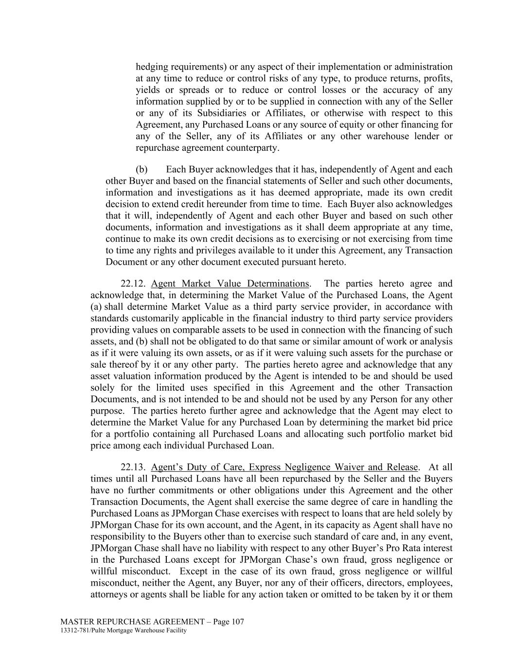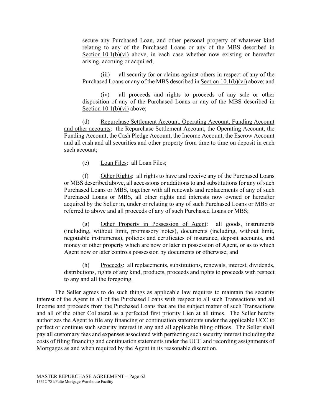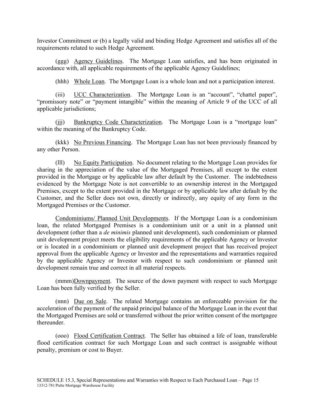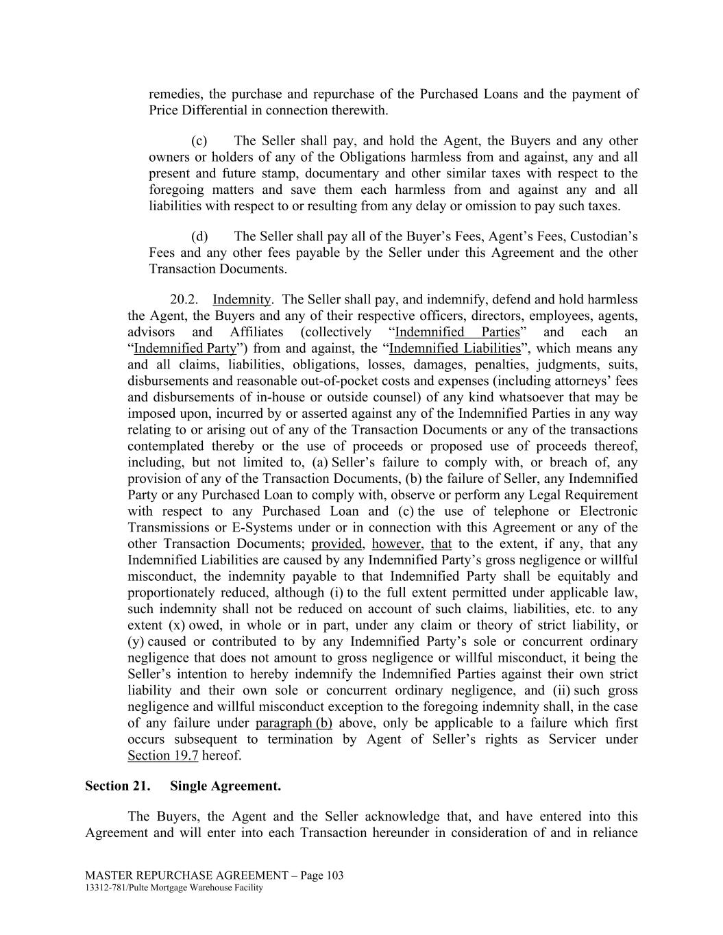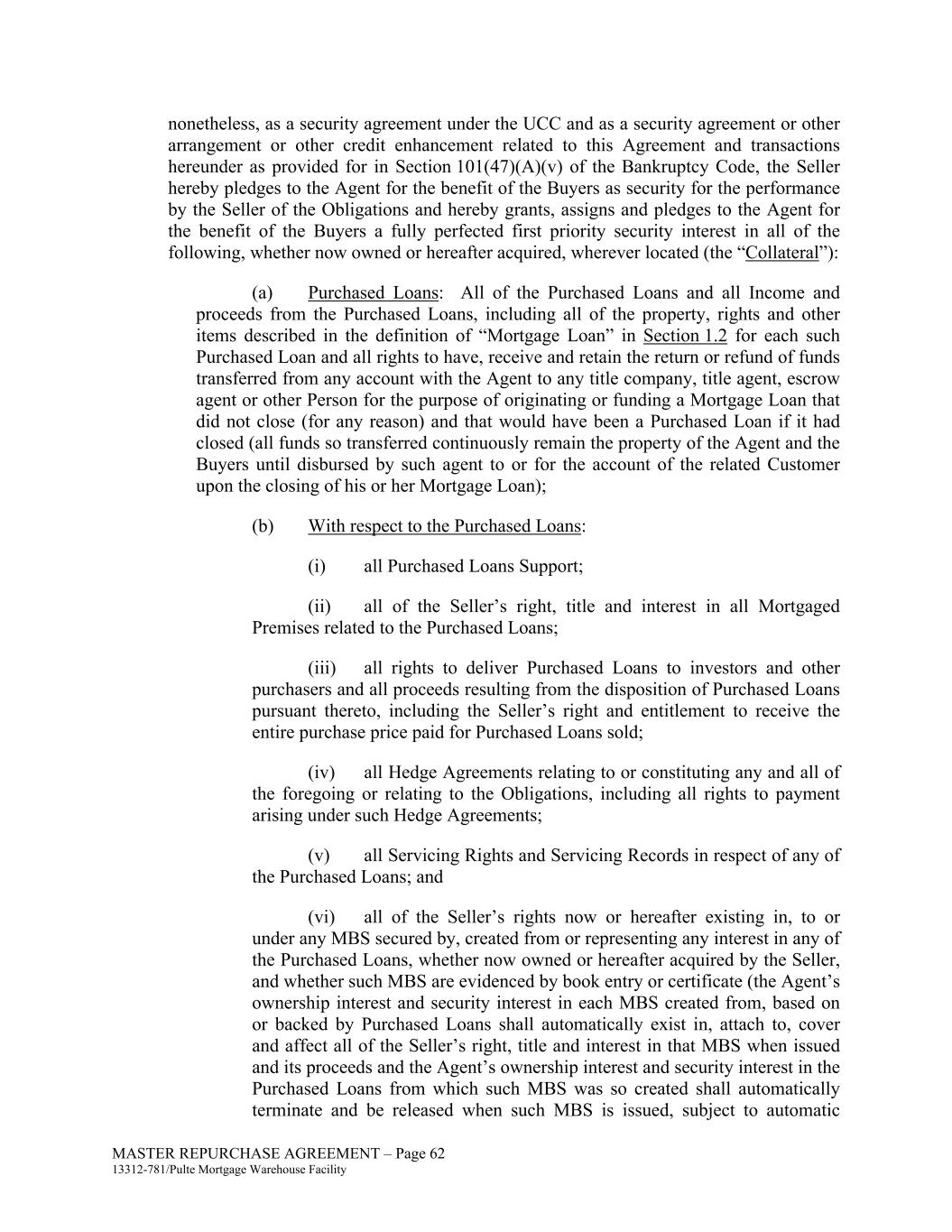 MASTER REPURCHASE AGREEMENT – Page 17 13312-781/Pulte Mortgage Warehouse Facility Mae guidelines, which may be provided under a separate insurance policy), which insurance may be a blanket mortgage impairment policy. “Hedge Agreement” means an Interest Rate Protection Agreement, a Currency Agreement or a forward sales agreement entered into in the ordinary course of the Seller’s or any of its Subsidiaries’ businesses to protect the Seller against changes in interest rates or the market value of assets. “HUD” means the U.S. Department of Housing and Urban Development and any successor. “In Default” means that, as to any Mortgage Loan, any Mortgage Note payment or escrow payment is unpaid for thirty (30) days or more after its due date (whether or not the Seller has allowed any grace period or extended the due date thereof by any means) or another material default has occurred and is continuing, including the commencement of foreclosure or the commencement of a case in bankruptcy for any Customer in respect of such Mortgage Loan. “Income” means, with respect to any Purchased Loan on any day, all payments of principal, interest and other distributions thereon or proceeds thereof paid to the relevant party. “Income Account” means a demand deposit account established by the Seller with JPMorgan Chase and described in Schedule 1.2 under the provisions of Section 8, which shall be subject to the control of the Agent. “Indemnified Liabilities” is defined in Section 20.2. “Indemnified Parties” is defined in Section 20.2. “Interest Rate Protection Agreement” means, with respect to any or all of the Purchased Loans, any short sale of any U.S. Treasury securities, futures contract, mortgage related security, Eurodollar futures contract, options related contract, interest rate swap, cap or collar agreement or similar arrangement providing for protection against fluctuations in interest rates or the exchange of nominal interest obligations, either generally or under specific contingencies, that is entered into by the Seller and a financial institution and is reasonably acceptable to the Agent. “Interim Servicing Term” is defined in Section 19.1. “Internal Revenue Code” means the Internal Revenue Code of 1986 or any subsequent federal income tax law or laws, as amended from time to time. “Investment Property Loan Sublimit” is defined in the table set forth in Section 4.2(d). “Investment Property Mortgage Loan” means an Agency Mortgage Loan secured by Mortgaged Premises which are not occupied by the Customer, which has been underwritten by the Approved Investor who issued an Investor Commitment that covers it and whose underwriting, Investor Commitment, appraisal and all related documentation that the Agent elects to review are approved by the Agent.