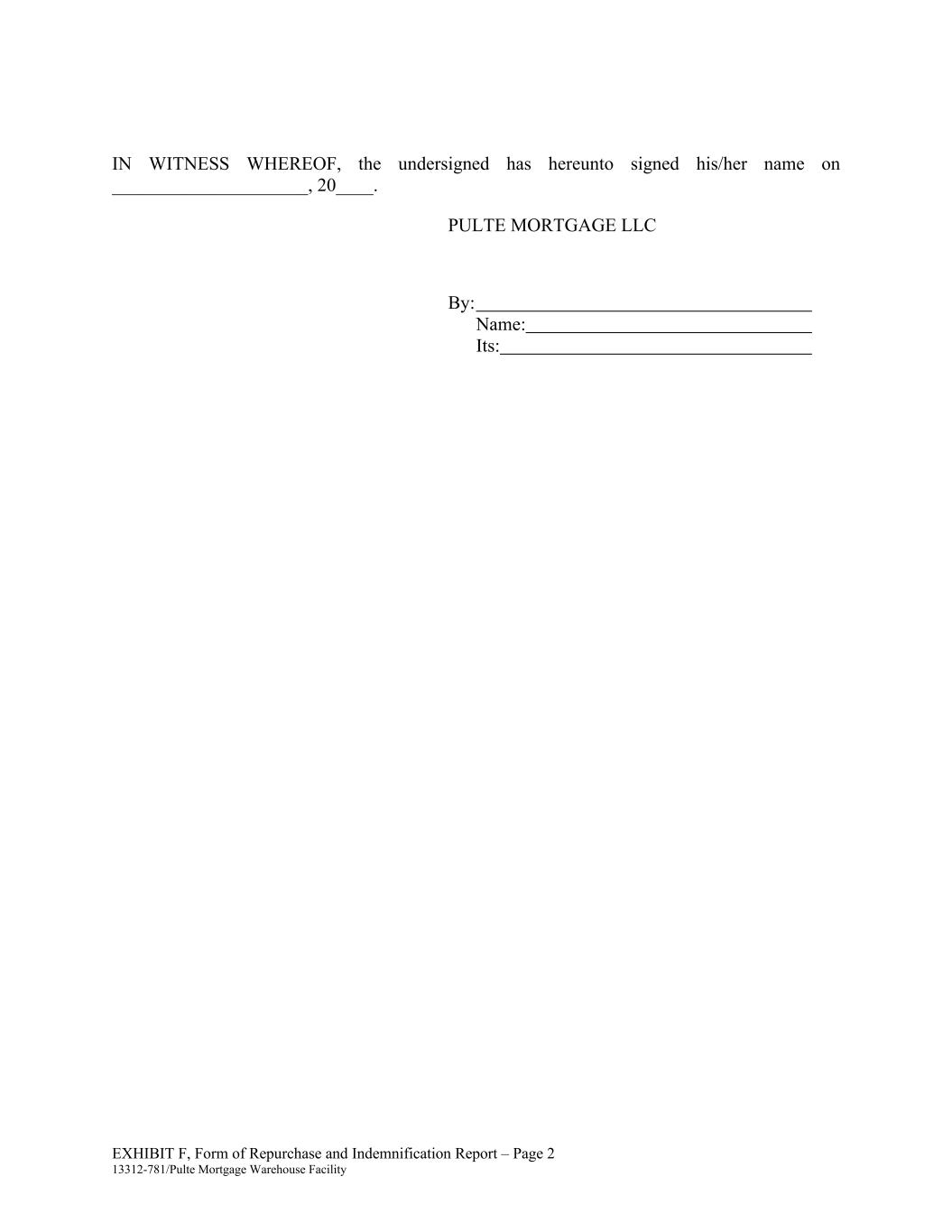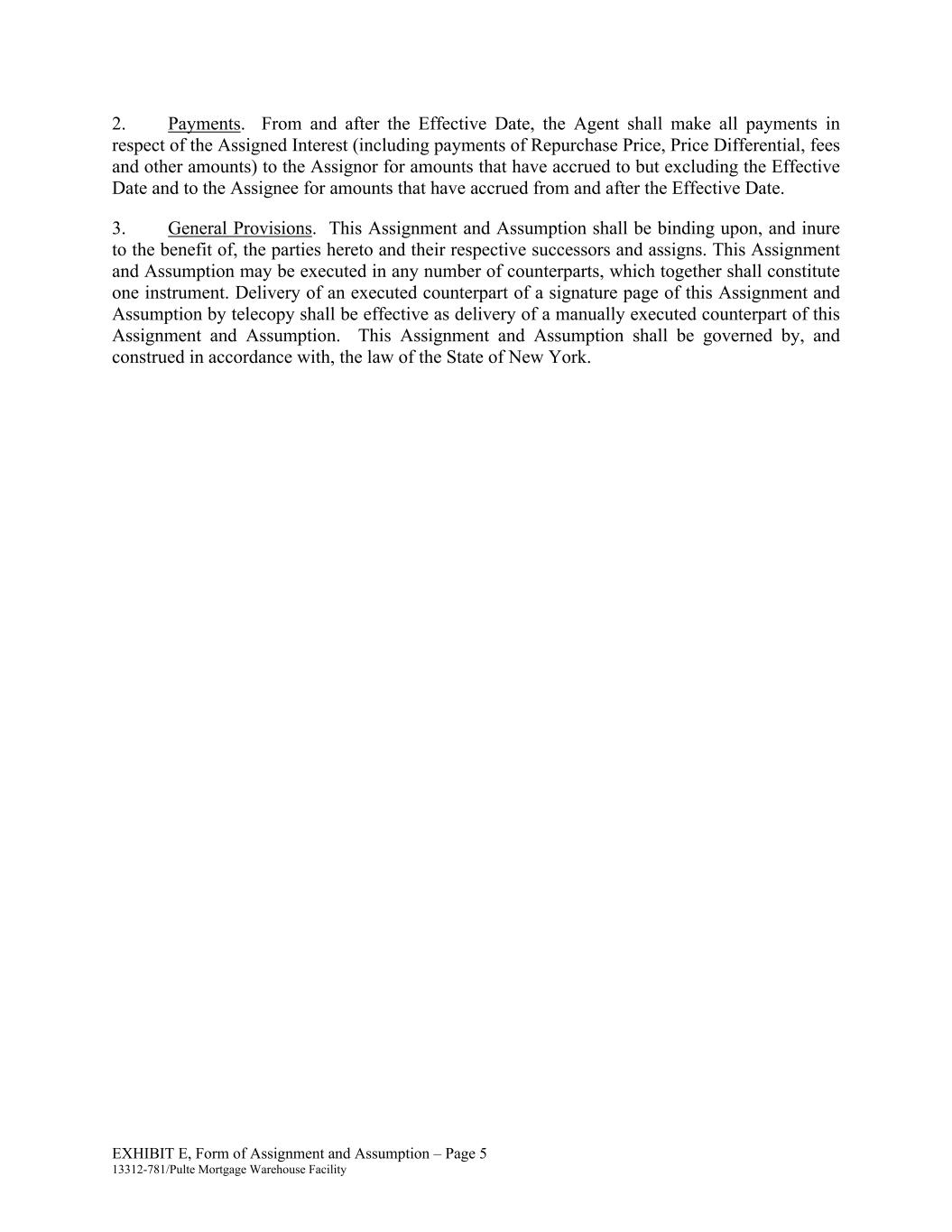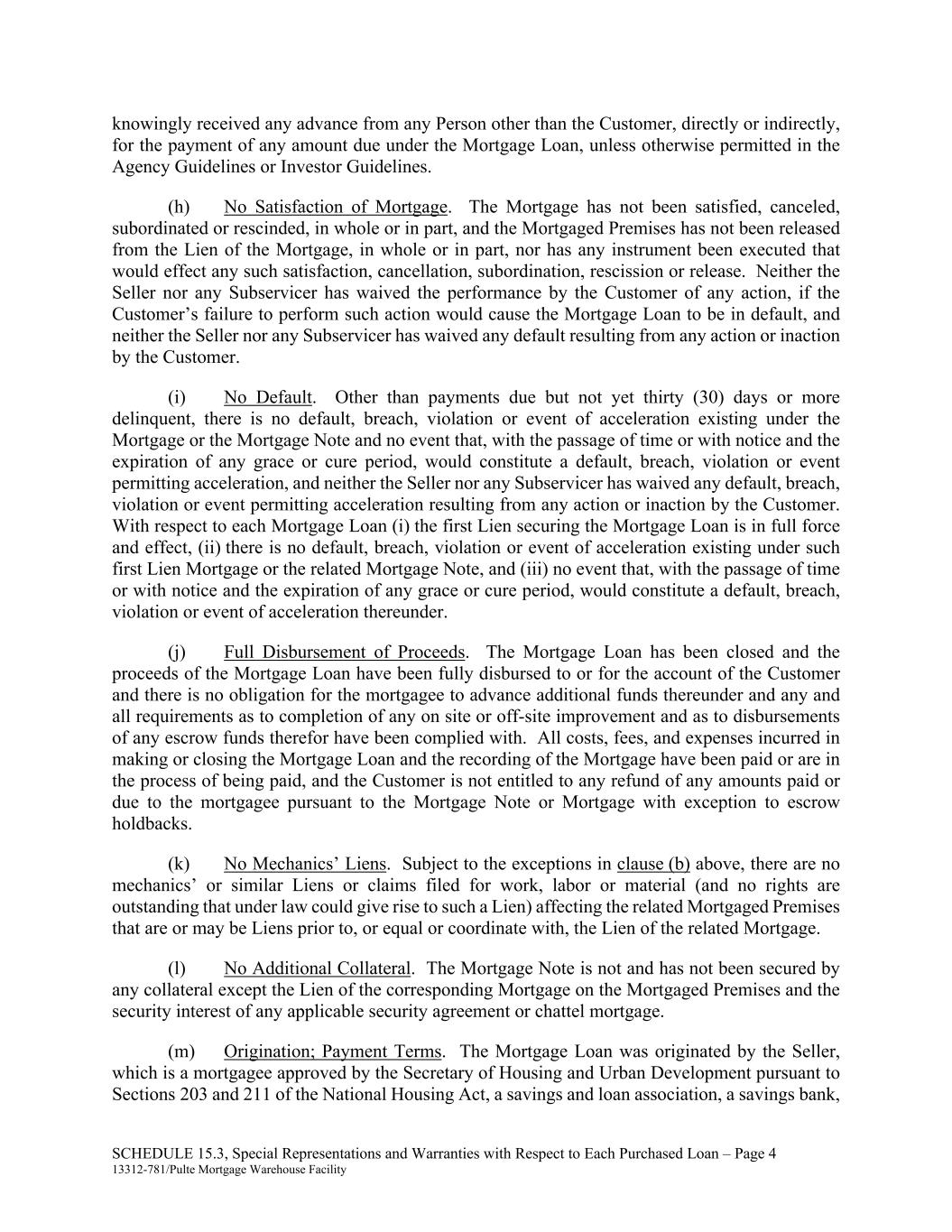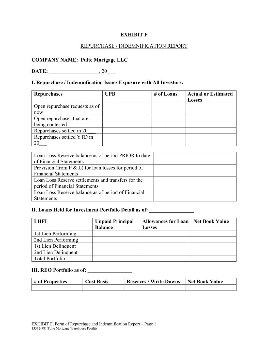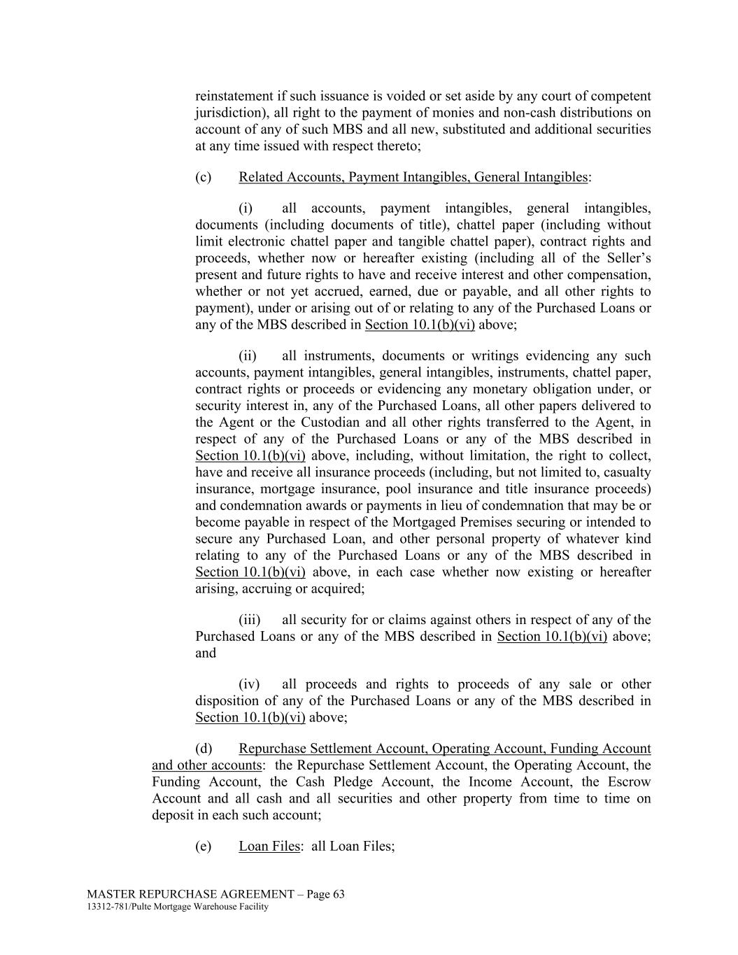 MASTER REPURCHASE AGREEMENT – Page 17 13312-781/Pulte Mortgage Warehouse Facility Mae guidelines, which may be provided under a separate insurance policy), which insurance may be a blanket mortgage impairment policy. “Hedge Agreement” means an Interest Rate Protection Agreement, a Currency Agreement or a forward sales agreement entered into in the ordinary course of the Seller’s or any of its Subsidiaries’ businesses to protect the Seller against changes in interest rates or the market value of assets. “HUD” means the U.S. Department of Housing and Urban Development and any successor. “In Default” means that, as to any Mortgage Loan, any Mortgage Note payment or escrow payment is unpaid for thirty (30) days or more after its due date (whether or not the Seller has allowed any grace period or extended the due date thereof by any means) or another material default has occurred and is continuing, including the commencement of foreclosure or the commencement of a case in bankruptcy for any Customer in respect of such Mortgage Loan. “Income” means, with respect to any Purchased Loan on any day, all payments of principal, interest and other distributions thereon or proceeds thereof paid to the relevant party. “Income Account” means a demand deposit account established by the Seller with JPMorgan Chase and described in Schedule 1.2 under the provisions of Section 8, which shall be subject to the control of the Agent. “Indemnified Liabilities” is defined in Section 20.2. “Indemnified Parties” is defined in Section 20.2. “Interest Rate Protection Agreement” means, with respect to any or all of the Purchased Loans, any short sale of any U.S. Treasury securities, futures contract, mortgage related security, Eurodollar futures contract, options related contract, interest rate swap, cap or collar agreement or similar arrangement providing for protection against fluctuations in interest rates or the exchange of nominal interest obligations, either generally or under specific contingencies, that is entered into by the Seller and a financial institution and is reasonably acceptable to the Agent. “Interim Servicing Term” is defined in Section 19.1. “Internal Revenue Code” means the Internal Revenue Code of 1986 or any subsequent federal income tax law or laws, as amended from time to time. “Investment Property Loan Sublimit” is defined in the table set forth in Section 4.2(d). “Investment Property Mortgage Loan” means an Agency Mortgage Loan secured by Mortgaged Premises which are not occupied by the Customer, which has been underwritten by the Approved Investor who issued an Investor Commitment that covers it and whose underwriting, Investor Commitment, appraisal and all related documentation that the Agent elects to review are approved by the Agent.