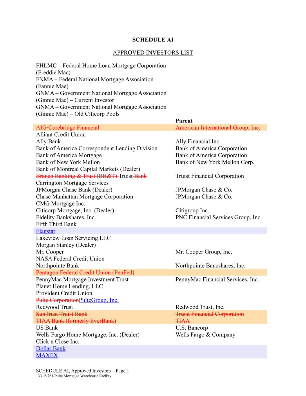 EXHIBIT A-1, Conformed Agreement (Redline) – Cover Page 13312-781/Pulte Mortgage Warehouse Facility Exhibit A-1 CONFORMED AGREEMENT (Redline) (See attached)