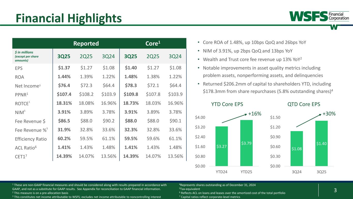 WSFS REPORTS 3Q 2025 EPS OF $1.37, YOY EPS GROWTH OF 27%