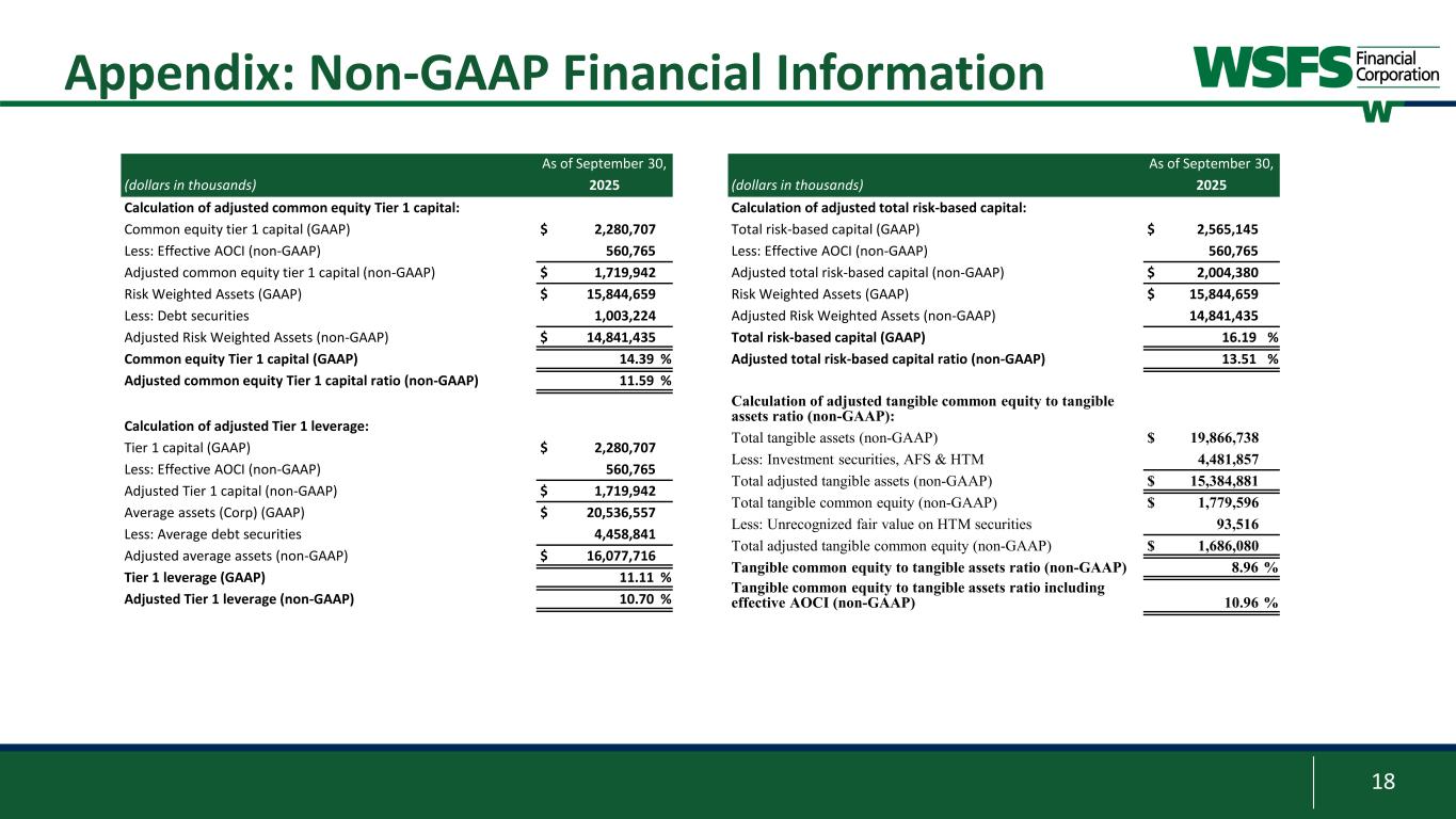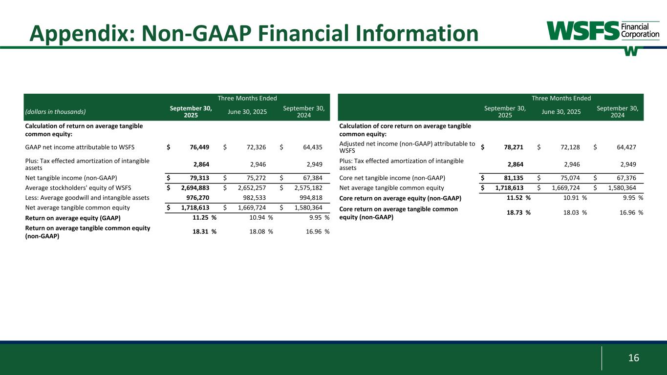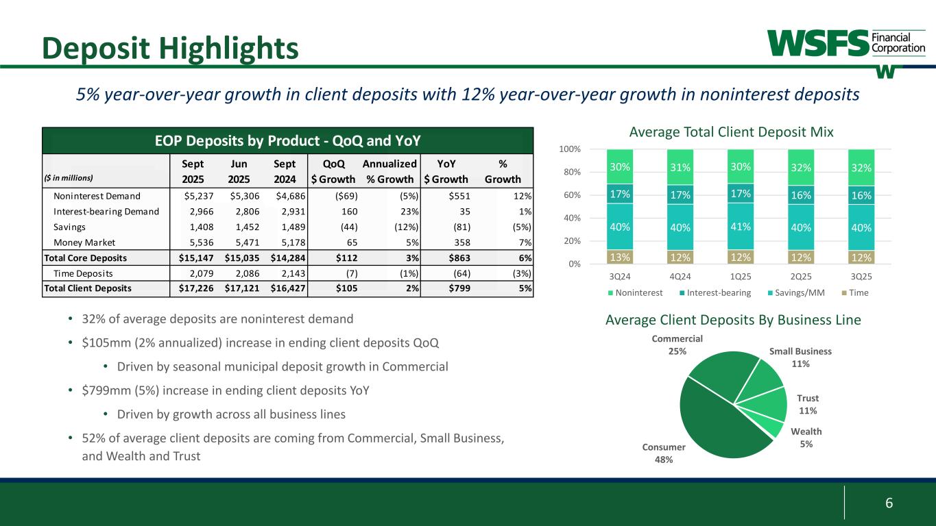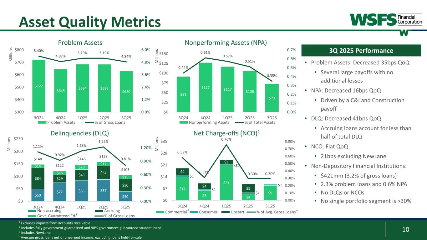 "Client deposits grew 2% (annualized) compared to 2Q 2025 and our WSFS-originated consumer loans grew 13% (annualized) over the prior quarter. We also saw notable improvements across our asset quality metrics, driven by the positive resolution of two large nonperforming loans.