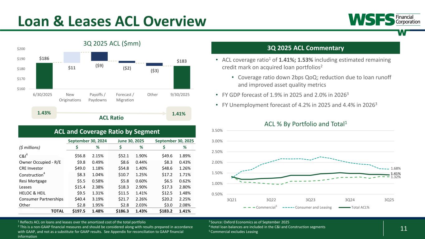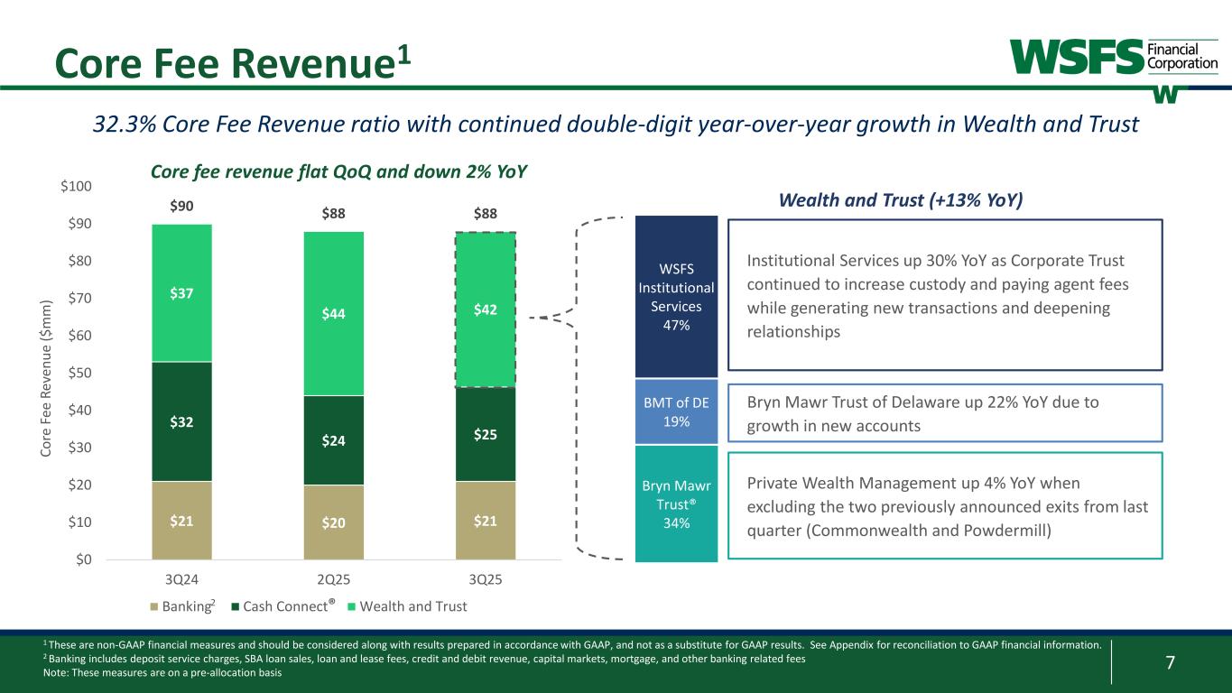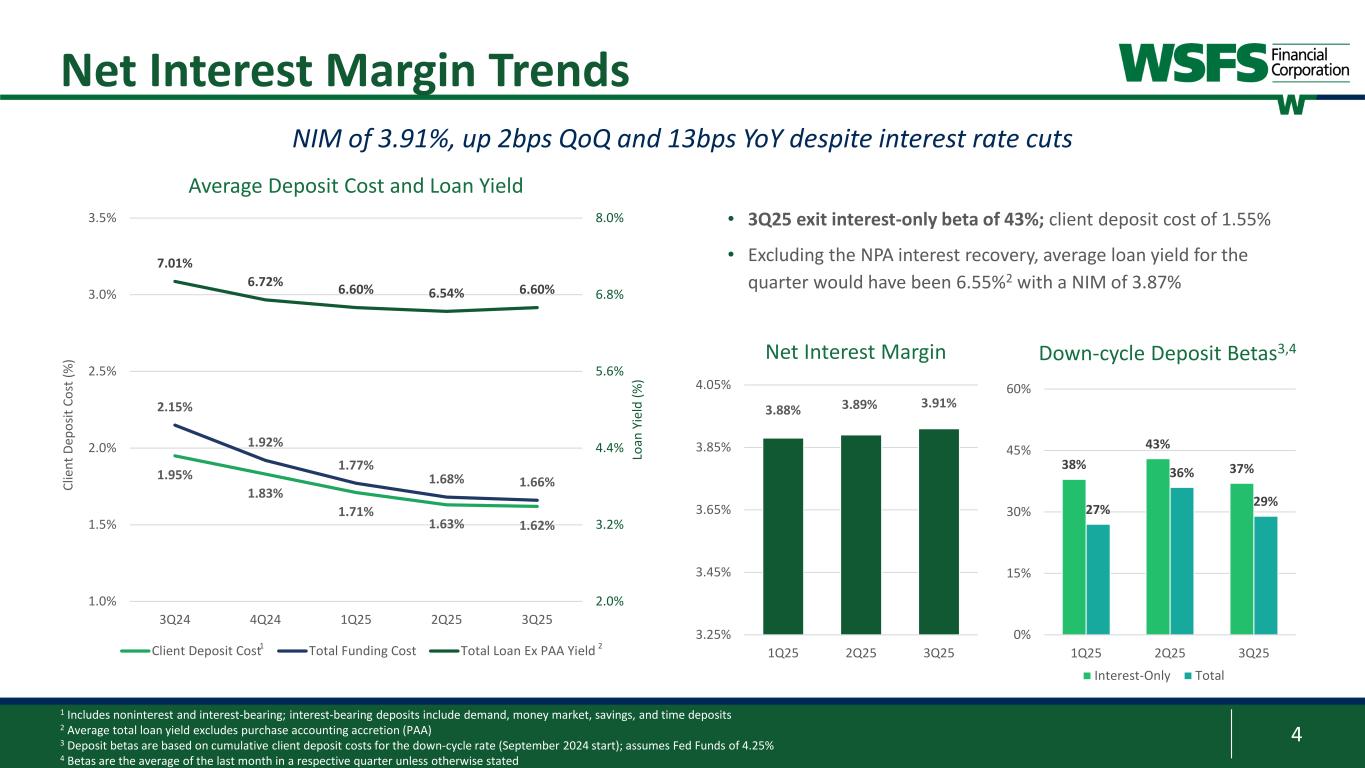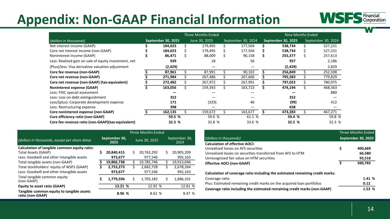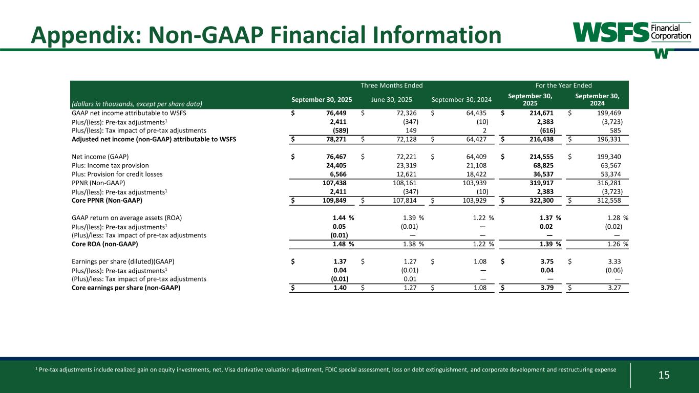 "Client deposits grew 2% (annualized) compared to 2Q 2025 and our WSFS-originated consumer loans grew 13% (annualized) over the prior quarter. We also saw notable improvements across our asset quality metrics, driven by the positive resolution of two large nonperforming loans.