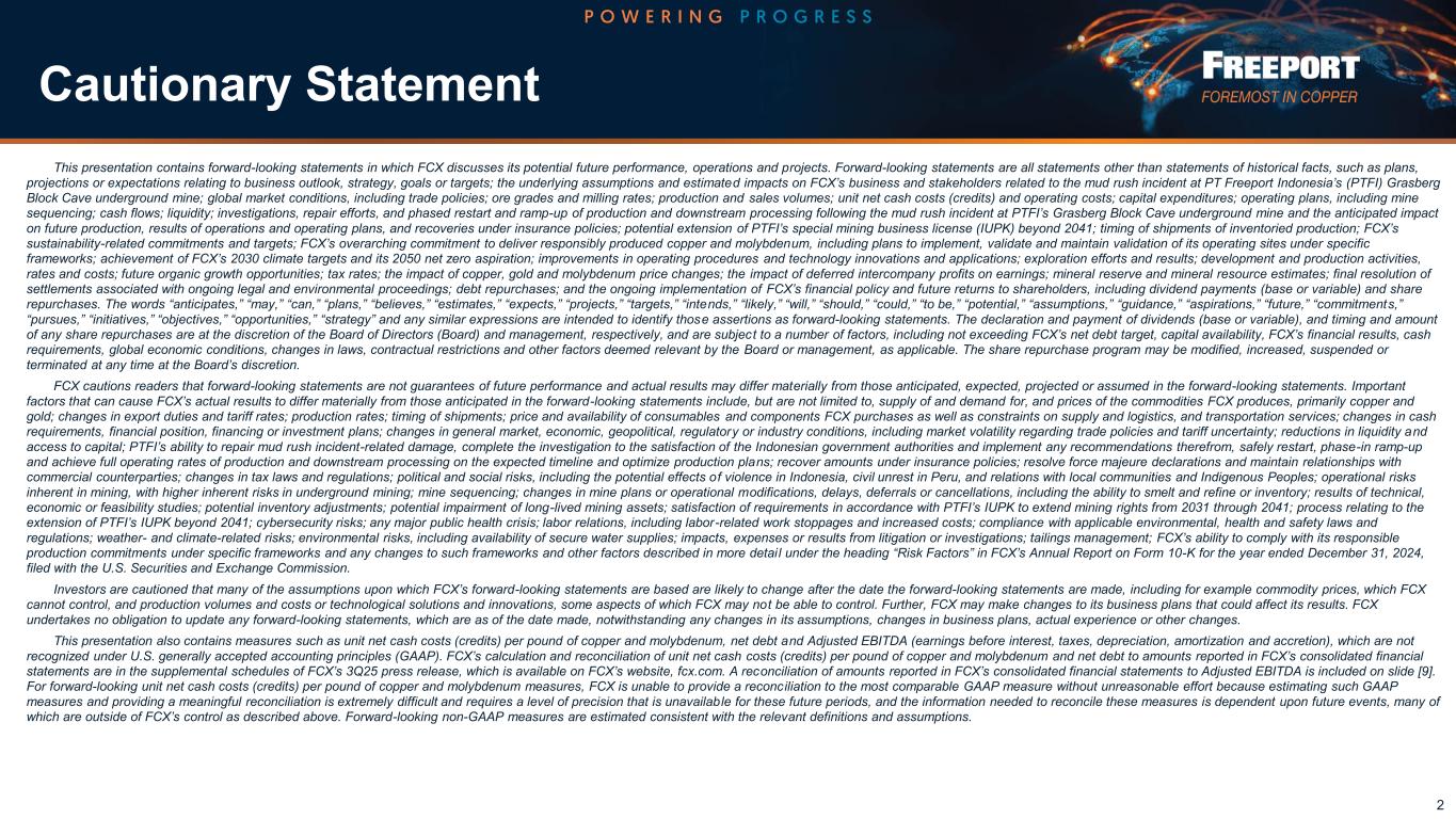 アリゾナ州フェニックス、2025年10月23日 - フリーポート(NYSE: FCX)は、普通株式に帰属する2025年第3四半期の純利益が6億7,400万ドル、1株当たり0.46ドル、主にPTFIでの2025年9月の泥水突進事故に関連した遊休施設費用と回復努力のための合計4,800万ドル、1株当たり0.04ドルの税引き後純費用を除外した後の普通株式に帰属する調整純利益が7億2,200万ドル、1株当たり0.50ドルとなったと発表した。追加情報については、VIIページから始まる補足表「調整後純利益」を参照。