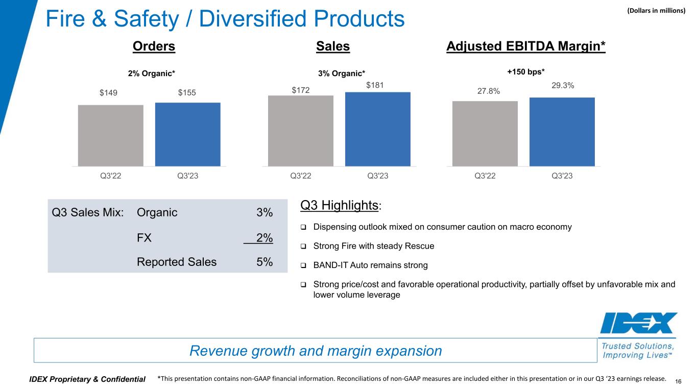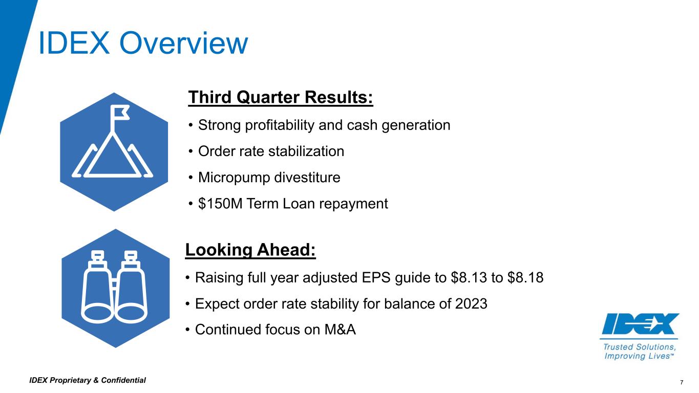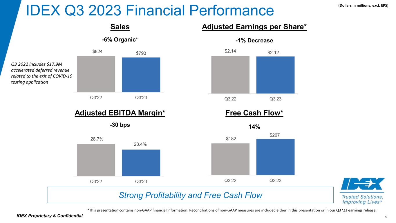 “IDEX delivered strong profitability and achieved record free cash flow in the third quarter,” said Eric D. Ashleman, IDEX Corporation Chief Executive Officer and President. “Our teams continue to execute for customers and shareholders in a dynamic environment of transition and recalibration.”