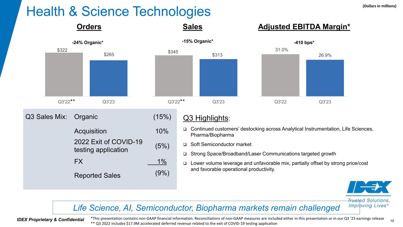 Third quarter 2023 orders of $712.3 million reflected a 9% decrease compared with the prior year period (-11% organic, -2% impact from the exit of a COVID-19 testing application in 2022 that did not reoccur in 2023, +3% acquisitions/divestitures and +1% foreign currency translation).