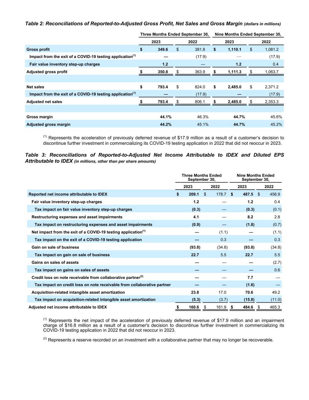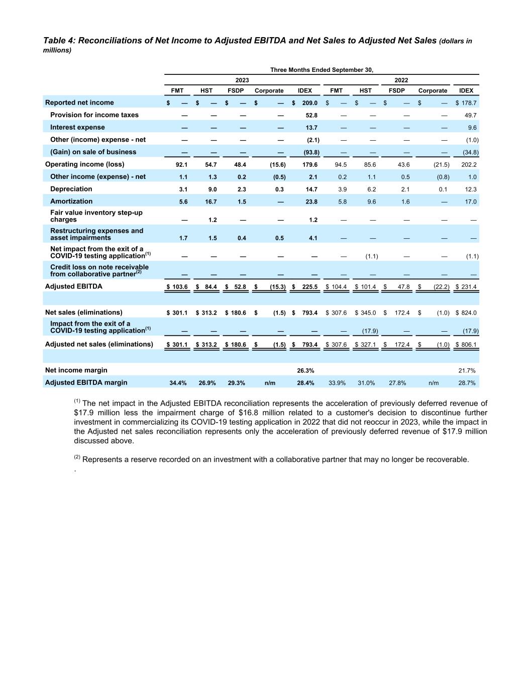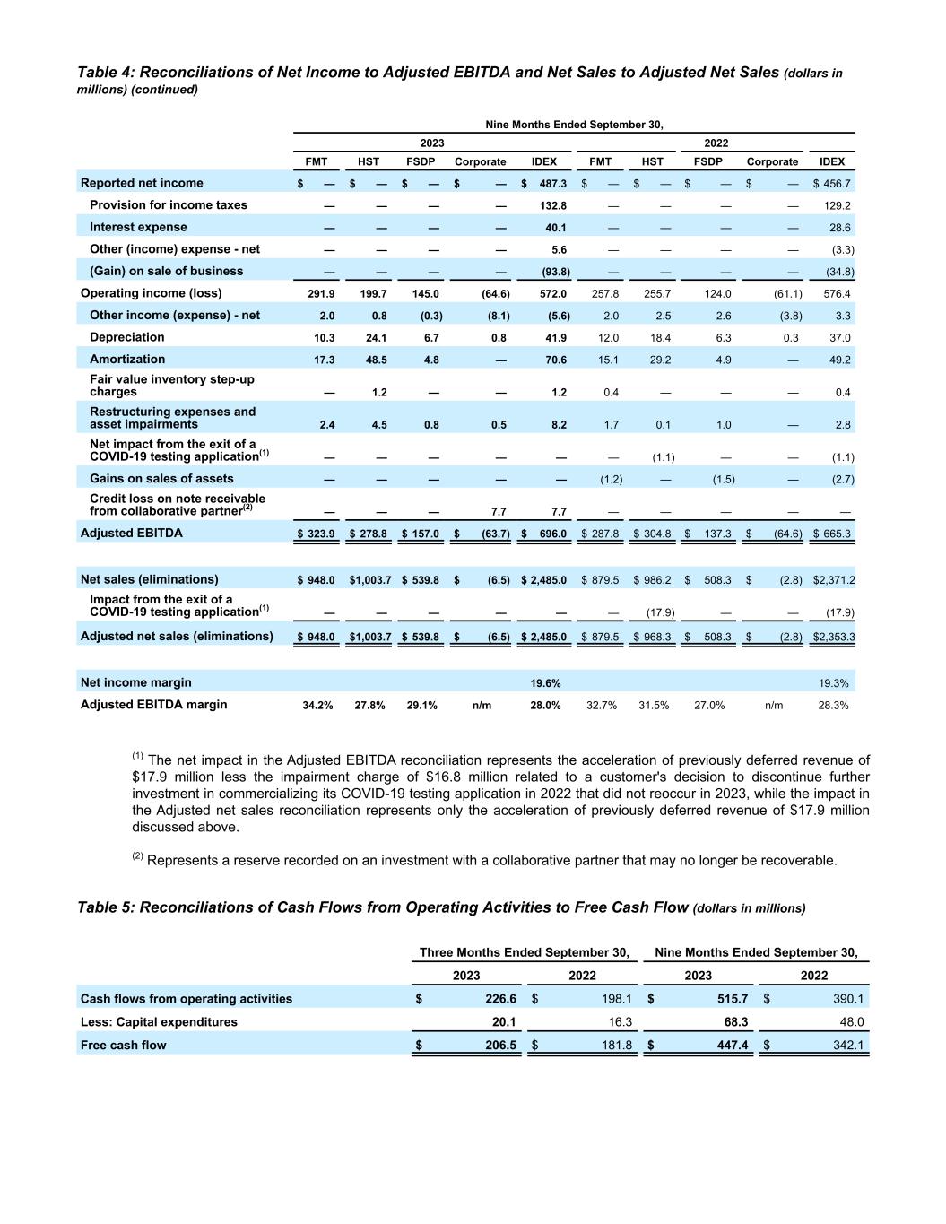 (1) The net impact in the Adjusted EBITDA reconciliation represents the acceleration of previously deferred revenue of $17.9 million less the impairment charge of $16.8 million related to a customer's decision to discontinue further investment in commercializing its COVID-19 testing application in 2022 that did not reoccur in 2023, while the impact in the Adjusted net sales reconciliation represents only the acceleration of previously deferred revenue of $17.9 million discussed above.