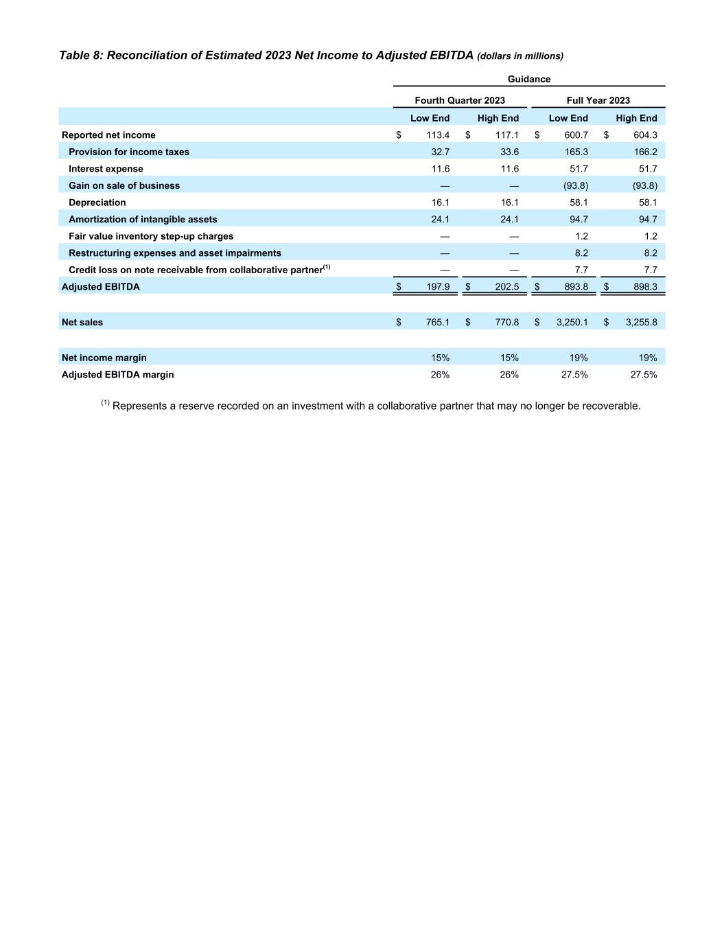 Table 8: Reconciliation of Estimated 2023 Net Income to Adjusted EBITDA (dollars in millions)