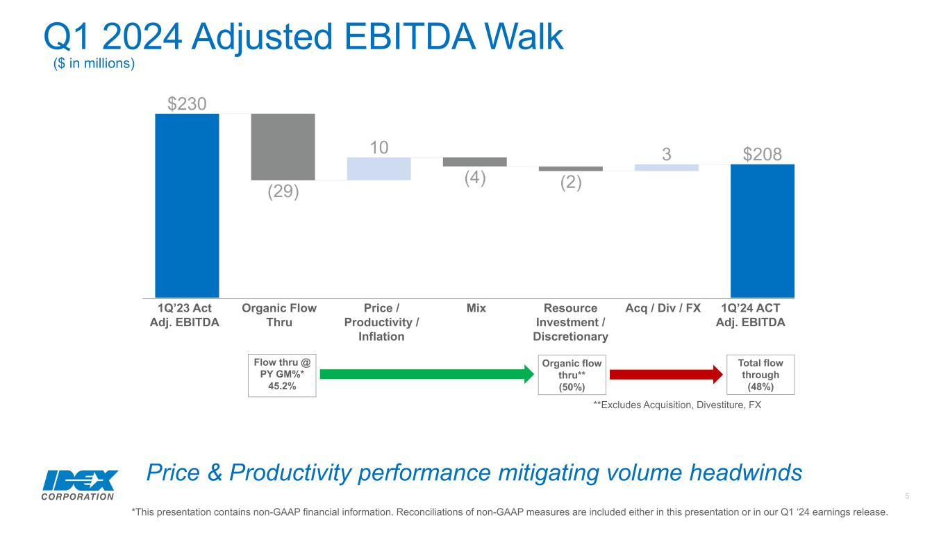 -2024年度第1四半期のオーガニック調整後EBITDAマージンは、主に数量レバレッジの低下、従業員関連費用の増加、不利なミックスにより低下しましたが、良好な業務生産性、裁量支出の減少、堅調な価格/コストにより一部相殺されました。