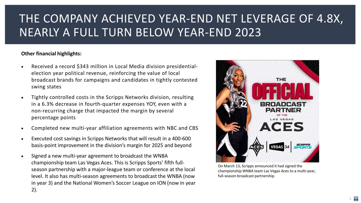 Highlights from our March 12 earnings call: • Executed a transaction support agreement with the majority of our 2026 and 2028 term loan holders to push out our nearest- term maturity while also extending a portion of our 2028 term loan • Entered into commitment letters with accounts receivable securitization providers for a new A/R securitization facility • Paid off the $330 million outstanding on revolving credit facility due to strong cash flow; entered into commitment letter to extend a portion of revolving credit facility through July 2027 • Achieved 2024 year-end net leverage of 4.8x, nearly a full turn below the 2023 level of 5.7x • Completed the sale of San Diego broadcast transmission tower sites for $20 million and reached an agreement on the sale of West Palm Beach station building for $40 million SCRIPPS BROUGHT IN RECORD Q4 REVENUE AND ANNOUNCED AGREEMENT TO REFINANCE ITS NEAREST-TERM MATURITIES 4 A reporter at KSHB in Kansas City interviews a voter ahead of the 2024 presidential election.