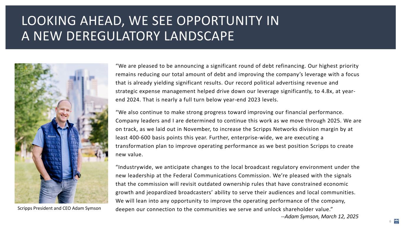 LOOKING AHEAD, WE SEE OPPORTUNITY IN A NEW DEREGULATORY LANDSCAPE 6 “We are pleased to be announcing a significant round of debt refinancing. Our highest priority remains reducing our total amount of debt and improving the company’s leverage with a focus that is already yielding significant results. Our record political advertising revenue and strategic expense management helped drive down our leverage significantly, to 4.8x, at year- end 2024. That is nearly a full turn below year-end 2023 levels. “We also continue to make strong progress toward improving our financial performance. Company leaders and I are determined to continue this work as we move through 2025. We are on track, as we laid out in November, to increase the Scripps Networks division margin by at least 400-600 basis points this year. Further, enterprise-wide, we are executing a transformation plan to improve operating performance as we best position Scripps to create new value. “Industrywide, we anticipate changes to the local broadcast regulatory environment under the new leadership at the Federal Communications Commission. We’re pleased with the signals that the commission will revisit outdated ownership rules that have constrained economic growth and jeopardized broadcasters’ ability to serve their audiences and local communities. We will lean into any opportunity to improve the operating performance of the company, deepen our connection to the communities we serve and unlock shareholder value.”Scripps President and CEO Adam Symson --Adam Symson, March 12, 2025
