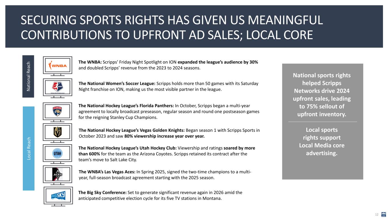 SECURING SPORTS RIGHTS HAS GIVEN US MEANINGFUL CONTRIBUTIONS TO UPFRONT AD SALES; LOCAL CORE 12 N at io na l R ea ch Lo ca l R ea ch The WNBA: Scripps’ Friday Night Spotlight on ION expanded the league’s audience by 30% and doubled Scripps’ revenue from the 2023 to 2024 seasons. The National Women’s Soccer League: Scripps holds more than 50 games with its Saturday Night franchise on ION, making us the most visible partner in the league. The National Hockey League’s Vegas Golden Knights: Began season 1 with Scripps Sports in October 2023 and saw 80% viewership increase year over year. The Big Sky Conference: Set to generate significant revenue again in 2026 amid the anticipated competitive election cycle for its five TV stations in Montana. The National Hockey League’s Utah Hockey Club: Viewership and ratings soared by more than 600% for the team as the Arizona Coyotes. Scripps retained its contract after the team’s move to Salt Lake City. The National Hockey League’s Florida Panthers: In October, Scripps began a multi-year agreement to locally broadcast preseason, regular season and round one postseason games for the reigning Stanley Cup Champions. National sports rights helped Scripps Networks drive 2024 upfront sales, leading to 75% sellout of upfront inventory. Local sports rights support Local Media core advertising. The WNBA’s Las Vegas Aces: In Spring 2025, signed the two-time champions to a multi- year, full-season broadcast agreement starting with the 2025 season.