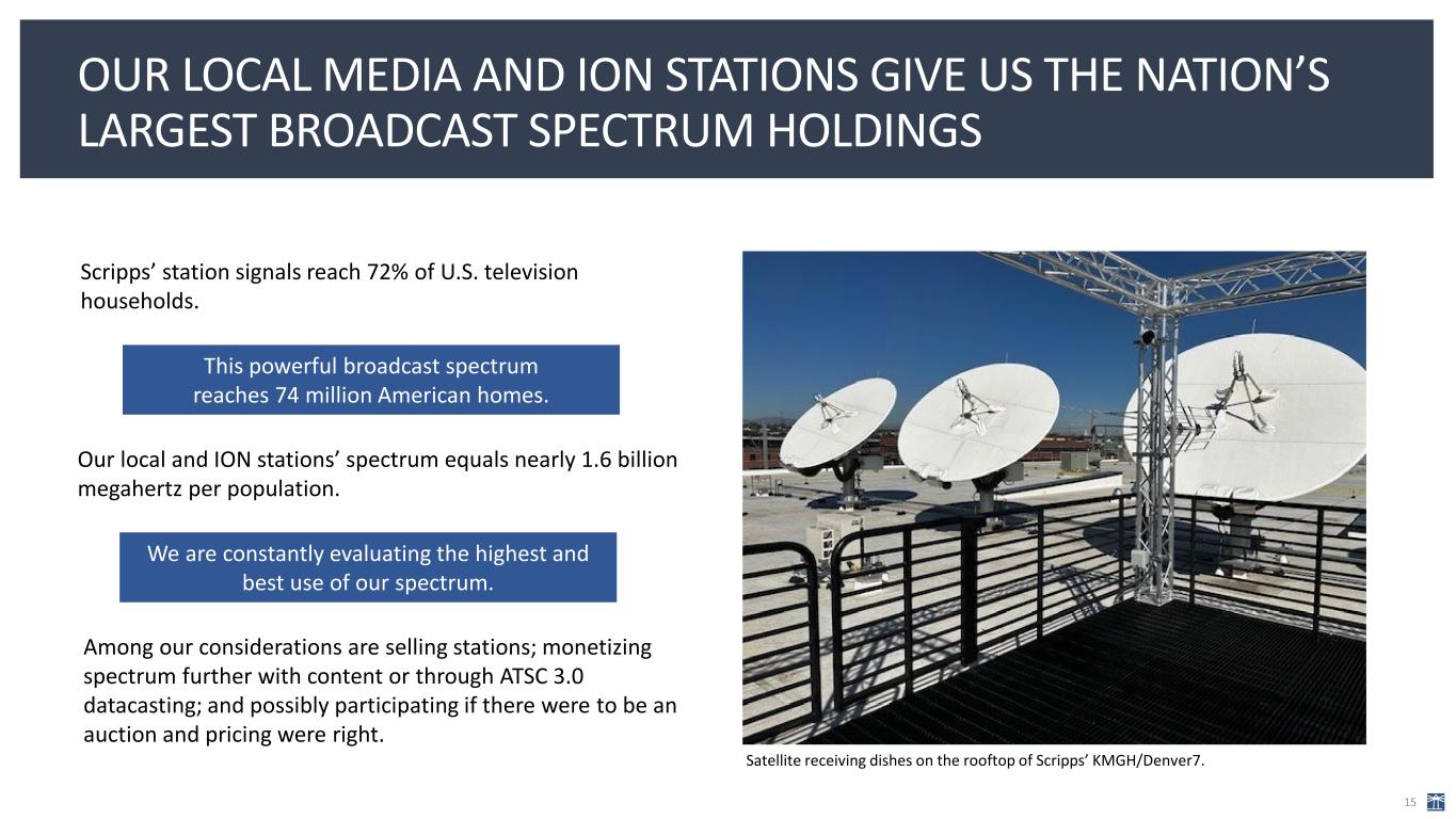 OUR LOCAL MEDIA AND ION STATIONS GIVE US THE NATION’S LARGEST BROADCAST SPECTRUM HOLDINGS Scripps’ station signals reach 72% of U.S. television households. This powerful broadcast spectrum reaches 74 million American homes. Our local and ION stations’ spectrum equals nearly 1.6 billion megahertz per population. We are constantly evaluating the highest and best use of our spectrum. Among our considerations are selling stations; monetizing spectrum further with content or through ATSC 3.0 datacasting; and possibly participating if there were to be an auction and pricing were right. 15 Satellite receiving dishes on the rooftop of Scripps’ KMGH/Denver7.