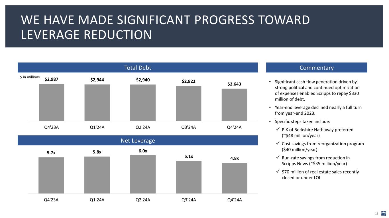 17 WE HAVE PRIORITIZED USING CASH FLOW FOR CONTINUED DEBT REDUCTION Paydown % of Dec. 31, 2020 Debt 38% (4) 14% 5% (5) 11% 14% (6) (1) Represents cumulative discretionary spending as of 4Q’24 (2) Debt paydown net of scheduled debt repayments and refinancings (3) Discretionary use of capital for stock repurchases and dividends (4) 12/31/2020 debt balance pro forma for $800 million Term Loan issued to finance the acquisition of ION on 1/7/2021 (5) Sinclair debt excludes Diamond Sports Group debt (6) 12/31/2020 debt balance pro forma for $1.5 billion Term Loan and $1.3 billion of Senior Notes issued to finance the acquisition of Meredith on 12/1/2021 Debt Paydown (2) M&A All Other Uses (3) TV Peers Discretionary Capital Allocation Since the ION Acquisition (1) 71% 74% 76% 4%1% 1% 0% 4% 76% 99% 28% 25% 20% 20% $1,447 $492 $203 $887 $968 Scripps Tegna Sinclair Ne xstar Gray $ in millions Scripps Financial Policy Leverage • Capital allocation priority is to de-lever via excess cash flow • Long-term target: Low to mid ~3.0x range Liquidity • $278 million revolver accessible through 2026, $208 million through July 2027 • Maintain average cash balance of $15-$20 million Distributions • Preferred equity terms prohibit stock repurchases or common stock dividends while outstanding • Credit agreement prohibits preferred dividends through 2026