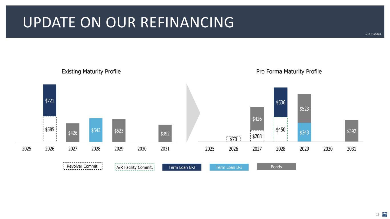 WE HAVE MADE SIGNIFICANT PROGRESS TOWARD LEVERAGE REDUCTION 18 $ in millions • Significant cash flow generation driven by strong political and continued optimization of expenses enabled Scripps to repay $330 million of debt. • Year-end leverage declined nearly a full turn from year-end 2023. • Specific steps taken include: PIK of Berkshire Hathaway preferred (~$48 million/year) Cost savings from reorganization program ($40 million/year) Run-rate savings from reduction in Scripps News (~$35 million/year) $70 million of real estate sales recently closed or under LOI Total Debt Commentary Net Leverage $2,987 $2,944 $2,940 $2,822 $2,643 Q4'23A Q1'24A Q2'24A Q3'24A Q4'24A 5.7x 5.8x 6.0x 5.1x 4.8x Q4'23A Q1'24A Q2'24A Q3'24A Q4'24A