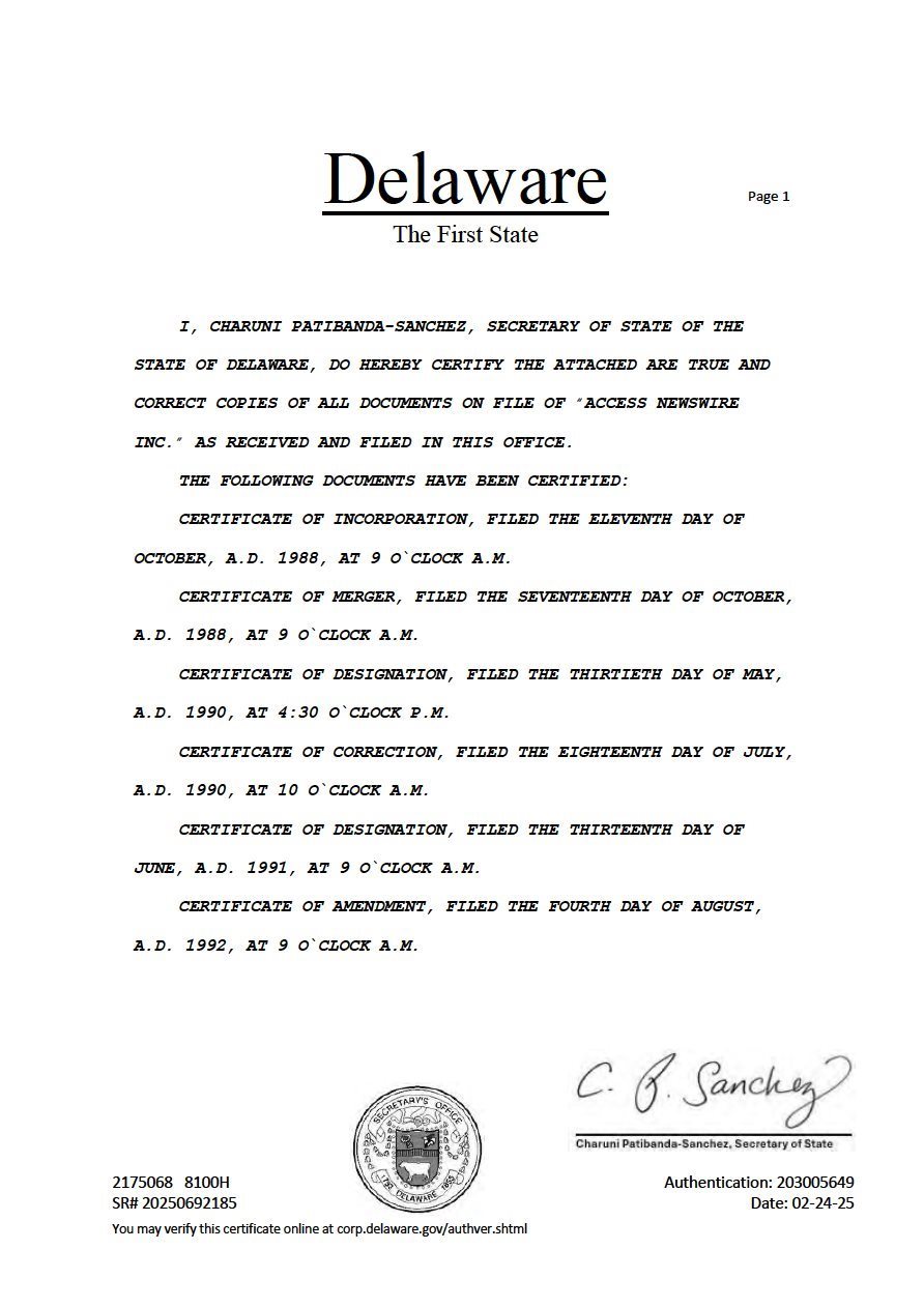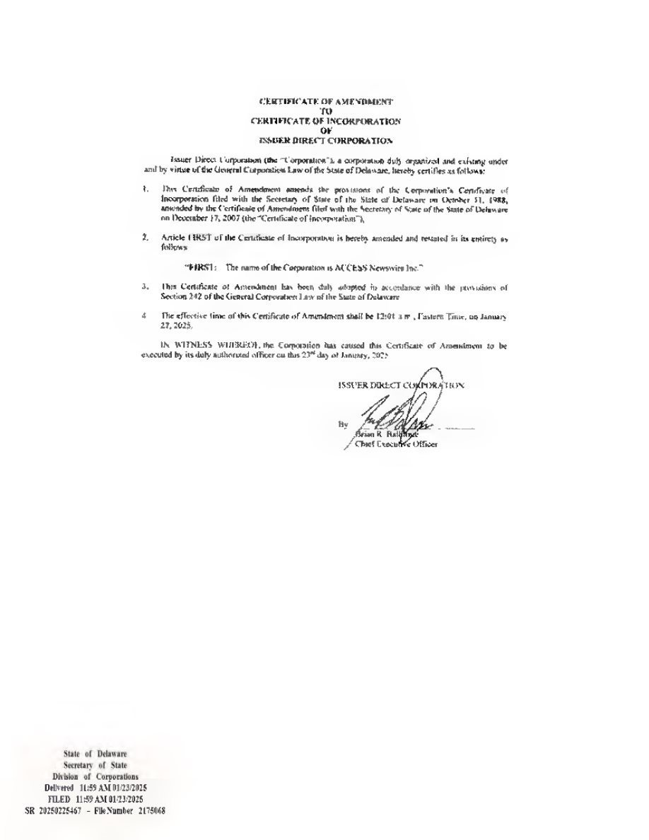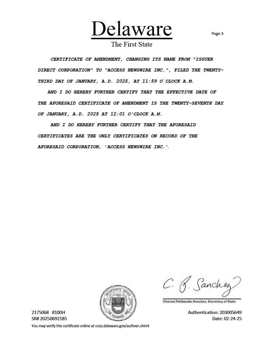 | 1. | I have reviewed this Annual Report on Form 10-K of ACCESS Newswire Inc.; |