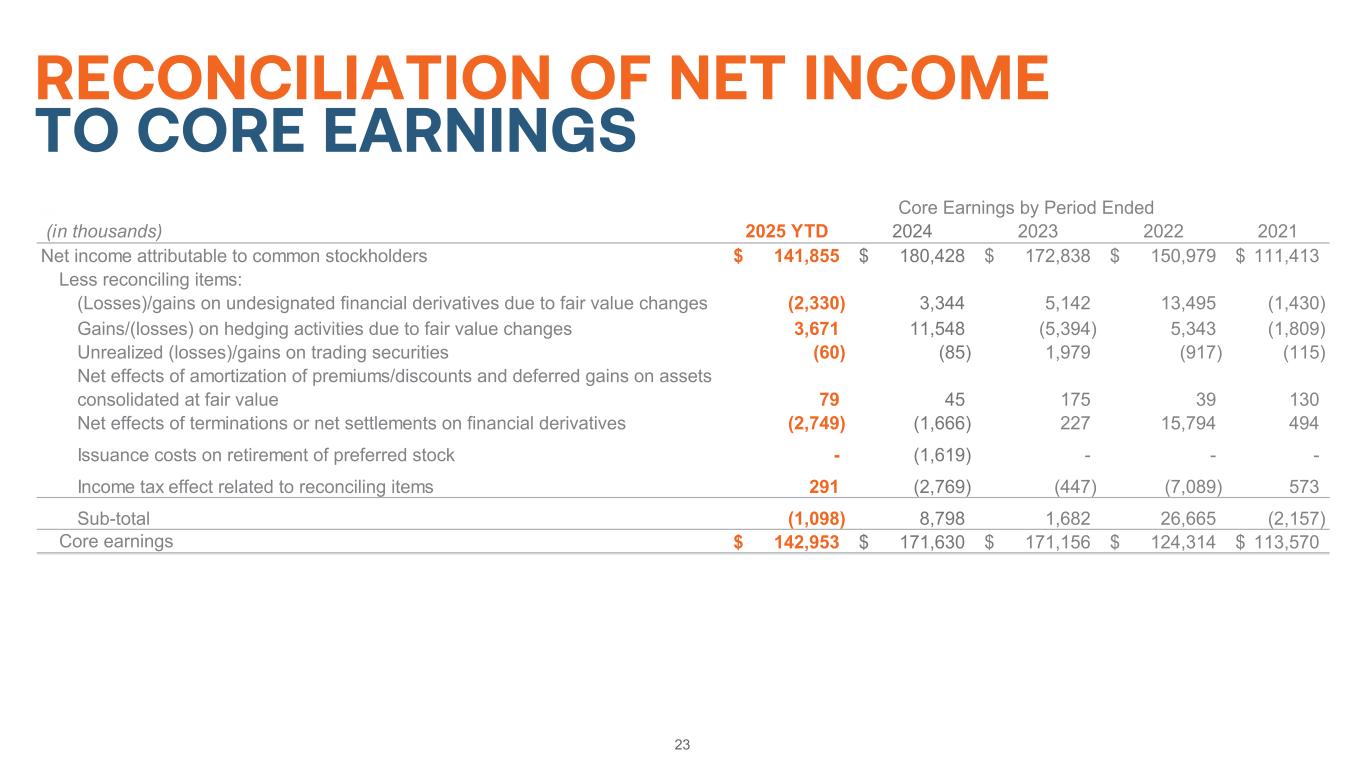 非GAAP基準のコア利益およびコア普通株式1株当たり利益(以下「コアEPS」)と、GAAP基準の普通株主に帰属する当期純利益および普通株式1株当たり利益(以下「EPS」)の主な違いは、これらの非GAAP基準が公正価値の変動の影響を除外していることです。これらの変動は、関連する金融商品が予想通り満期まで保有される場合、GAAPに従って報告されるファーマーマックの財務状況や経営成績に累積的な正味の影響を与えないと予想されます。もう1つの違いは、これら2つの非GAAPベースの指標は、将来の営業成績を示すものではないと考えられ、ファーマーマックの中核事業の動向や経済的財務実績を反映しない可能性のある、特定の不定期または異常な取引を除外していることです。例えば、2024 年第 3 四半期には、シリーズ C 優先株式の消却に伴う損失をコア利益およびコア EPS から除外しましたが、これは優先株式の消却に伴う損失に関するファーマーマックの過去の取り扱いと一致しています。