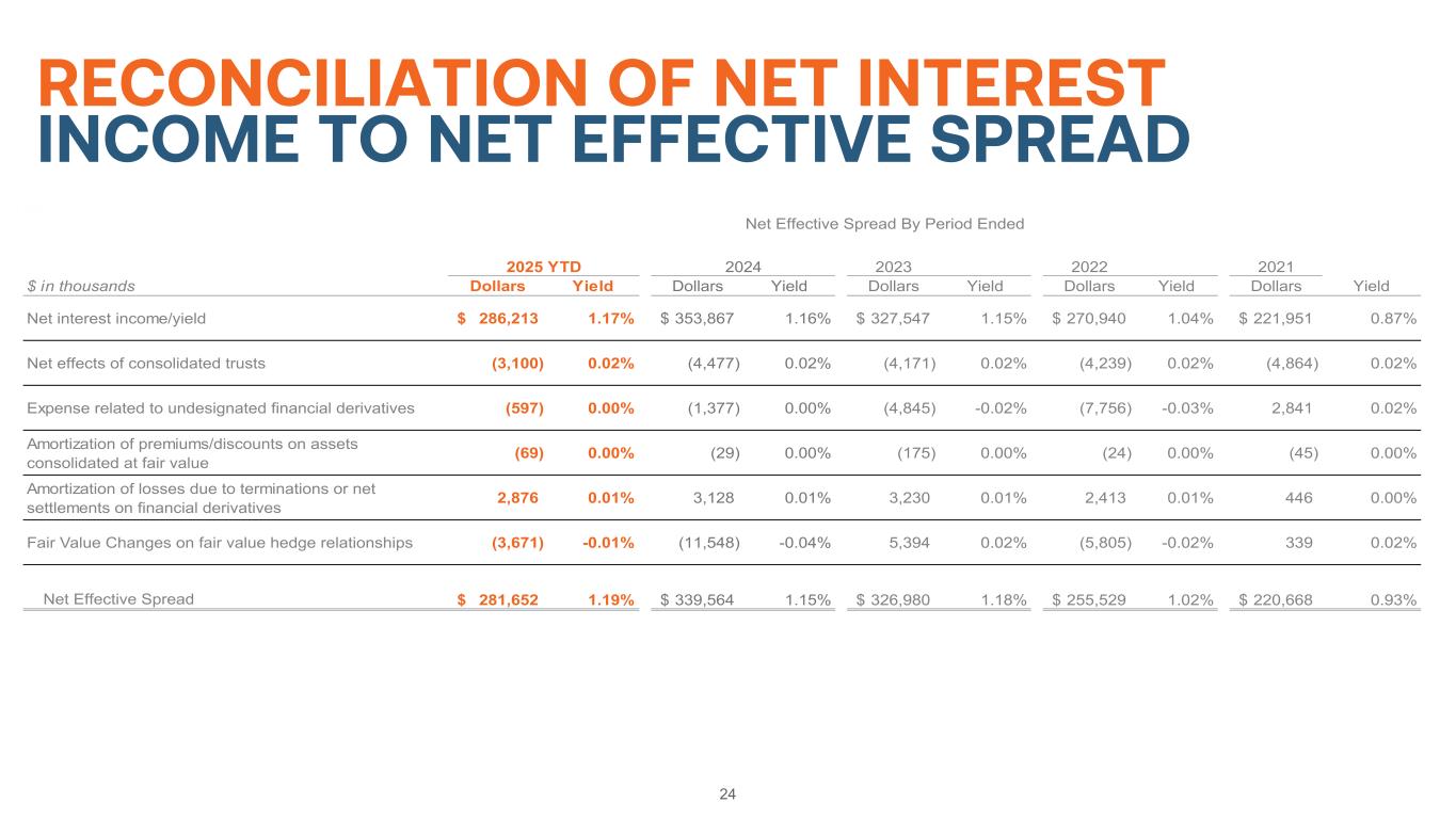 ファーマーマックの非GAAP基準の使用に関する詳細は、2025年2月21日にSECに提出された2024年12月31日終了年度のファーマーマックの年次報告書(フォーム10-K)の「経営陣による財政状態および経営成績の検討および分析-経営成績」に記載されている。ファーマーマックの普通株主に帰属する当期純利益とコア利益、および普通株式1株当たり利益とコア1株当たり利益の調整、ならびに純利息収益および純利息利回りと純有効スプレッドの調整については、以下の「調整」をご参照ください。
