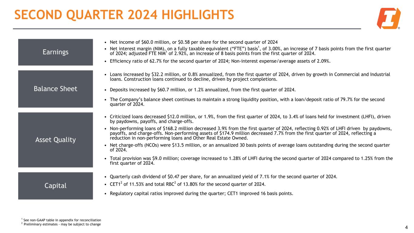 ファースト・インターステート・バンシステム(NASDAQ: FIBK)(以下「当行」)は本日、2024 年第 2 四半期の決算を発表しました。これは、2024 年第 1 四半期の純利益 5,840 万ドル(1 株当たり 0.57 ドル)、2023 年第 2 四半期の純利益 6,700 万ドル(1 株当たり 0.65 ドル)と比較したものです。