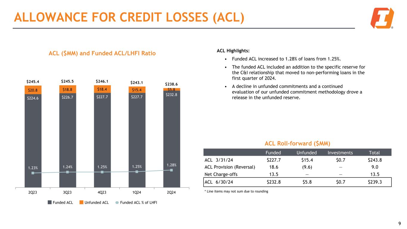 これに対し、2024 年第 1 四半期の正味貸倒引当金は 840 万ドル(年率 0.18%)、2023 年第 2 四半期の正味貸倒引当金は 1,140 万ドル(年率 0.25%)でした。2024年第2四半期の正味貸出金償却は、1,630万ドルの償却で、これには建設用不動産ローンに関連する680万ド ルの特別引当金の償却と、280万ドルの回収が含まれています。