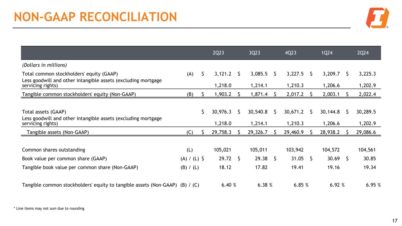 米国で一般に公正妥当と認められた会計原則(GAAP)に従って表示された業績に加えて、本プレスリリースには、経営陣が自己資本比率基準に照らして当グループの業績を評価するために使用する、以下の非GAAP財務指標が含まれています:(i)有形普通株主資本、(ii)有形資産、(iii)普通株式1株当たり有形簿価、(iv)有形普通株主資本/有形資産、(v)平均有形普通株主資本、(vi)平均有形普通株主資本利益率、(vii)純FTE受取利息、(viii)純FTE利ざや比率、(ix)調整後純FTE受取利息、および(x)調整後純FTE利ざや比率。有形普通株主資本は、普通株主資本合計から営業権およびその他の無形資産(モーゲージ・サービシング・ライツを除く)を控除したものである。有形固定資産は、総資産から営業権およびその他の無形固定資産(モーゲージ・サービシング権利を除く)を控除したものである。普通株式1株当たり有形簿価は、有形普通株主資本を発行済普通株式で除したものである。有形株主資本/有形固定資産」は、有形株主資本を有形固定資産で除したものである。平均有形普通株主資本は、平均株主資本から平均のれんおよびその他無形資産(モーゲージ・サービシング・ライツを除く)を控除したものである。平均有形普通株主資本利益率は、普通株主に帰属する当期純利益を平均有形普通株主資本で除したものである。正味支払利息は、正味受取利息を含むように調整した純受取利息として算出される。ネット FTE インタレスト・マージン比率は、ネット FTE インタレスト・インカムを平均受取利息資産で除したものである。調整後正味 FTE 受取利息は、買収した貸出金にかかるパーチェス法による利息増 加分を除いた正味 GTE 受取利息として計算されます。調整後正味 FTE 金利マージン率は、調整後正味 FTE 金利収益を平均受取利息資産で除したものです。これらの非GAAPベースの財務指標は、他社が同じ方法で算出していない可能性があるため、他社が報告する同様の名称の財務指標と比較できない場合があります。また、これらの指標を単独で、あるいはGAAPに準拠して作成された指標の代替指標として考慮すべきではありません。