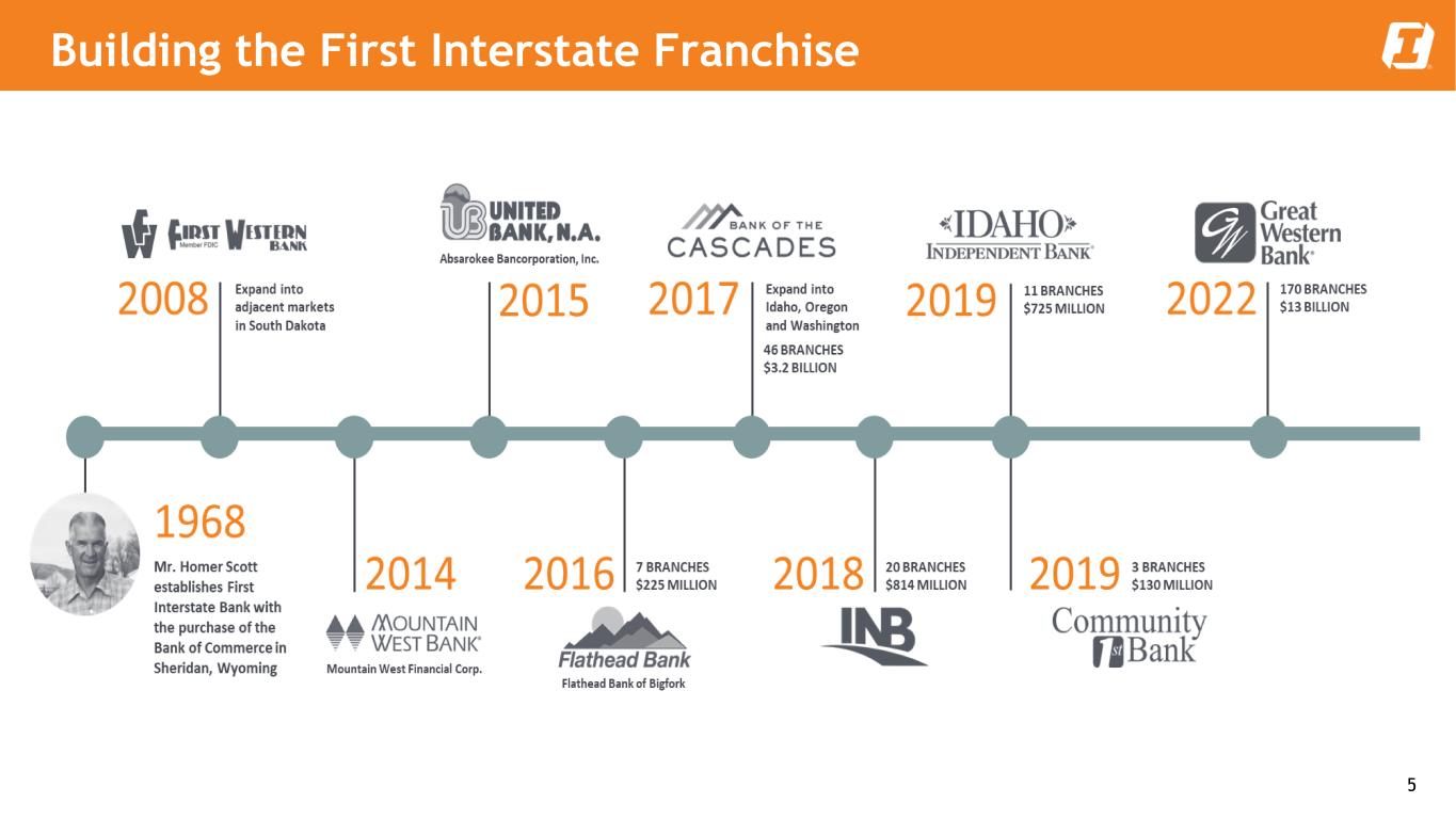 4 First Interstate BancSystem, Inc. Overview Premier community banking institution in growing markets throughout the Midwest and Pacific Northwest Financial Highlights Balance Sheet Capital Assets $28.3 Billion Total RBC(4) 14.93% LHFI(2) $17.4 Billion CET1(5) 12.53% Deposits $22.7 Billion Leverage 9.06% ACL(3)/LHFI 1.24% TCE to TA ratio(6) 8.01% Corporate Overview Headquarters Exchange/Listing Market Capitalization(1) Annualized Dividend Yield(1) Branch Network Billings, MT NASDAQ: FIBK $2.8 Billion 7.0% ~300 banking offices (7) Note: Financial data as of 3/31/2025; market data as of 5/28/2025. (1) Calculated using closing stock price of $26.79 as of 5/28/2025. (2) Loans Held for Investment (LHFI). (3) Allowance for credit losses (ACL). (4) Risk based capital (RBC). (5) Common equity tier-1 (CET1). (6) Tangible common stockholders’ equity (TCE) to tangible assets (TA) ratio. Represents a Non-GAAP financial measure. See Non-GAAP Financial Measures included in Appendix for a reconciliation to this measure’s most directly comparable GAAP financial measure. (7) Arizona and Kansas branches (12 branches total) under agreement to be sold to Enterprise Bank & Trust. (7) (7)