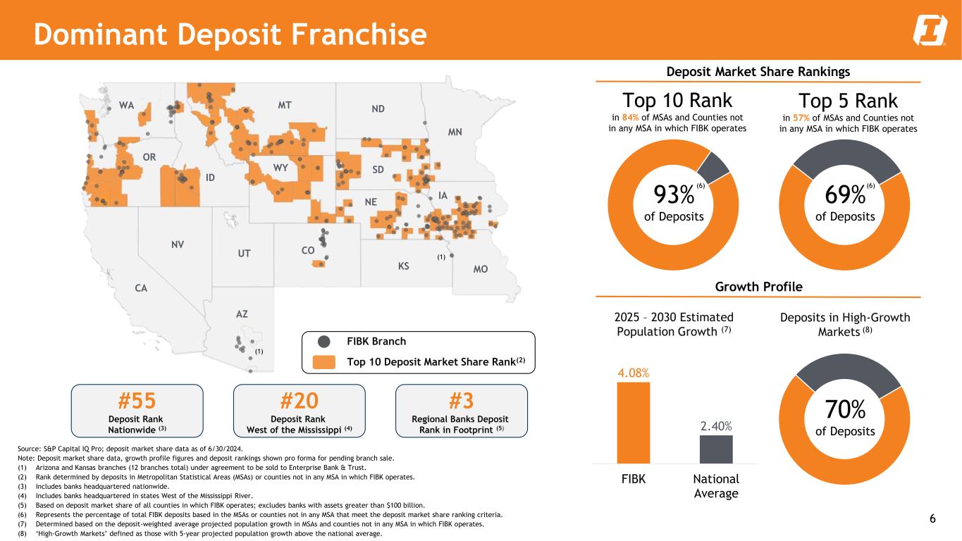6 Source: S&P Capital IQ Pro; deposit market share data as of 6/30/2024. Note: Deposit market share data, growth profile figures and deposit rankings shown pro forma for pending branch sale. (1) Arizona and Kansas branches (12 branches total) under agreement to be sold to Enterprise Bank & Trust. (2) Rank determined by deposits in Metropolitan Statistical Areas (MSAs) or counties not in any MSA in which FIBK operates. (3) Includes banks headquartered nationwide. (4) Includes banks headquartered in states West of the Mississippi River. (5) Based on deposit market share of all counties in which FIBK operates; excludes banks with assets greater than $100 billion. (6) Represents the percentage of total FIBK deposits based in the MSAs or counties not in any MSA that meet the deposit market share ranking criteria. (7) Determined based on the deposit-weighted average projected population growth in MSAs and counties not in any MSA in which FIBK operates. (8) ‘High-Growth Markets’ defined as those with 5-year projected population growth above the national average. WA OR CA NV UT AZ CO KS MO IA MN NDMT ID WY NE SD #3 Regional Banks Deposit Rank in Footprint (5) #20 Deposit Rank West of the Mississippi (4) #55 Deposit Rank Nationwide (3) Deposit Market Share Rankings Growth Profile Top 10 Rank in 84% of MSAs and Counties not in any MSA in which FIBK operates Top 5 Rank in 57% of MSAs and Counties not in any MSA in which FIBK operates 93% of Deposits 69% of Deposits 70% of Deposits 2025 – 2030 Estimated Population Growth (7) Deposits in High-Growth Markets (8) 4.08% 2.40% FIBK National Average Top 10 Deposit Market Share Rank(2) Dominant Deposit Franchise FIBK Branch (1) (1) (6) (6)