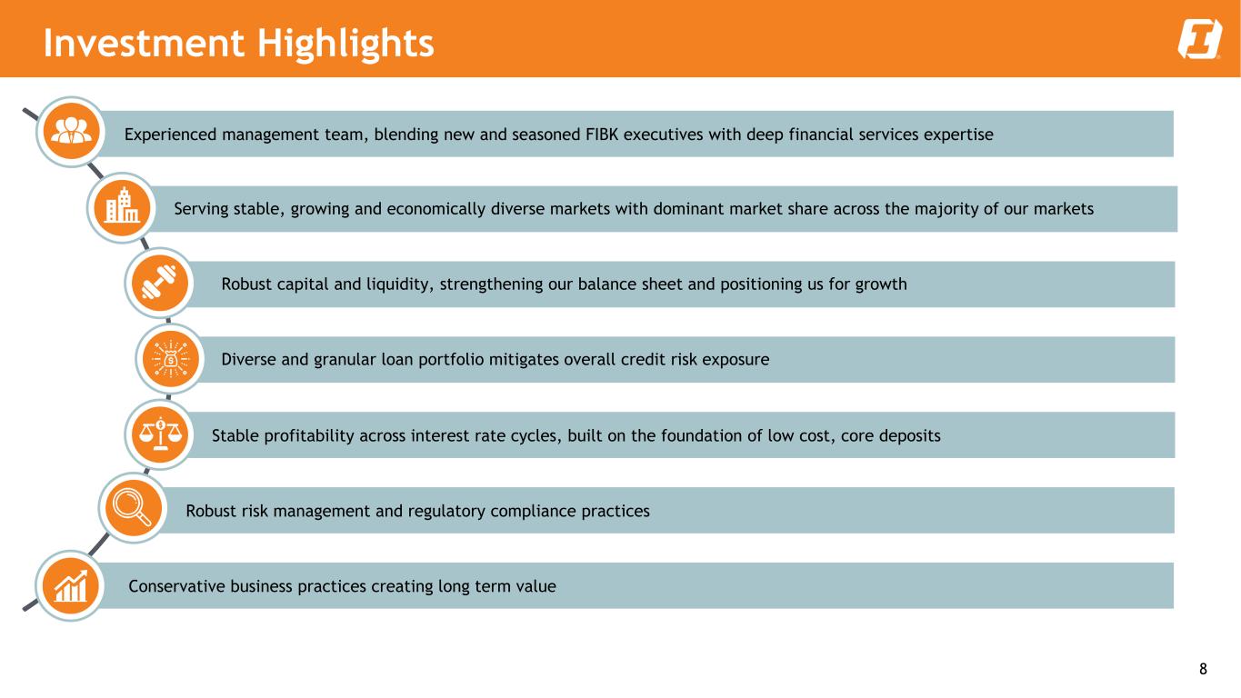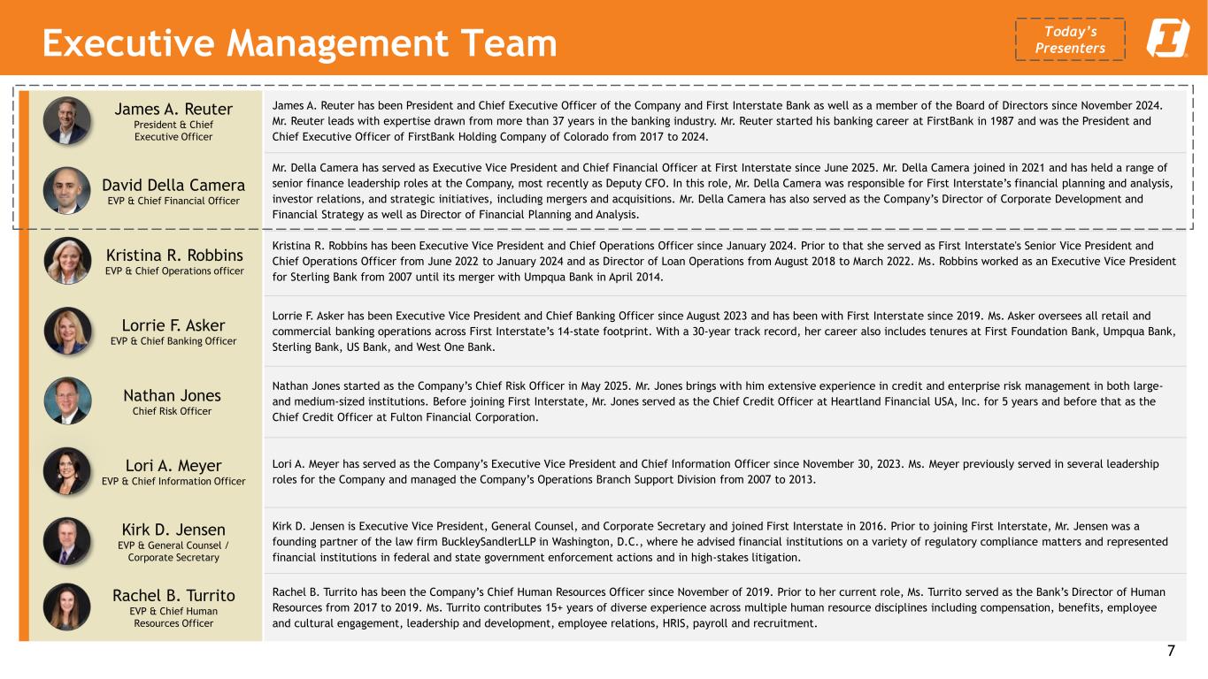 7 Rachel B. Turrito has been the Company’s Chief Human Resources Officer since November of 2019. Prior to her current role, Ms. Turrito served as the Bank’s Director of Human Resources from 2017 to 2019. Ms. Turrito contributes 15+ years of diverse experience across multiple human resource disciplines including compensation, benefits, employee and cultural engagement, leadership and development, employee relations, HRIS, payroll and recruitment. Nathan Jones started as the Company’s Chief Risk Officer in May 2025. Mr. Jones brings with him extensive experience in credit and enterprise risk management in both large- and medium-sized institutions. Before joining First Interstate, Mr. Jones served as the Chief Credit Officer at Heartland Financial USA, Inc. for 5 years and before that as the Chief Credit Officer at Fulton Financial Corporation. James A. Reuter President & Chief Executive Officer James A. Reuter has been President and Chief Executive Officer of the Company and First Interstate Bank as well as a member of the Board of Directors since November 2024. Mr. Reuter leads with expertise drawn from more than 37 years in the banking industry. Mr. Reuter started his banking career at FirstBank in 1987 and was the President and Chief Executive Officer of FirstBank Holding Company of Colorado from 2017 to 2024. Lorrie F. Asker EVP & Chief Banking Officer Lorrie F. Asker has been Executive Vice President and Chief Banking Officer since August 2023 and has been with First Interstate since 2019. Ms. Asker oversees all retail and commercial banking operations across First Interstate’s 14-state footprint. With a 30-year track record, her career also includes tenures at First Foundation Bank, Umpqua Bank, Sterling Bank, US Bank, and West One Bank. Kirk D. Jensen EVP & General Counsel / Corporate Secretary Kirk D. Jensen is Executive Vice President, General Counsel, and Corporate Secretary and joined First Interstate in 2016. Prior to joining First Interstate, Mr. Jensen was a founding partner of the law firm BuckleySandlerLLP in Washington, D.C., where he advised financial institutions on a variety of regulatory compliance matters and represented financial institutions in federal and state government enforcement actions and in high-stakes litigation. Lori A. Meyer EVP & Chief Information Officer Lori A. Meyer has served as the Company’s Executive Vice President and Chief Information Officer since November 30, 2023. Ms. Meyer previously served in several leadership roles for the Company and managed the Company’s Operations Branch Support Division from 2007 to 2013. Executive Management Team Kristina R. Robbins EVP & Chief Operations officer Kristina R. Robbins has been Executive Vice President and Chief Operations Officer since January 2024. Prior to that she served as First Interstate's Senior Vice President and Chief Operations Officer from June 2022 to January 2024 and as Director of Loan Operations from August 2018 to March 2022. Ms. Robbins worked as an Executive Vice President for Sterling Bank from 2007 until its merger with Umpqua Bank in April 2014. Rachel B. Turrito EVP & Chief Human Resources Officer David Della Camera EVP & Chief Financial Officer Mr. Della Camera has served as Executive Vice President and Chief Financial Officer at First Interstate since June 2025. Mr. Della Camera joined in 2021 and has held a range of senior finance leadership roles at the Company, most recently as Deputy CFO. In this role, Mr. Della Camera was responsible for First Interstate’s financial planning and analysis, investor relations, and strategic initiatives, including mergers and acquisitions. Mr. Della Camera has also served as the Company’s Director of Corporate Development and Financial Strategy as well as Director of Financial Planning and Analysis. Nathan Jones Chief Risk Officer Today’s Presenters