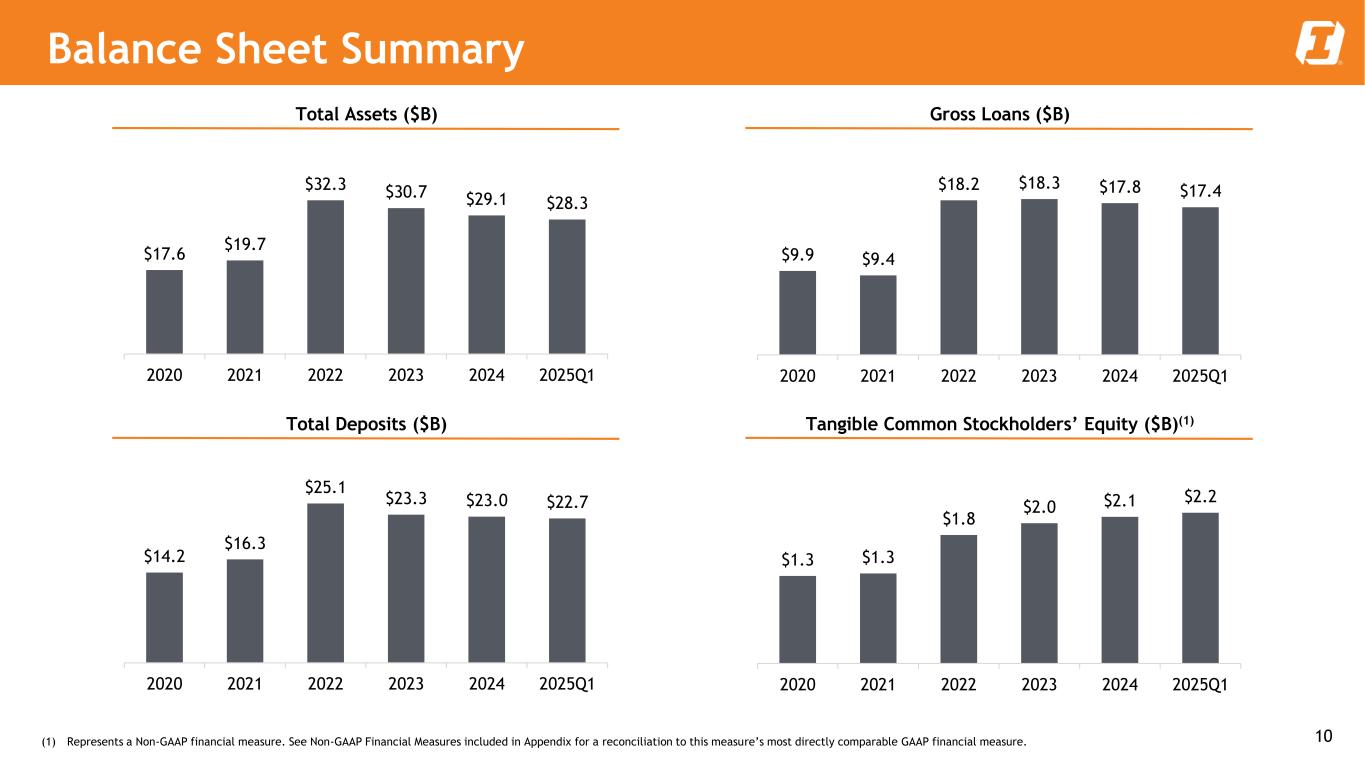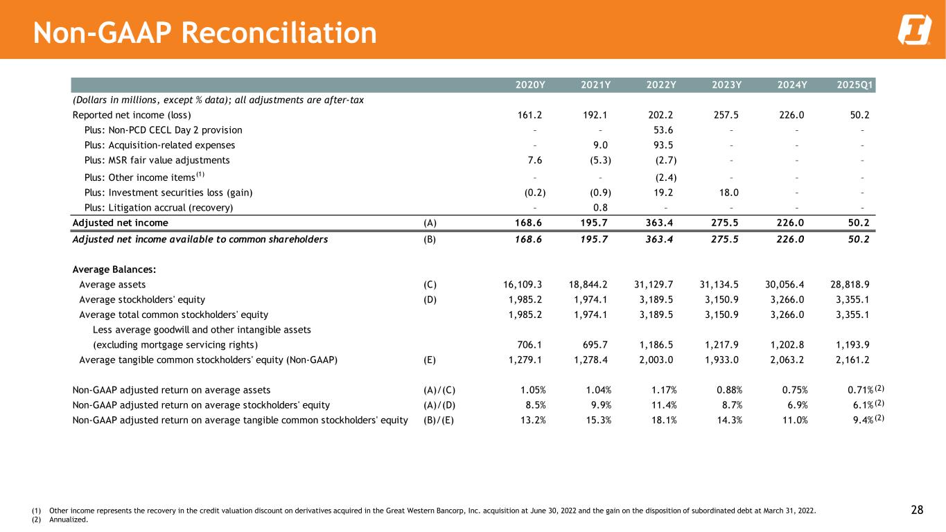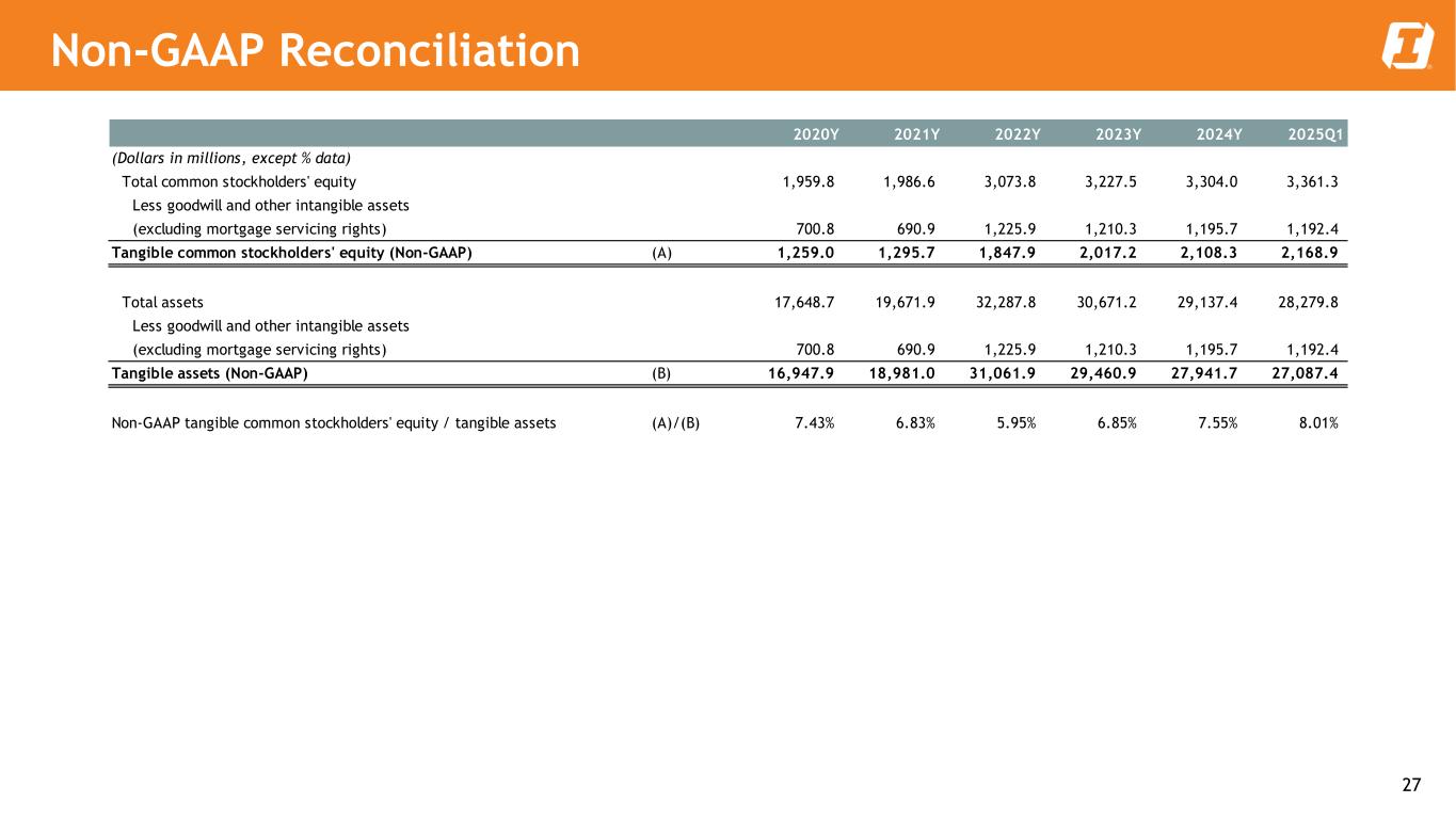 27 Non-GAAP Reconciliation 2020Y 2021Y 2022Y 2023Y 2024Y 2025Q1 (Dollars in millions, except % data) Total common stockholders' equity 1,959.8 1,986.6 3,073.8 3,227.5 3,304.0 3,361.3 Less goodwill and other intangible assets (excluding mortgage servicing rights) 700.8 690.9 1,225.9 1,210.3 1,195.7 1,192.4 Tangible common stockholders' equity (Non-GAAP) (A) 1,259.0 1,295.7 1,847.9 2,017.2 2,108.3 2,168.9 Total assets 17,648.7 19,671.9 32,287.8 30,671.2 29,137.4 28,279.8 Less goodwill and other intangible assets (excluding mortgage servicing rights) 700.8 690.9 1,225.9 1,210.3 1,195.7 1,192.4 Tangible assets (Non-GAAP) (B) 16,947.9 18,981.0 31,061.9 29,460.9 27,941.7 27,087.4 Non-GAAP tangible common stockholders' equity / tangible assets (A)/(B) 7.43% 6.83% 5.95% 6.85% 7.55% 8.01%