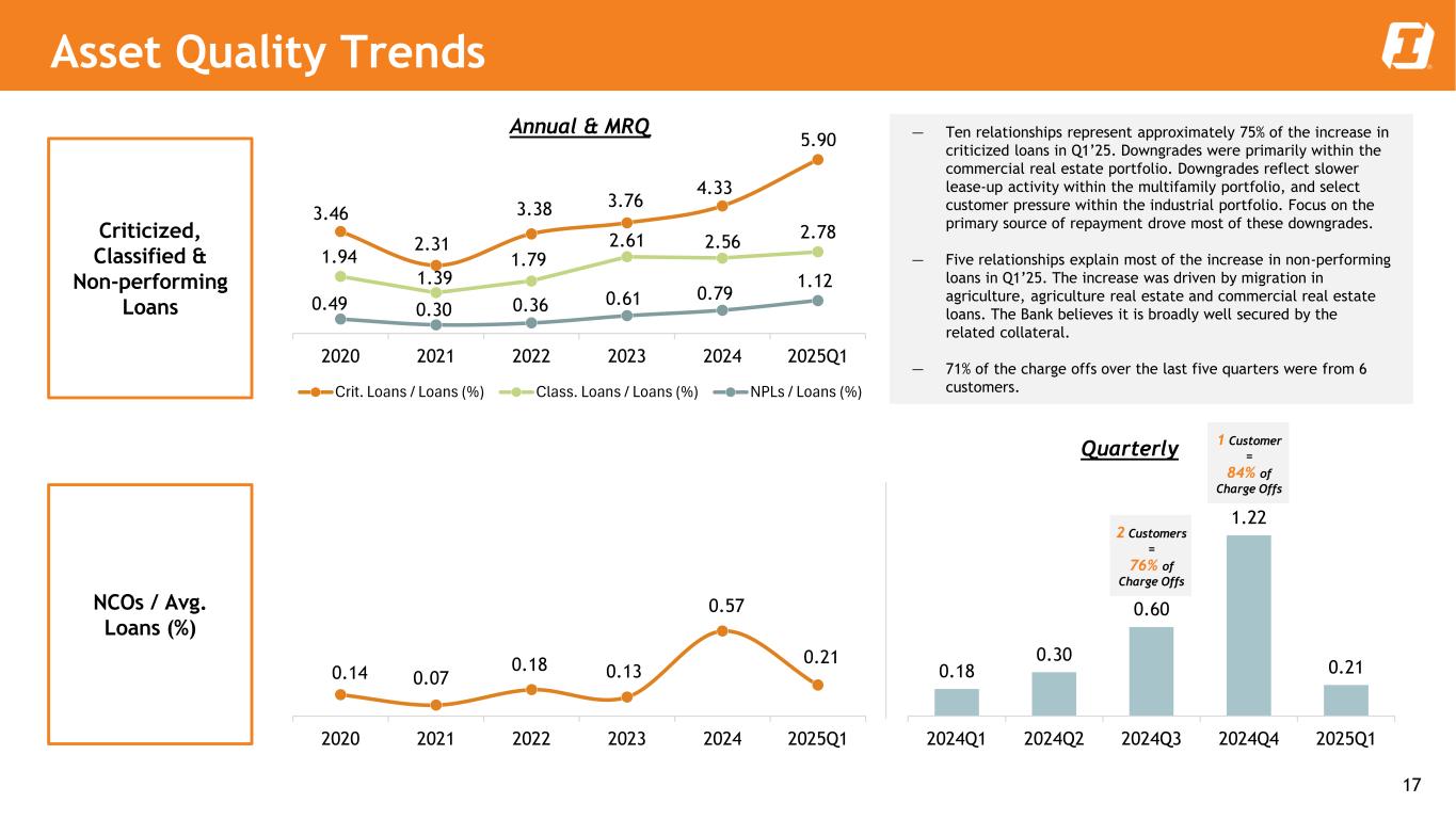 16 Loan Portfolio Detail 87% 8% 5% Non-Metro Mid-Metro Metro Multifamily 24% Medical 11% Retail 21% Industrial/Warehouse 18% Office 10% Hotel 9% Land & Development 2% Other CRE 3% Residential 1-4 Family 2% $10.3B CRE Loans 59% CRE / Total Loans 36% NOO CRE(2) / Total Loans 268% Reg. CRE / TRBC(3) 4% Top 20 CRE Loans / Total Loans Commercial Real Estate & Construction Portfolio Commercial and Industrial Portfolio Agriculture Portfolio(4) Note: Financial data as of 3/31/2025. (1) Metro defined as property located in Portland, Seattle, Denver, Phoenix, Minneapolis / St. Paul, and Kansas City; Mid-metro defined as Omaha, Des Moines, Tucson, and Boise. Non-metro defined as all other areas. (2) Non-owner occupied commercial real estate (NOO CRE). (3) Presented at the bank level; commercial real estate per definition in regulatory guidance; includes non-owner occupied real estate, multifamily loans, construction and development loans and loans to finance commercial real estate, construction and land development activities not secured by real estate; excludes owner occupied CRE. (4) Includes agriculture real estate loans. $2.8B C&I Loans $0.2M Avg. C&I Loan Size 4% Top 20 C&I Rel. / Total Loans $0.2M Avg. Ag. Loan Size $1.3B Ag. Loans 1% Top 20 Ag. Loans / Total Loans Commercial 16% Agriculture 4% Agriculture RE 4% 17% Largest State CRE Concentration / Total CRE $1.4M Average CRE Loan Size (Property and Market Type(1))