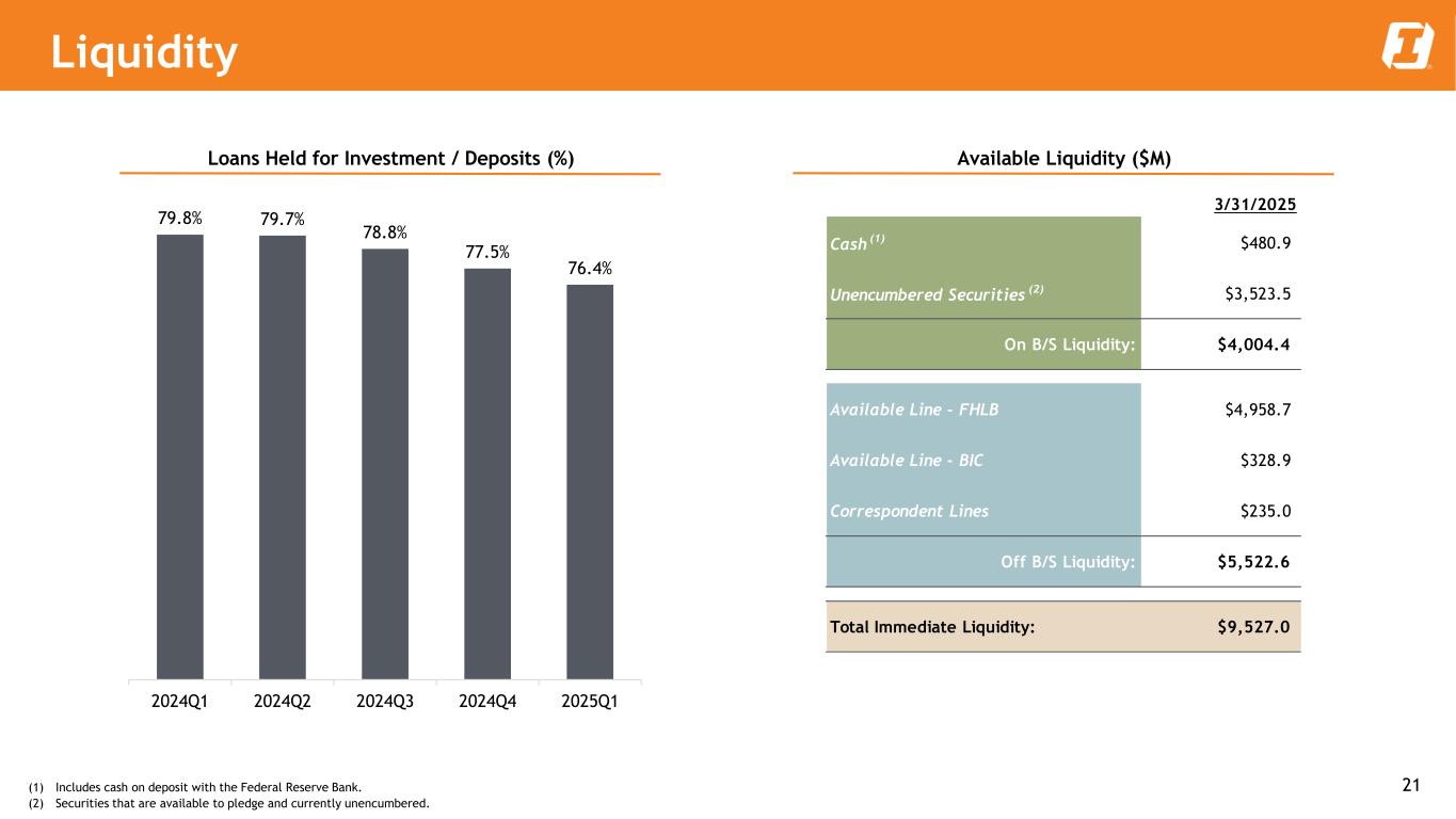 20 1.39% 1.42% 1.47% 1.41% 1.34% 2.28% 2.33% 2.40% 2.26% 2.08% 2024Q1 2024Q2 2024Q3 2024Q4 2025Q1 FIBK Peer Median MT 25% WY 13% ID 7% WA 3% OR 11% SD 15% NE 9% IA 9% MO 1% AZ 3% CO 4% 54% 52% 52% 53% 54% 46% 48% 48% 47% 46% 2024Q1 2024Q2 2024Q3 2024Q4 2025Q1 Total Consumer Deposits Total Business Deposits 26% 26% 26% 26% 25% 27% 27% 27% 28% 28% 34% 34% 34% 34% 34% 13% 13% 13% 12% 13% 2024Q1 2024Q2 2024Q3 2024Q4 2025Q1 Non-interest bearing Demand Savings Time Mix of Consumer and Business DepositsDeposits by State Average Deposit Balance Diverse, Low Cost & Core Deposit Base Cost of Deposits Note: Data not shown pro forma for recently announced sale of Arizona and Kansas branches. See press release published April 28, 2025 on FIBK’s investor relations site at www.fibk.com. (1) Peers include nationwide public banks with total assets between $20 billion and $50 billion. Peer data per S&P Capital IQ Pro. (1)