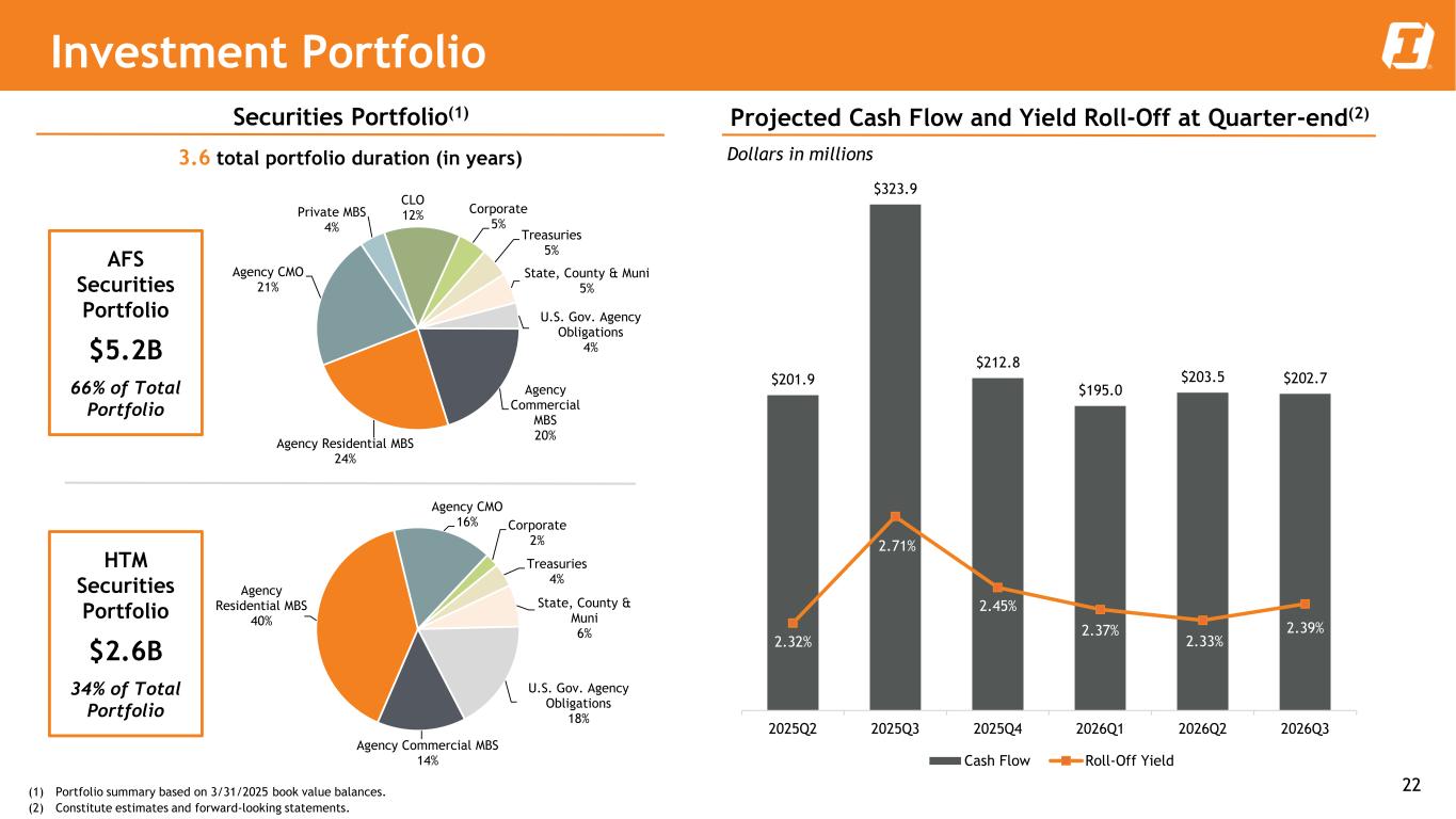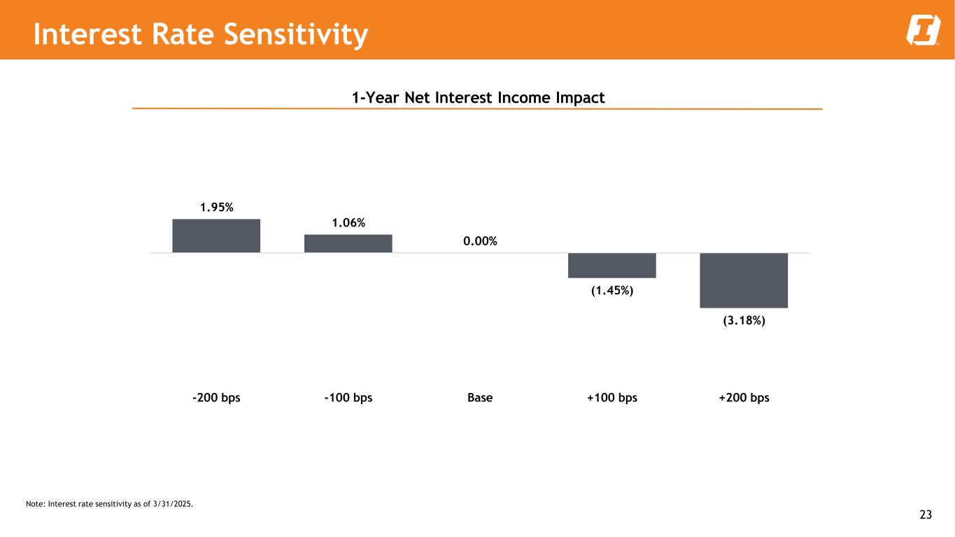 22 $201.9 $323.9 $212.8 $195.0 $203.5 $202.7 2.32% 2.71% 2.45% 2.37% 2.33% 2.39% 2025Q2 2025Q3 2025Q4 2026Q1 2026Q2 2026Q3 Cash Flow Roll-Off Yield Projected Cash Flow and Yield Roll-Off at Quarter-end(2) AFS Securities Portfolio $5.2B 66% of Total Portfolio (1) Portfolio summary based on 3/31/2025 book value balances. (2) Constitute estimates and forward-looking statements. Investment Portfolio Securities Portfolio(1) Dollars in millions3.6 total portfolio duration (in years) Treasuries 5% State, County & Muni 5% U.S. Gov. Agency Obligations 4% Agency Commercial MBS 20% Agency Residential MBS 24% Agency CMO 21% Private MBS 4% CLO 12% Corporate 5% Treasuries 4% State, County & Muni 6% U.S. Gov. Agency Obligations 18% Agency Commercial MBS 14% Agency Residential MBS 40% Agency CMO 16% Corporate 2% HTM Securities Portfolio $2.6B 34% of Total Portfolio