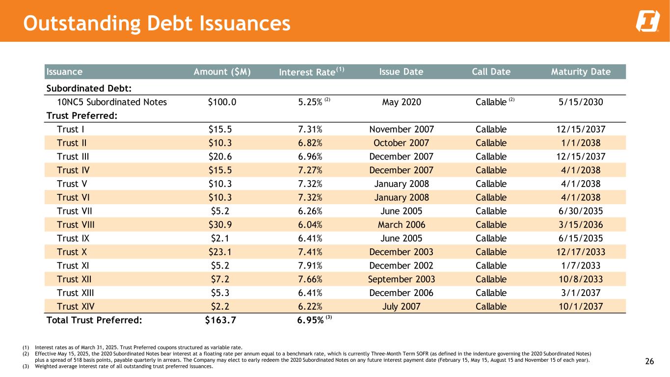 26 Issuance Amount ($M) Interest Rate(1) Issue Date Call Date Maturity Date Subordinated Debt: 10NC5 Subordinated Notes $100.0 5.25% May 2020 Callable 5/15/2030 Trust Preferred: Trust I $15.5 7.31% November 2007 Callable 12/15/2037 Trust II $10.3 6.82% October 2007 Callable 1/1/2038 Trust III $20.6 6.96% December 2007 Callable 12/15/2037 Trust IV $15.5 7.27% December 2007 Callable 4/1/2038 Trust V $10.3 7.32% January 2008 Callable 4/1/2038 Trust VI $10.3 7.32% January 2008 Callable 4/1/2038 Trust VII $5.2 6.26% June 2005 Callable 6/30/2035 Trust VIII $30.9 6.04% March 2006 Callable 3/15/2036 Trust IX $2.1 6.41% June 2005 Callable 6/15/2035 Trust X $23.1 7.41% December 2003 Callable 12/17/2033 Trust XI $5.2 7.91% December 2002 Callable 1/7/2033 Trust XII $7.2 7.66% September 2003 Callable 10/8/2033 Trust XIII $5.3 6.41% December 2006 Callable 3/1/2037 Trust XIV $2.2 6.22% July 2007 Callable 10/1/2037 Total Trust Preferred: $163.7 6.95% (1) Interest rates as of March 31, 2025. Trust Preferred coupons structured as variable rate. (2) Effective May 15, 2025, the 2020 Subordinated Notes bear interest at a floating rate per annum equal to a benchmark rate, which is currently Three-Month Term SOFR (as defined in the indenture governing the 2020 Subordinated Notes) plus a spread of 518 basis points, payable quarterly in arrears. The Company may elect to early redeem the 2020 Subordinated Notes on any future interest payment date (February 15, May 15, August 15 and November 15 of each year). (3) Weighted average interest rate of all outstanding trust preferred issuances. Outstanding Debt Issuances (3) (2) (2)