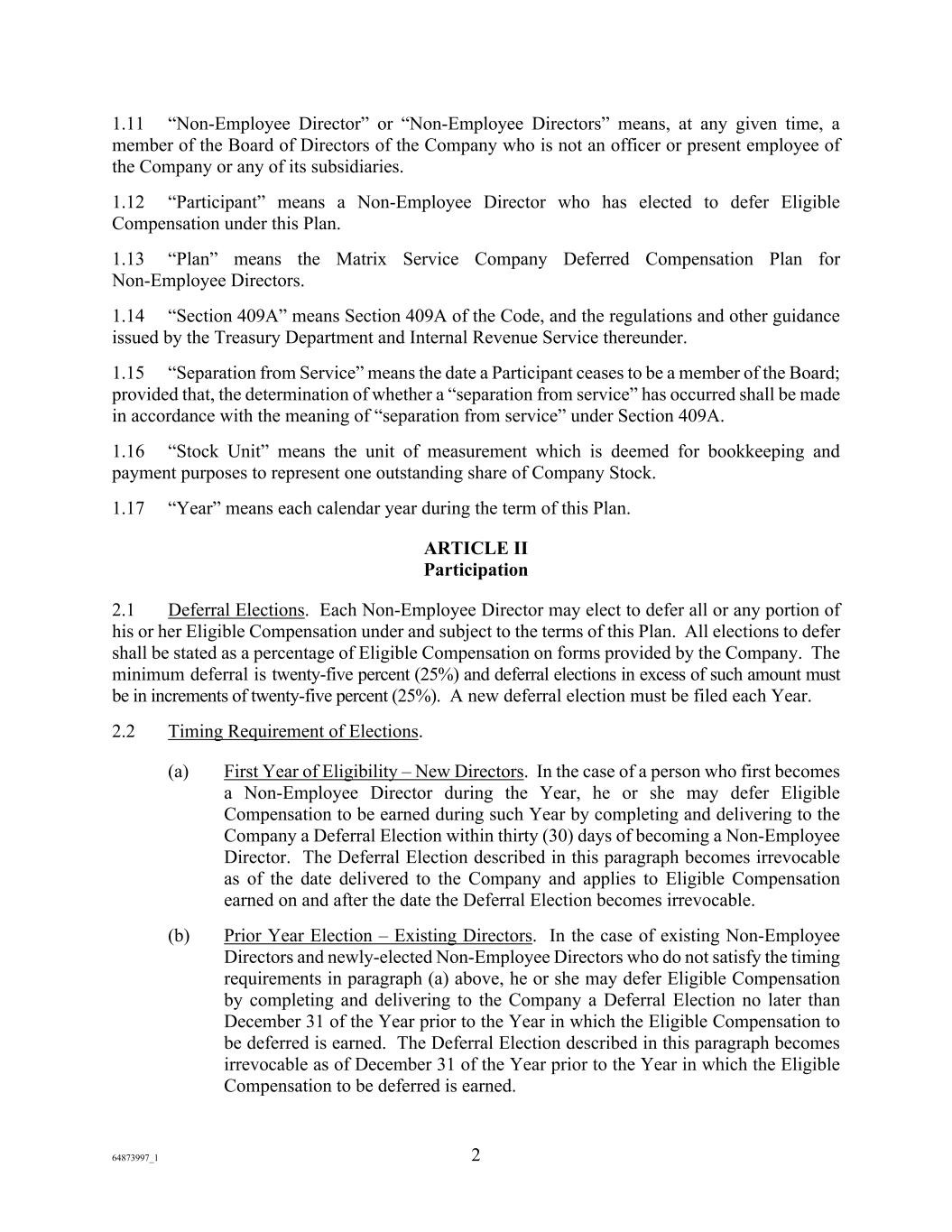 64873997_1 2 1.11 “Non-Employee Director” or “Non-Employee Directors” means, at any given time, a member of the Board of Directors of the Company who is not an officer or present employee of the Company or any of its subsidiaries. 1.12 “Participant” means a Non-Employee Director who has elected to defer Eligible Compensation under this Plan. 1.13 “Plan” means the Matrix Service Company Deferred Compensation Plan for Non-Employee Directors. 1.14 “Section 409A” means Section 409A of the Code, and the regulations and other guidance issued by the Treasury Department and Internal Revenue Service thereunder. 1.15 “Separation from Service” means the date a Participant ceases to be a member of the Board; provided that, the determination of whether a “separation from service” has occurred shall be made in accordance with the meaning of “separation from service” under Section 409A. 1.16 “Stock Unit” means the unit of measurement which is deemed for bookkeeping and payment purposes to represent one outstanding share of Company Stock. 1.17 “Year” means each calendar year during the term of this Plan. ARTICLE II Participation 2.1 Deferral Elections. Each Non-Employee Director may elect to defer all or any portion of his or her Eligible Compensation under and subject to the terms of this Plan. All elections to defer shall be stated as a percentage of Eligible Compensation on forms provided by the Company. The minimum deferral is twenty-five percent (25%) and deferral elections in excess of such amount must be in increments of twenty-five percent (25%). A new deferral election must be filed each Year. 2.2 Timing Requirement of Elections. (a) First Year of Eligibility – New Directors. In the case of a person who first becomes a Non-Employee Director during the Year, he or she may defer Eligible Compensation to be earned during such Year by completing and delivering to the Company a Deferral Election within thirty (30) days of becoming a Non-Employee Director. The Deferral Election described in this paragraph becomes irrevocable as of the date delivered to the Company and applies to Eligible Compensation earned on and after the date the Deferral Election becomes irrevocable. (b) Prior Year Election – Existing Directors. In the case of existing Non-Employee Directors and newly-elected Non-Employee Directors who do not satisfy the timing requirements in paragraph (a) above, he or she may defer Eligible Compensation by completing and delivering to the Company a Deferral Election no later than December 31 of the Year prior to the Year in which the Eligible Compensation to be deferred is earned. The Deferral Election described in this paragraph becomes irrevocable as of December 31 of the Year prior to the Year in which the Eligible Compensation to be deferred is earned.