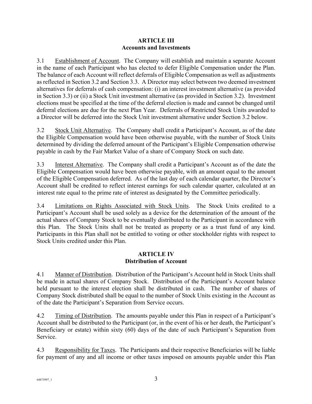 64873997_1 3 ARTICLE III Accounts and Investments 3.1 Establishment of Account. The Company will establish and maintain a separate Account in the name of each Participant who has elected to defer Eligible Compensation under the Plan. The balance of each Account will reflect deferrals of Eligible Compensation as well as adjustments as reflected in Section 3.2 and Section 3.3. A Director may select between two deemed investment alternatives for deferrals of cash compensation: (i) an interest investment alternative (as provided in Section 3.3) or (ii) a Stock Unit investment alternative (as provided in Section 3.2). Investment elections must be specified at the time of the deferral election is made and cannot be changed until deferral elections are due for the next Plan Year. Deferrals of Restricted Stock Units awarded to a Director will be deferred into the Stock Unit investment alternative under Section 3.2 below. 3.2 Stock Unit Alternative. The Company shall credit a Participant’s Account, as of the date the Eligible Compensation would have been otherwise payable, with the number of Stock Units determined by dividing the deferred amount of the Participant’s Eligible Compensation otherwise payable in cash by the Fair Market Value of a share of Company Stock on such date. 3.3 Interest Alternative. The Company shall credit a Participant’s Account as of the date the Eligible Compensation would have been otherwise payable, with an amount equal to the amount of the Eligible Compensation deferred. As of the last day of each calendar quarter, the Director’s Account shall be credited to reflect interest earnings for such calendar quarter, calculated at an interest rate equal to the prime rate of interest as designated by the Committee periodically. 3.4 Limitations on Rights Associated with Stock Units. The Stock Units credited to a Participant’s Account shall be used solely as a device for the determination of the amount of the actual shares of Company Stock to be eventually distributed to the Participant in accordance with this Plan. The Stock Units shall not be treated as property or as a trust fund of any kind. Participants in this Plan shall not be entitled to voting or other stockholder rights with respect to Stock Units credited under this Plan. ARTICLE IV Distribution of Account 4.1 Manner of Distribution. Distribution of the Participant’s Account held in Stock Units shall be made in actual shares of Company Stock. Distribution of the Participant’s Account balance held pursuant to the interest election shall be distributed in cash. The number of shares of Company Stock distributed shall be equal to the number of Stock Units existing in the Account as of the date the Participant’s Separation from Service occurs. 4.2 Timing of Distribution. The amounts payable under this Plan in respect of a Participant’s Account shall be distributed to the Participant (or, in the event of his or her death, the Participant’s Beneficiary or estate) within sixty (60) days of the date of such Participant’s Separation from Service. 4.3 Responsibility for Taxes. The Participants and their respective Beneficiaries will be liable for payment of any and all income or other taxes imposed on amounts payable under this Plan
