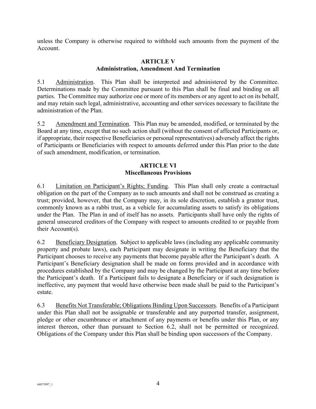 64873997_1 4 unless the Company is otherwise required to withhold such amounts from the payment of the Account. ARTICLE V Administration, Amendment And Termination 5.1 Administration. This Plan shall be interpreted and administered by the Committee. Determinations made by the Committee pursuant to this Plan shall be final and binding on all parties. The Committee may authorize one or more of its members or any agent to act on its behalf, and may retain such legal, administrative, accounting and other services necessary to facilitate the administration of the Plan. 5.2 Amendment and Termination. This Plan may be amended, modified, or terminated by the Board at any time, except that no such action shall (without the consent of affected Participants or, if appropriate, their respective Beneficiaries or personal representatives) adversely affect the rights of Participants or Beneficiaries with respect to amounts deferred under this Plan prior to the date of such amendment, modification, or termination. ARTICLE VI Miscellaneous Provisions 6.1 Limitation on Participant’s Rights; Funding. This Plan shall only create a contractual obligation on the part of the Company as to such amounts and shall not be construed as creating a trust; provided, however, that the Company may, in its sole discretion, establish a grantor trust, commonly known as a rabbi trust, as a vehicle for accumulating assets to satisfy its obligations under the Plan. The Plan in and of itself has no assets. Participants shall have only the rights of general unsecured creditors of the Company with respect to amounts credited to or payable from their Account(s). 6.2 Beneficiary Designation. Subject to applicable laws (including any applicable community property and probate laws), each Participant may designate in writing the Beneficiary that the Participant chooses to receive any payments that become payable after the Participant’s death. A Participant’s Beneficiary designation shall be made on forms provided and in accordance with procedures established by the Company and may be changed by the Participant at any time before the Participant’s death. If a Participant fails to designate a Beneficiary or if such designation is ineffective, any payment that would have otherwise been made shall be paid to the Participant’s estate. 6.3 Benefits Not Transferable; Obligations Binding Upon Successors. Benefits of a Participant under this Plan shall not be assignable or transferable and any purported transfer, assignment, pledge or other encumbrance or attachment of any payments or benefits under this Plan, or any interest thereon, other than pursuant to Section 6.2, shall not be permitted or recognized. Obligations of the Company under this Plan shall be binding upon successors of the Company.