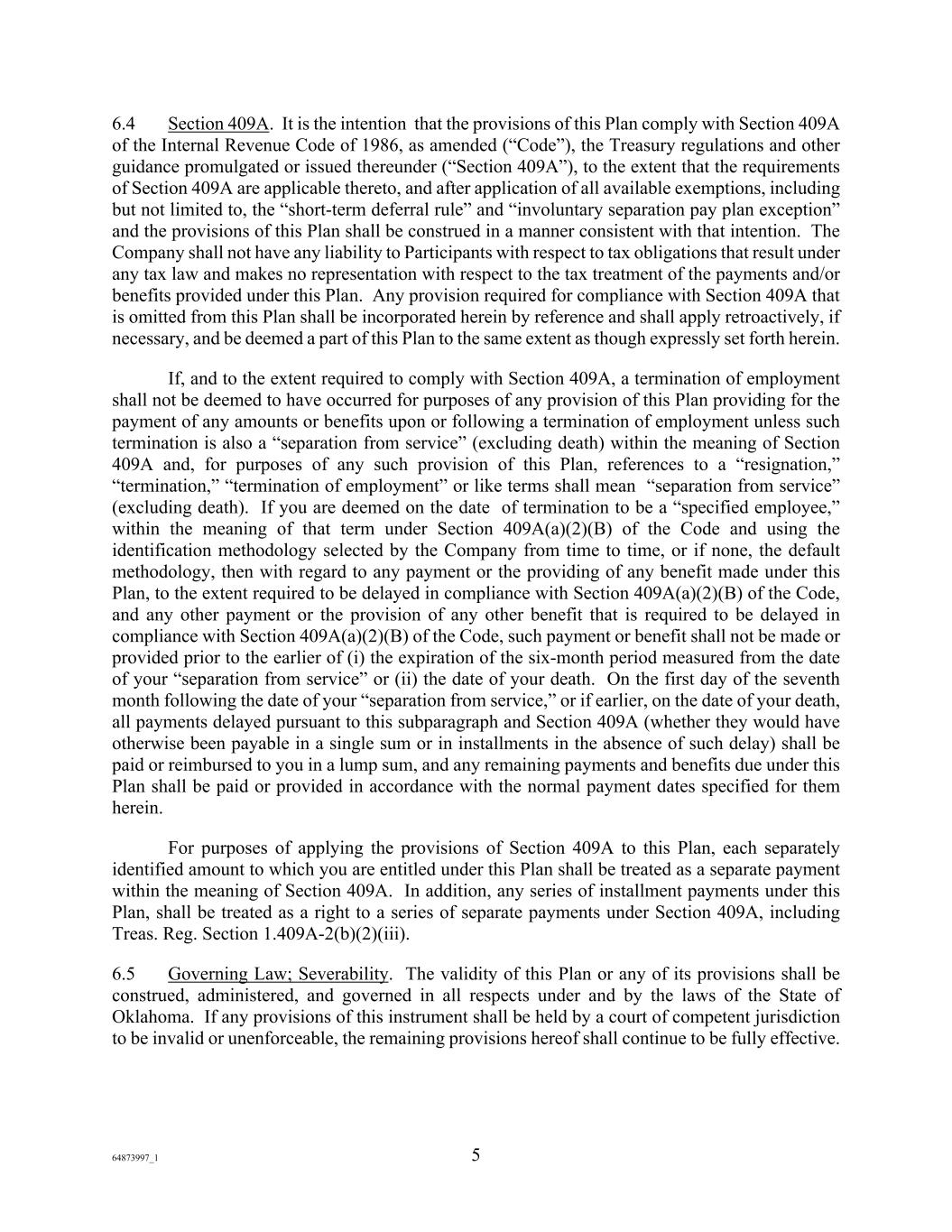 64873997_1 5 6.4 Section 409A. It is the intention that the provisions of this Plan comply with Section 409A of the Internal Revenue Code of 1986, as amended (“Code”), the Treasury regulations and other guidance promulgated or issued thereunder (“Section 409A”), to the extent that the requirements of Section 409A are applicable thereto, and after application of all available exemptions, including but not limited to, the “short-term deferral rule” and “involuntary separation pay plan exception” and the provisions of this Plan shall be construed in a manner consistent with that intention. The Company shall not have any liability to Participants with respect to tax obligations that result under any tax law and makes no representation with respect to the tax treatment of the payments and/or benefits provided under this Plan. Any provision required for compliance with Section 409A that is omitted from this Plan shall be incorporated herein by reference and shall apply retroactively, if necessary, and be deemed a part of this Plan to the same extent as though expressly set forth herein. If, and to the extent required to comply with Section 409A, a termination of employment shall not be deemed to have occurred for purposes of any provision of this Plan providing for the payment of any amounts or benefits upon or following a termination of employment unless such termination is also a “separation from service” (excluding death) within the meaning of Section 409A and, for purposes of any such provision of this Plan, references to a “resignation,” “termination,” “termination of employment” or like terms shall mean “separation from service” (excluding death). If you are deemed on the date of termination to be a “specified employee,” within the meaning of that term under Section 409A(a)(2)(B) of the Code and using the identification methodology selected by the Company from time to time, or if none, the default methodology, then with regard to any payment or the providing of any benefit made under this Plan, to the extent required to be delayed in compliance with Section 409A(a)(2)(B) of the Code, and any other payment or the provision of any other benefit that is required to be delayed in compliance with Section 409A(a)(2)(B) of the Code, such payment or benefit shall not be made or provided prior to the earlier of (i) the expiration of the six-month period measured from the date of your “separation from service” or (ii) the date of your death. On the first day of the seventh month following the date of your “separation from service,” or if earlier, on the date of your death, all payments delayed pursuant to this subparagraph and Section 409A (whether they would have otherwise been payable in a single sum or in installments in the absence of such delay) shall be paid or reimbursed to you in a lump sum, and any remaining payments and benefits due under this Plan shall be paid or provided in accordance with the normal payment dates specified for them herein. For purposes of applying the provisions of Section 409A to this Plan, each separately identified amount to which you are entitled under this Plan shall be treated as a separate payment within the meaning of Section 409A. In addition, any series of installment payments under this Plan, shall be treated as a right to a series of separate payments under Section 409A, including Treas. Reg. Section 1.409A-2(b)(2)(iii). 6.5 Governing Law; Severability. The validity of this Plan or any of its provisions shall be construed, administered, and governed in all respects under and by the laws of the State of Oklahoma. If any provisions of this instrument shall be held by a court of competent jurisdiction to be invalid or unenforceable, the remaining provisions hereof shall continue to be fully effective.
