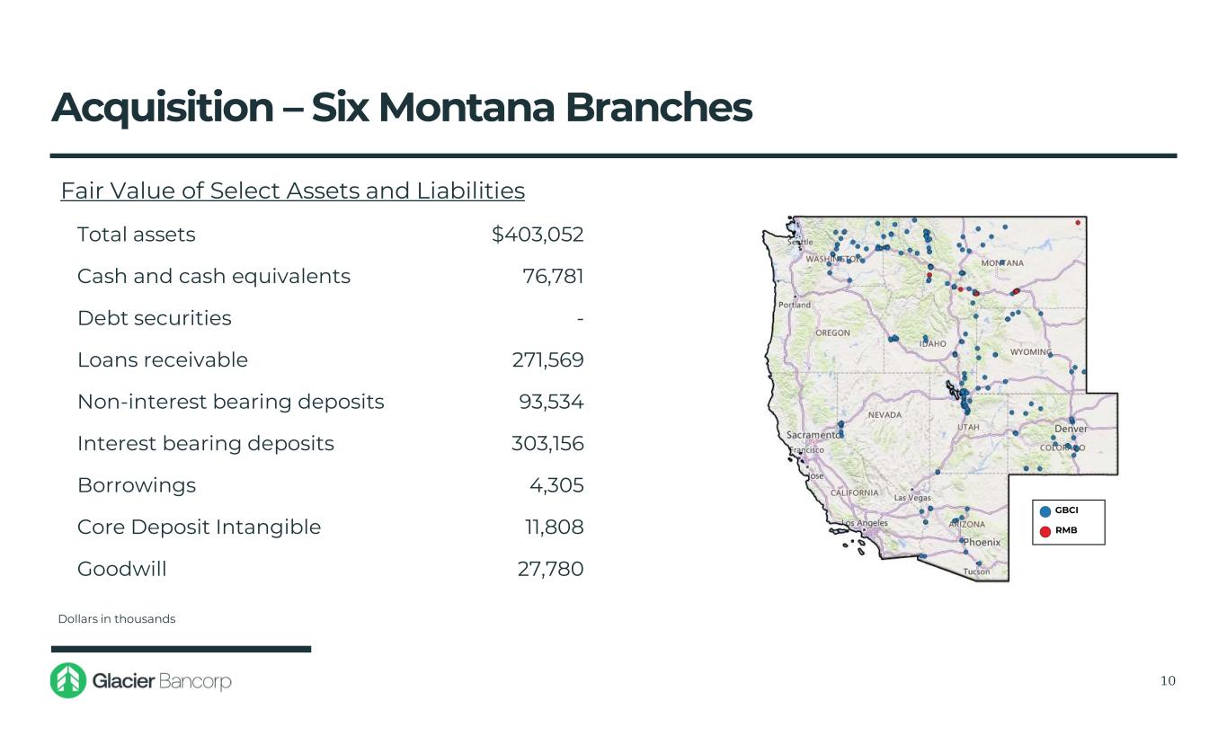 Acquisition - Six Montana Branches of HTLF Bank • On July 19, 2024, Glacier Bank completed the acquisition of six Montana branch locations of the Rocky Mountain Bank division of HTLF Bank, a wholly owned subsidiary of Heartland Financial USA, Inc. • The six branches Glacier Bank will acquire are located in : • The branches will join Glacier Bank divisions operating in Montana • At closing, the acquired branches had $272 million of loans and $397 million of deposits • Billings, MT – 2 locations • Stevensville, MT – 1 location • Bozeman, MT – 1 location • Whitehall, MT – 1 location • Plentywood, MT – 1 location Stevensvi l le , MT Plentywood, MTWhitehal l , MT Bozeman, MTBi l l ings, MT 9