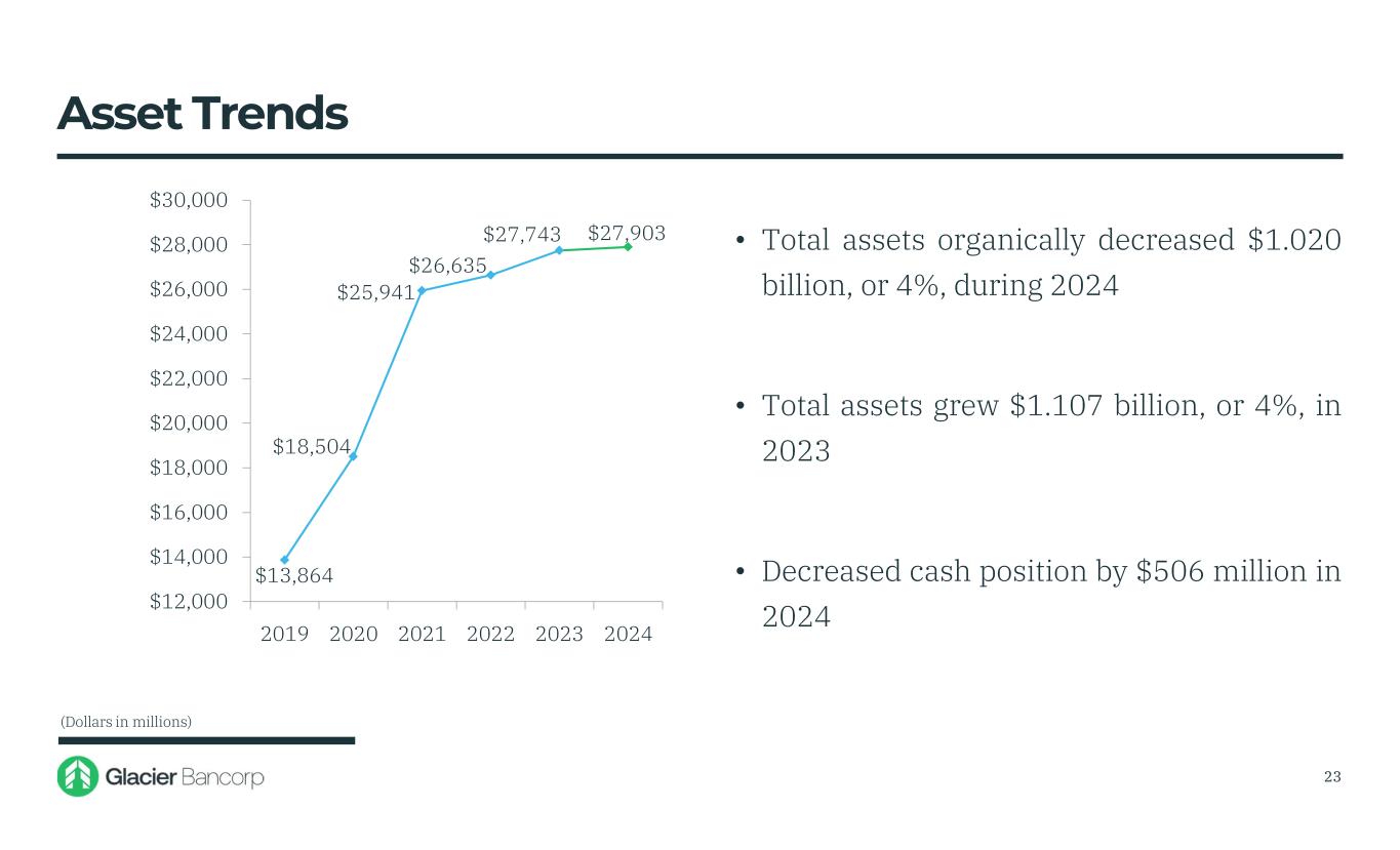 Glacier Bancorp, Inc. 12/31/2024 Snapshot Ticker GBCI Total Assets $27.90 billion Gross Loans $17.26 billion Deposits $20.55 billion TCBV Per Share $18.71 Dividends $1.32 Stock Price $50.22 Market Cap $5.70 billion 3
